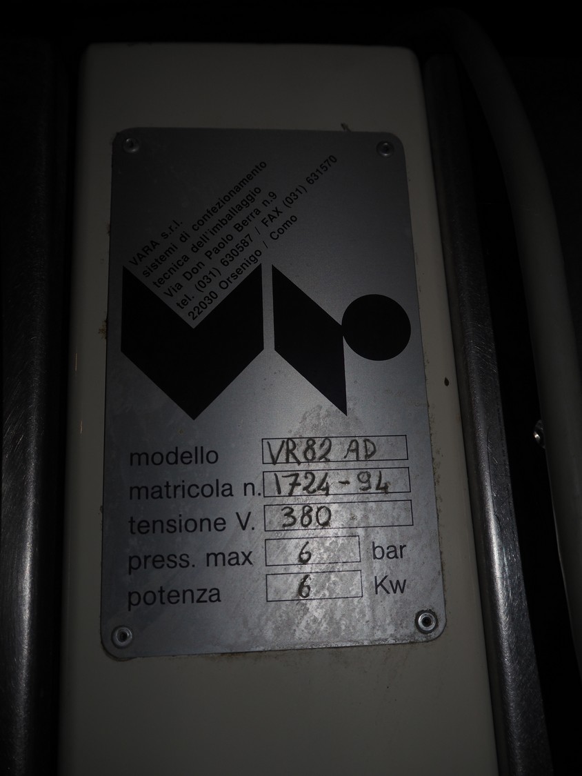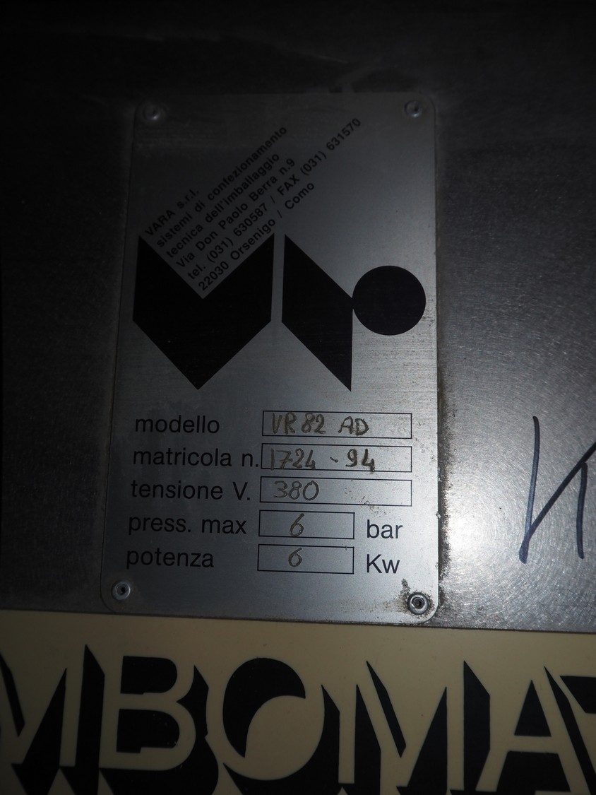 VARA s.r.l. carton erector, type: VR82AD, number: 1724-94, 380 V, 6 kW, 6 bar, dimensions: 1870 mm x 1680 mm x 2000 mm.