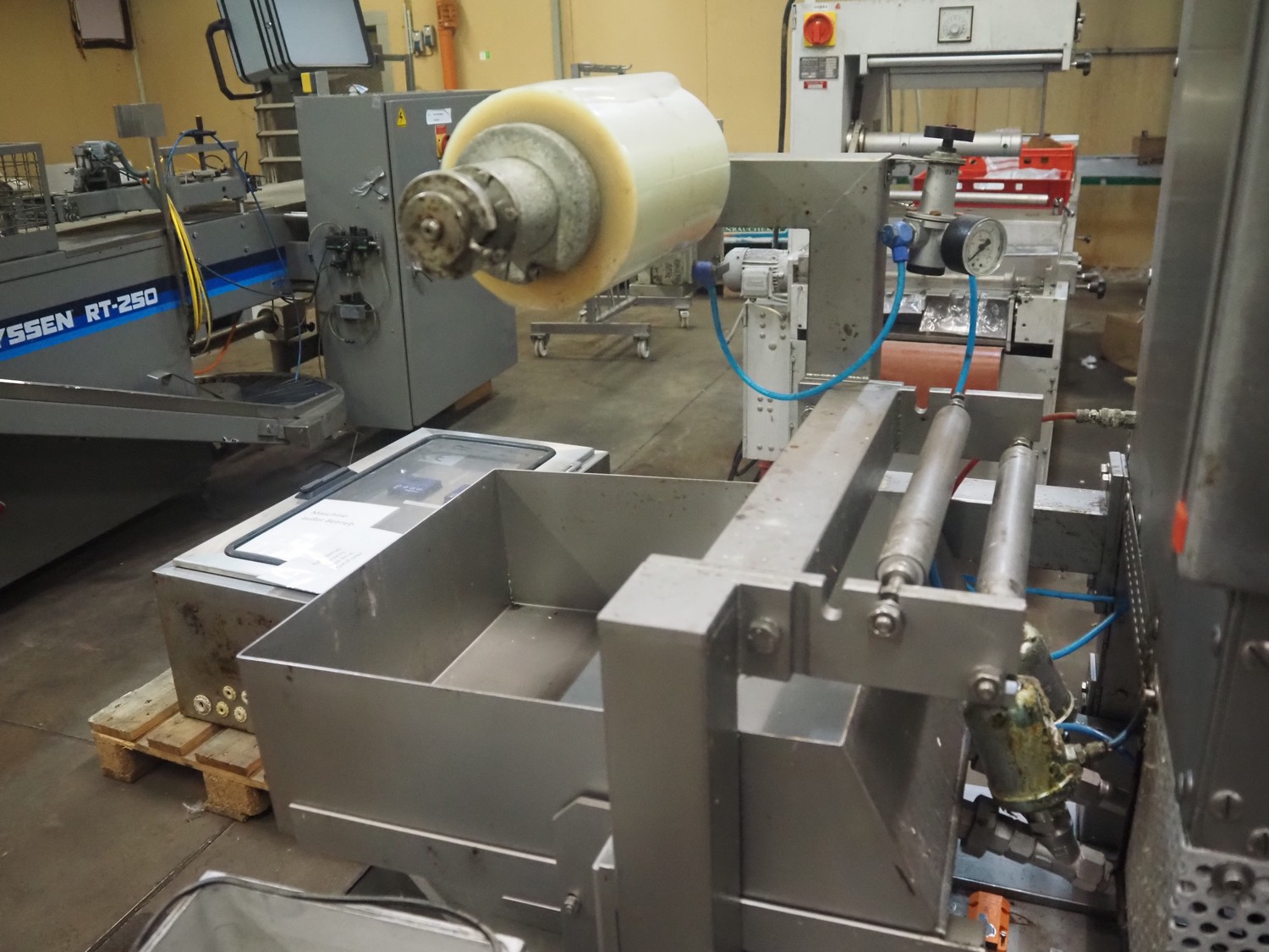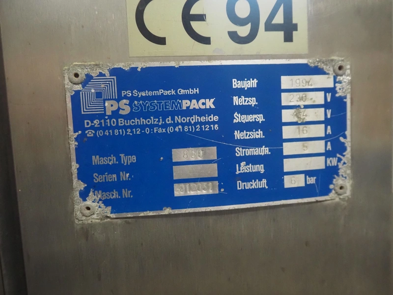 PS SystemPack traysealer, machine type: 830, machine number: 4912051, year of construction: 1994, 230 V, 16-5 A, pressure: 6 bar, film width: 205 mm, dye: (2x) 215 mm x 80 mm, total dimensions: 1600 mm x 870 mm x 1650 mm.