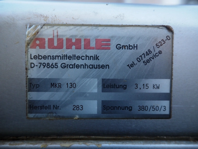 Rühle GmbH tumbler, type: MKR 130, number: 283, 380 V, 3 Ph, 50 Hz, 3.15 kW, volume: 130 liter, dimensions: 1150 mm x 750 mm x 1200 mm.