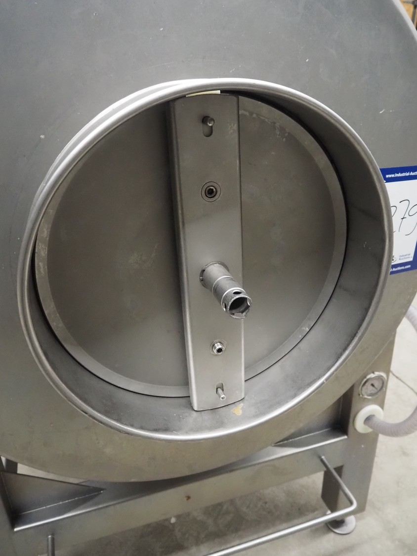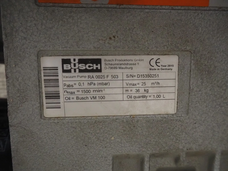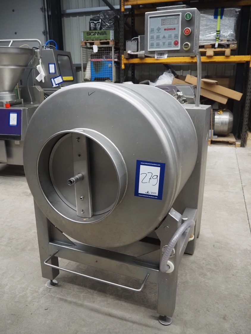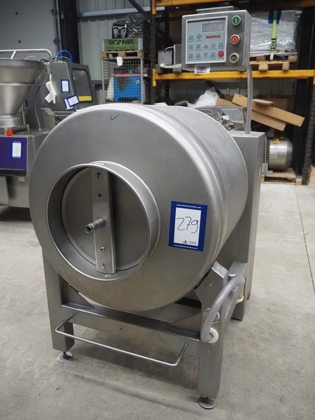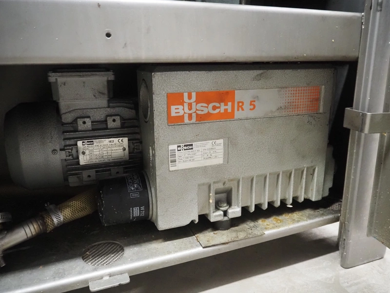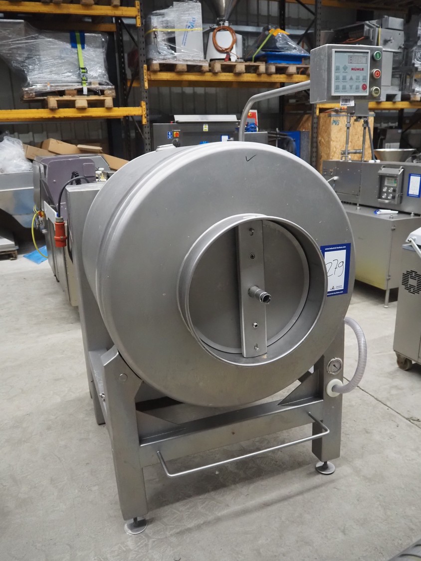 Rühle vacuum tumbler, type: HTR 600, number: 0119 G, year of construction: 2008, 400 V, 3 Ph, 50 Hz, 16 A, 2.2 kW, Busch vacuum pump, type: RA 0025 F 5030, serial number: D15350251, year of construction: 2015, capacity: 25 m³/per hour, dimensions: 1000 mm x 1400 mm x 1780 mm.