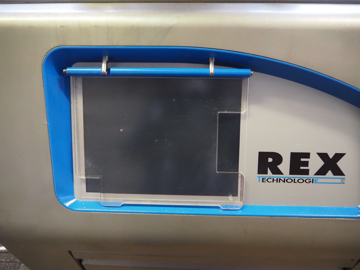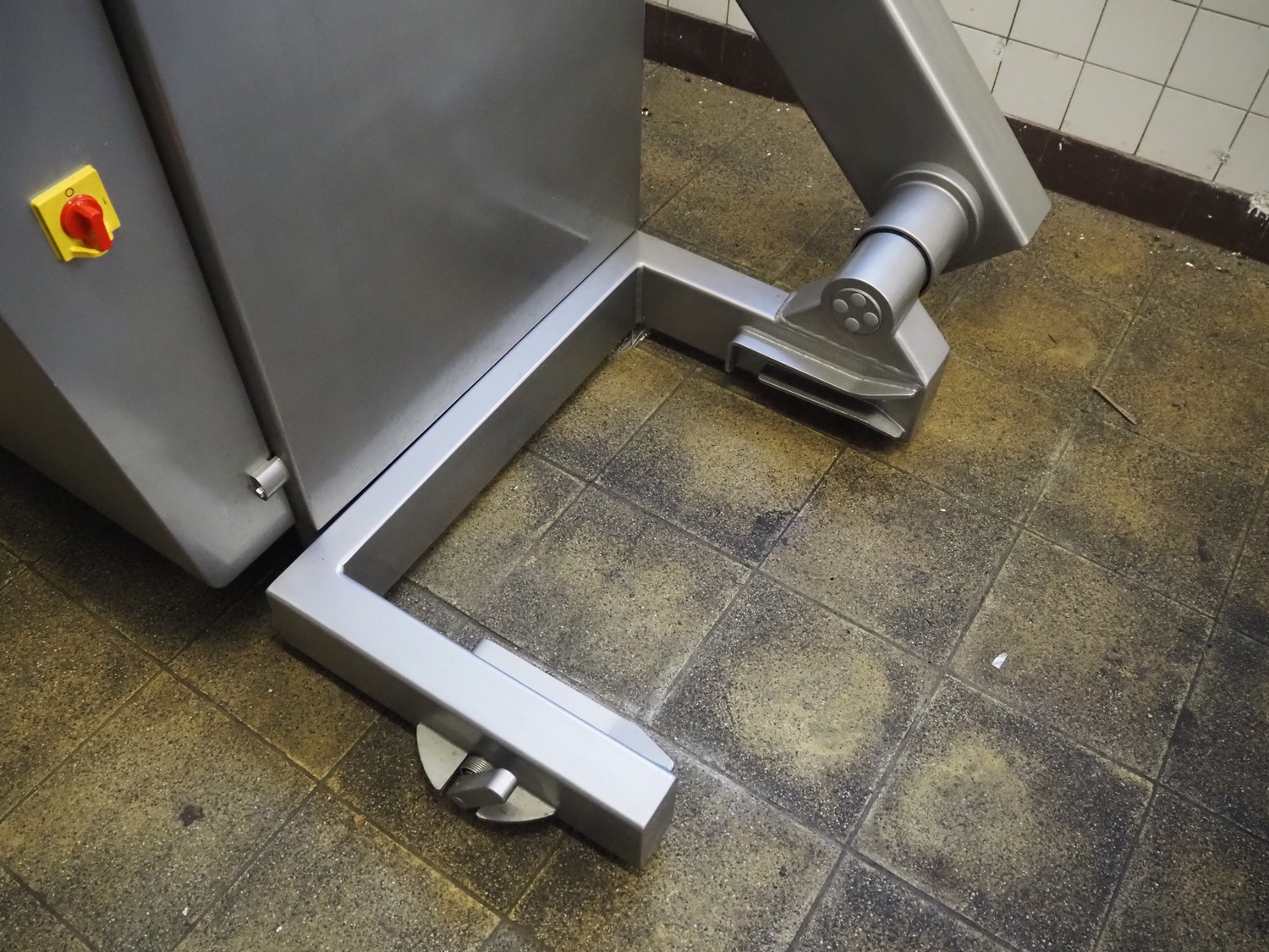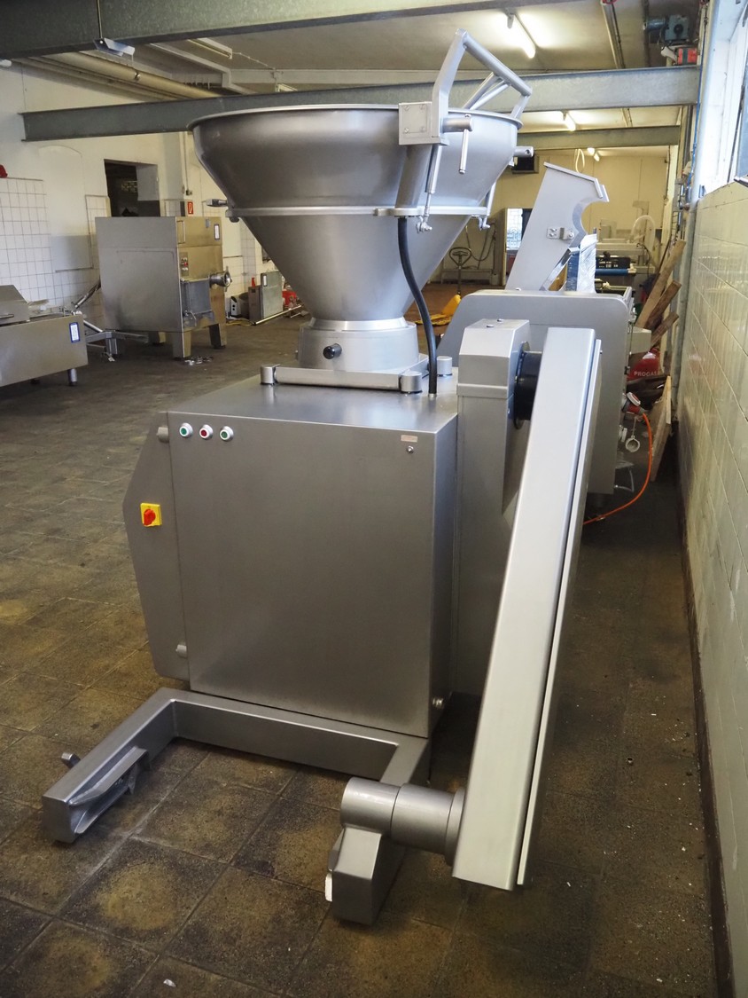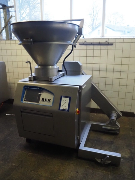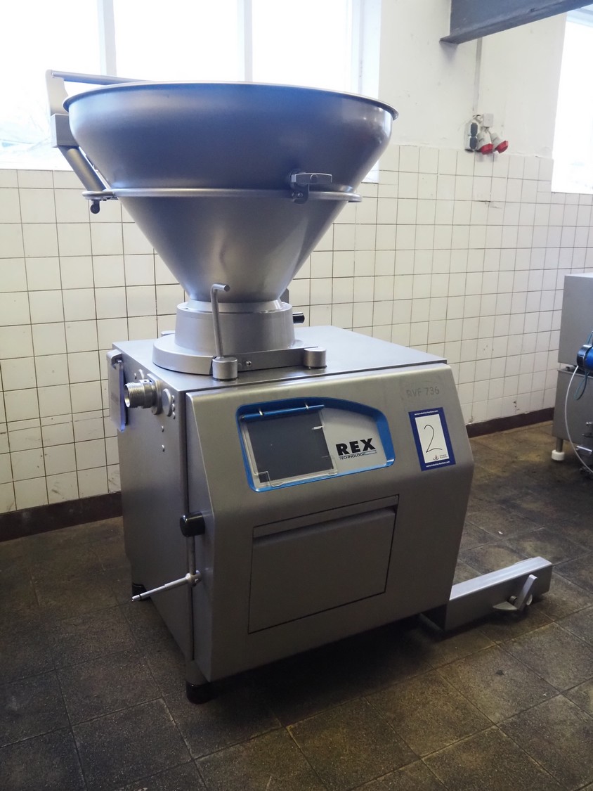 Rex Technologie vacuum filling machine with lifter for 200 liter meat bins, type: RVF 736, machine number: 73611210116, year of construction: 2018, 400 V, 3 Ph, 50/60 Hz, 35 A, 13 kW, Busch vacuum pump, type: KC 0025 F 100, serial number: D17472150, capacity: 30 m³/per hour, dimensions: 1770 mm x 1380 mm x 2060 mm.