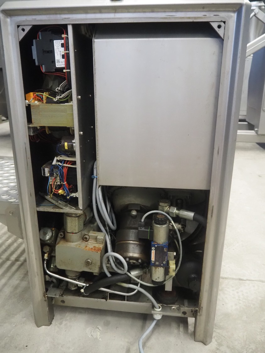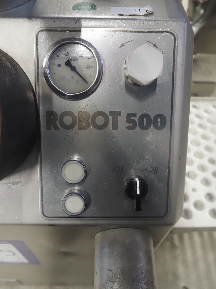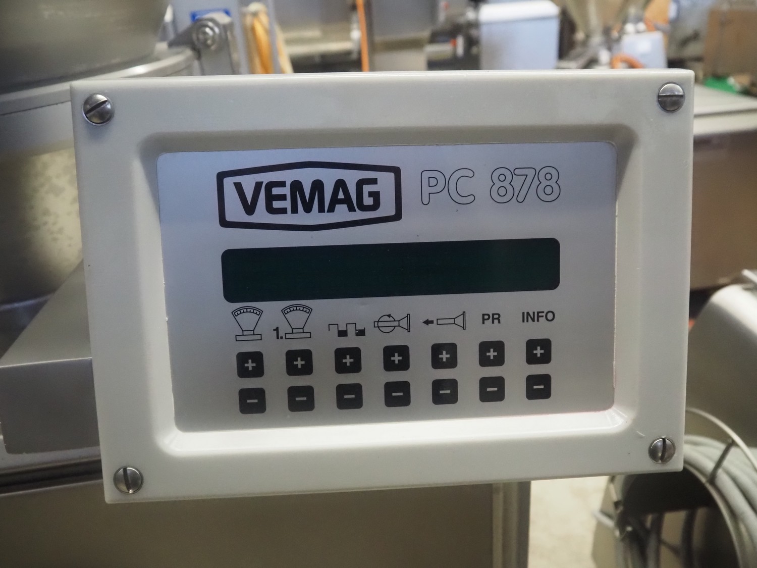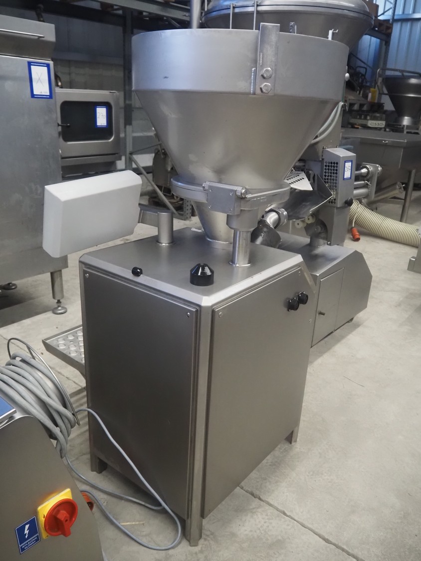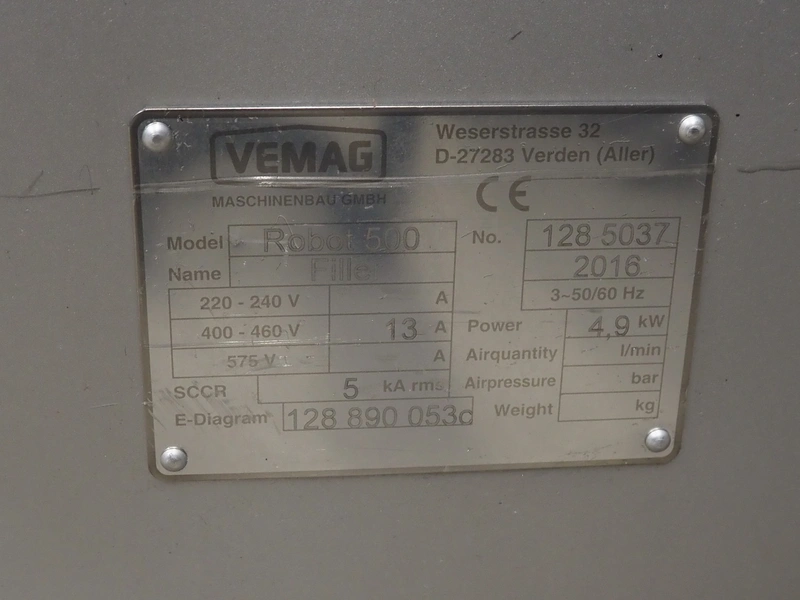 Vemag vacuum filling machine, model: Robot 500, number: 128 5037, year of construction: 2016, 400-460 V, 3 Ph, 50/60 Hz, 13 A, 4.9 kW, total dimensions: 850 mm x 750 mm x 1580 mm.