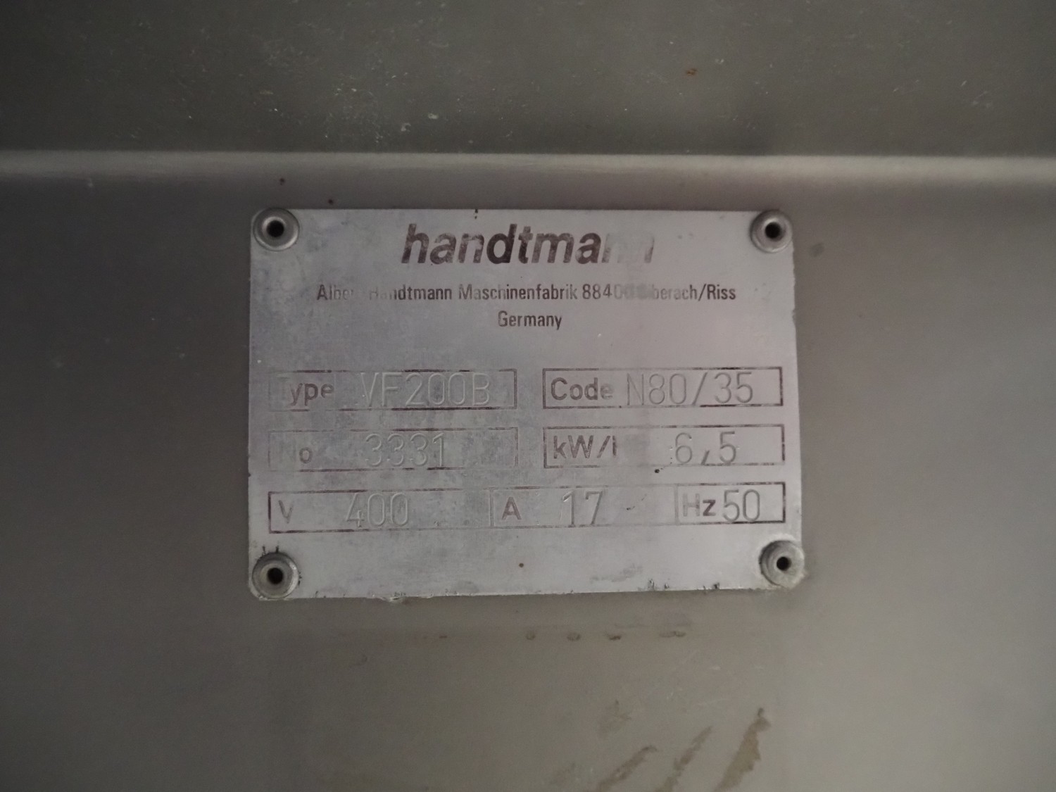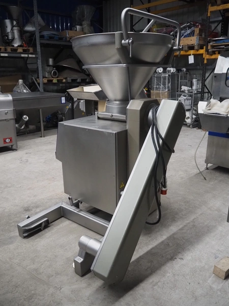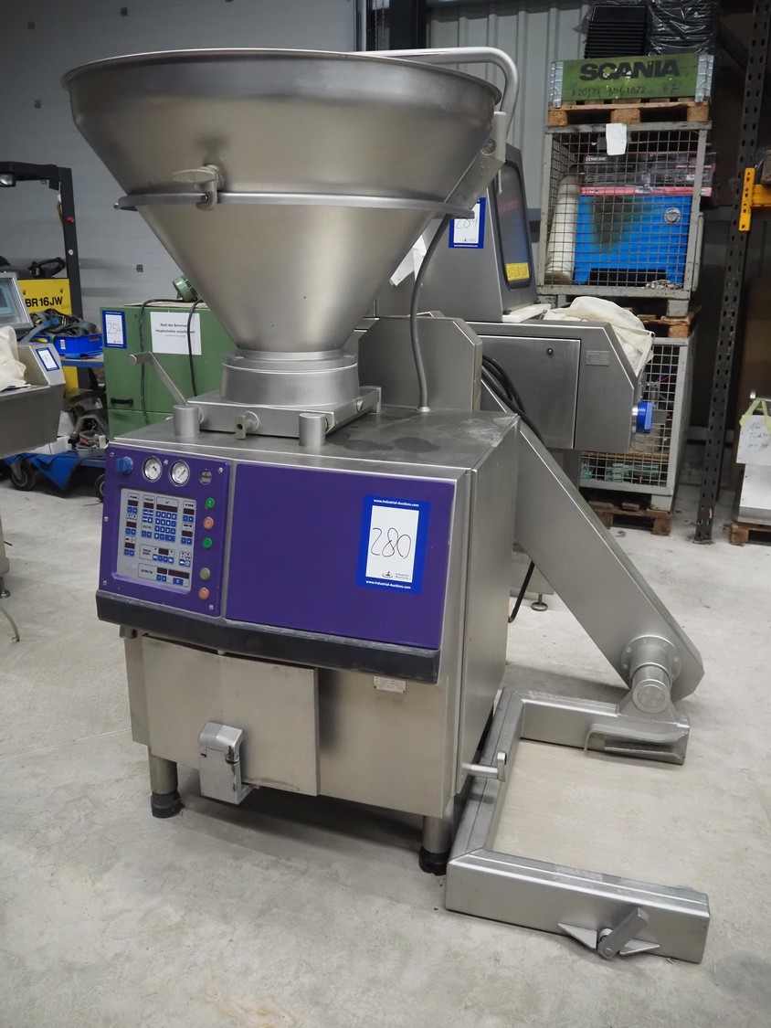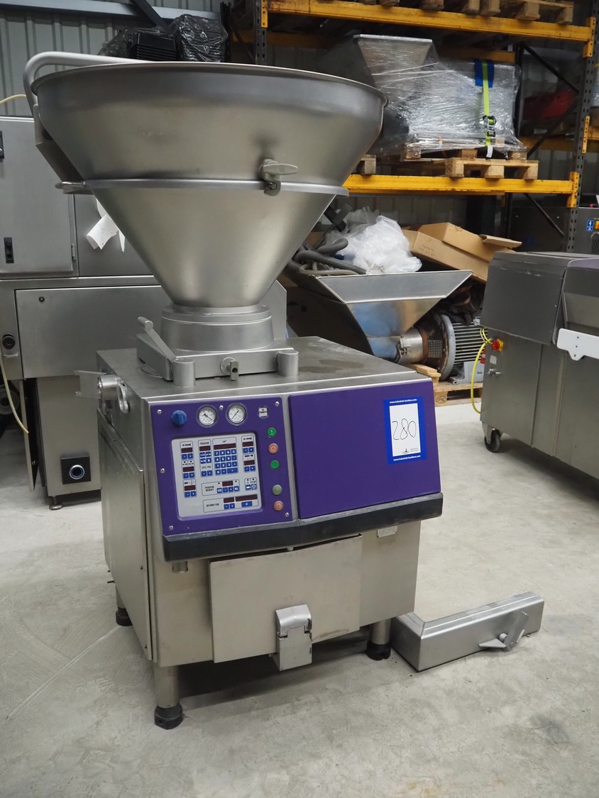 Handtmann vacuum filling machine with lifter for 200 liter meat bins, type: VF200B, number: 3331, 400 V, 50 Hz, 17 A, 6.5 kW, dimensions: 1480 mm x 1200 mm x 2080 mm.