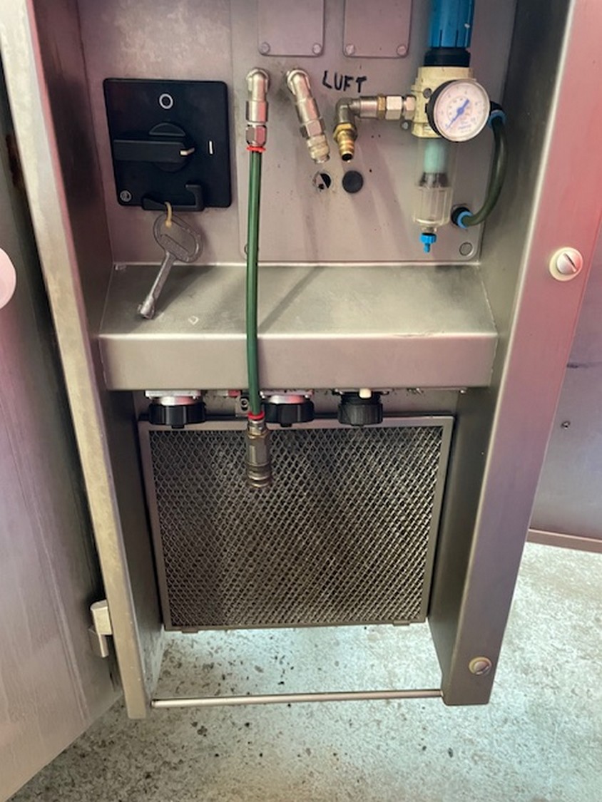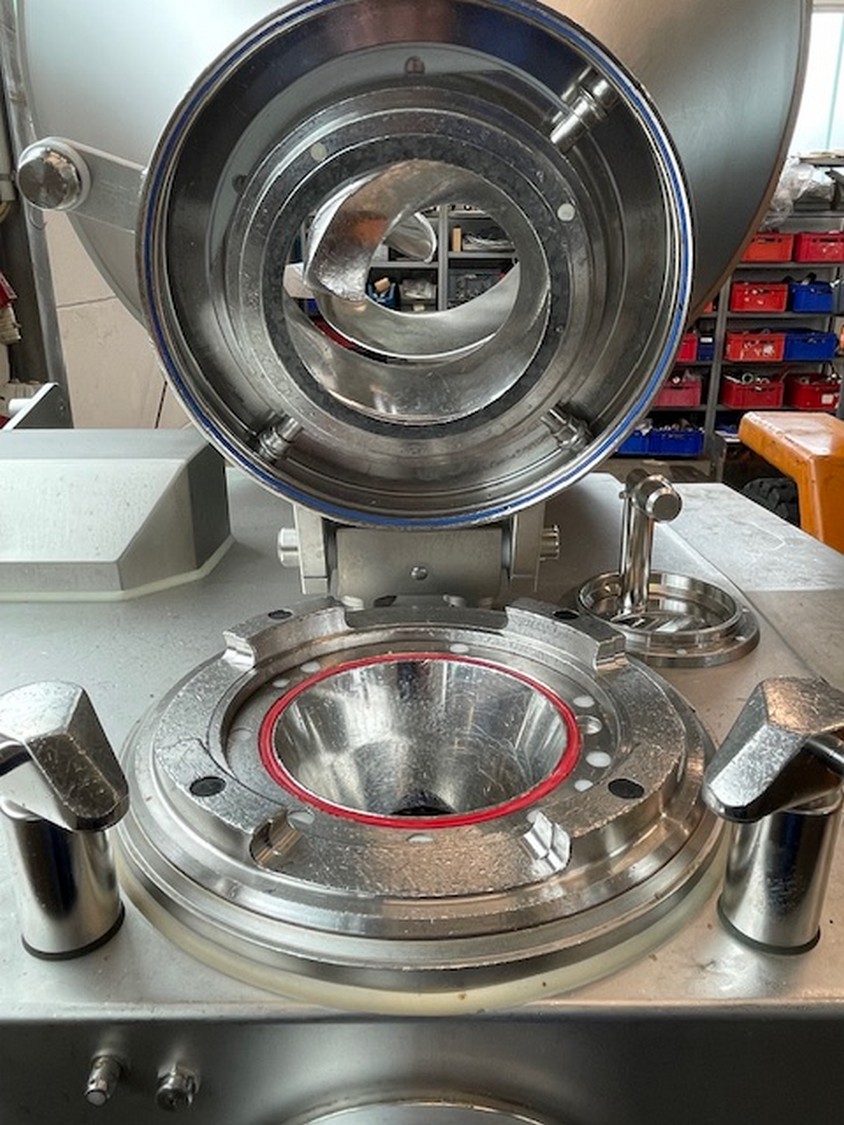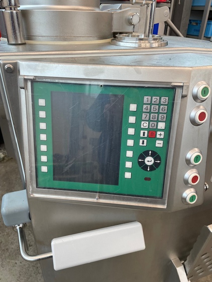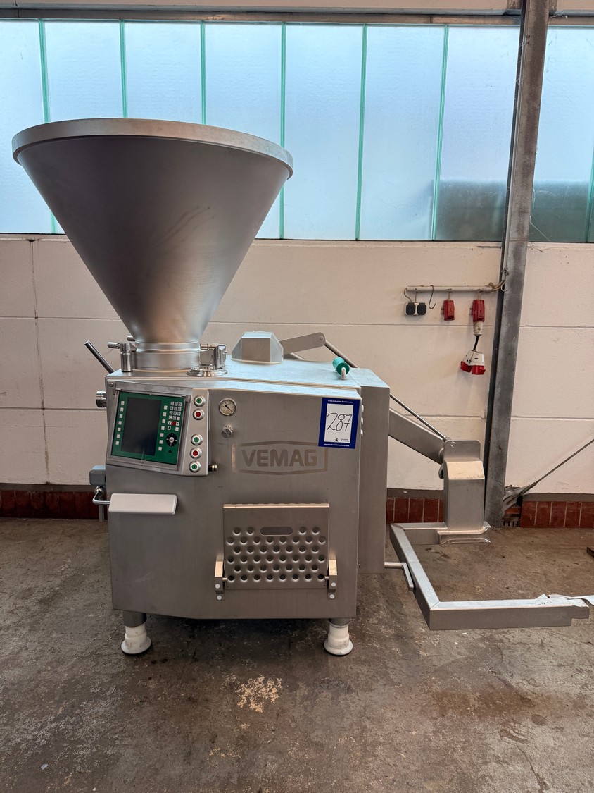 Vemag Maschinenbau GmbH vacuum filling machine with lifter for 200 liter meat bins, model: HP30E, number: 1660379, year of construction: 2014, 400-460 V, 3 Ph, 50/60 Hz, 50 A, 34 kW, dimensions: 2300 mm x 1500 mm x 2200 mm.