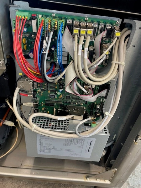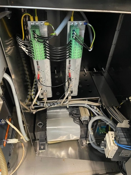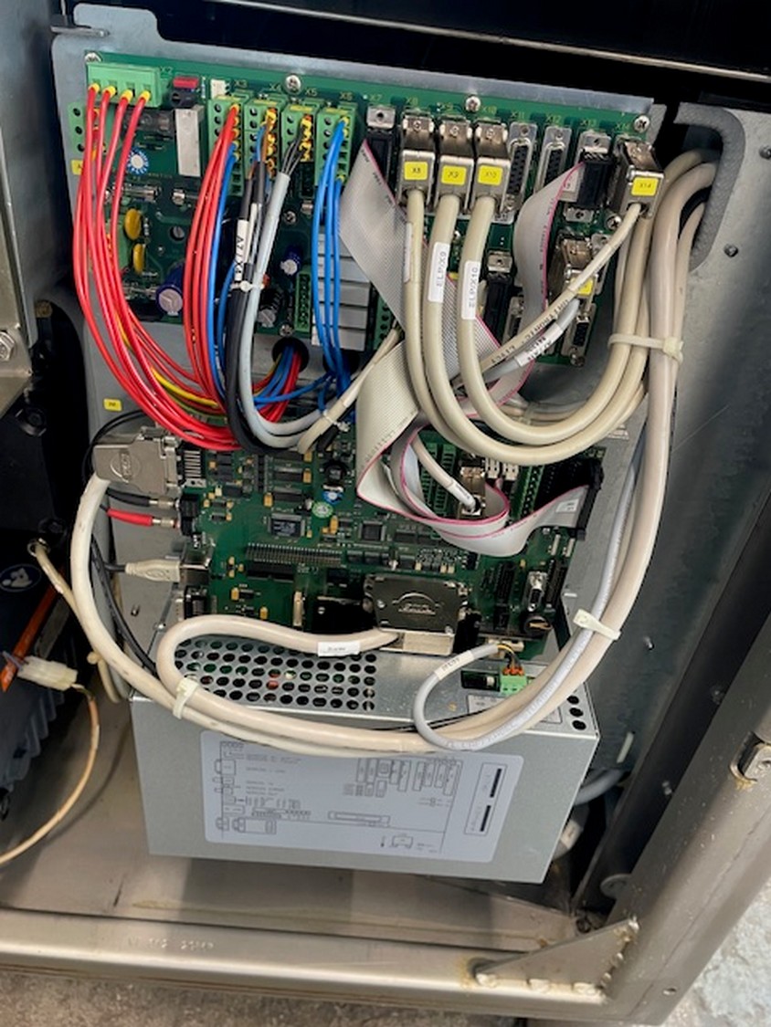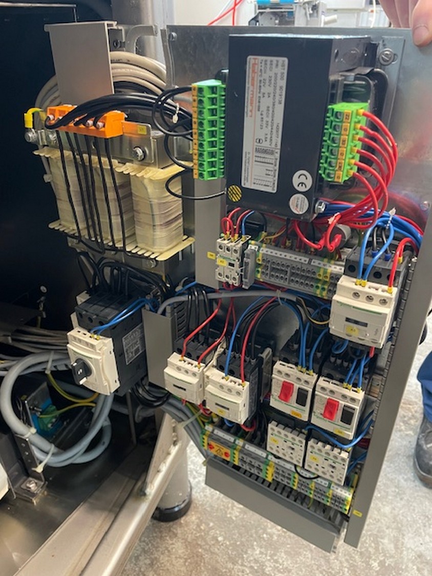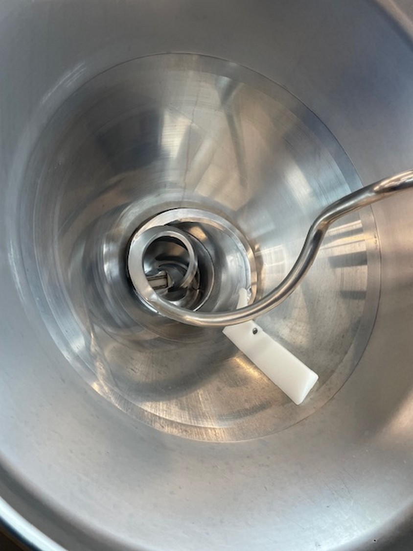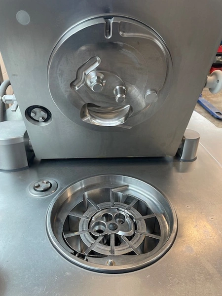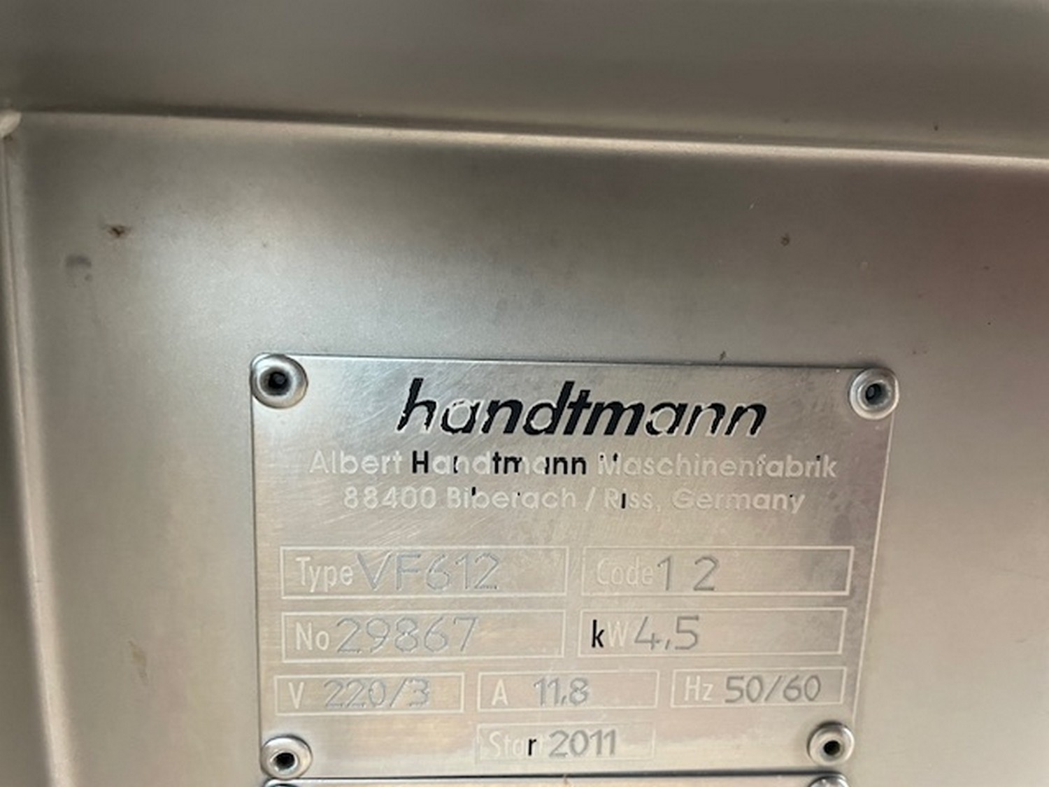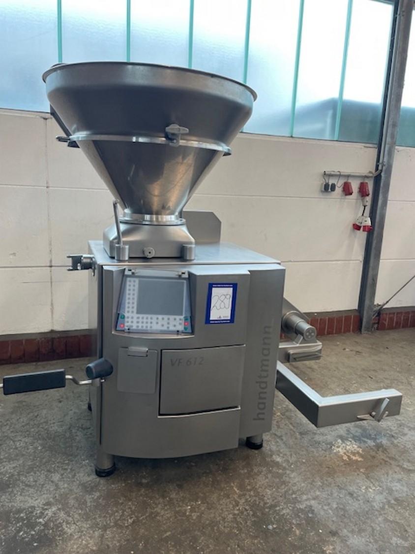 Handtmann vacuum filling machine with lifter for 200 liter meat bins, type: VF612, machine number: 29867, year of construction: 2011, 220 V, 3 Ph, 50/60 Hz, 4.5 kW, 11.8 A, dimensions: 1900 mm x 1300 mm x 2000 mm.