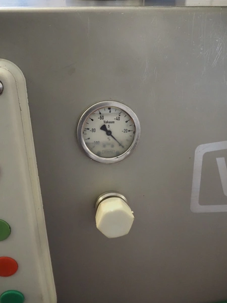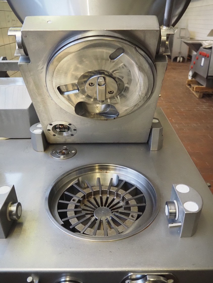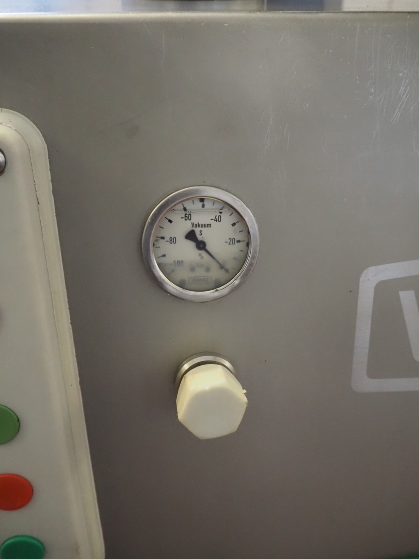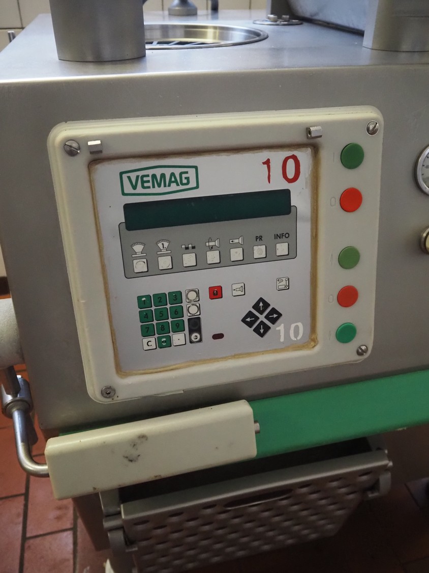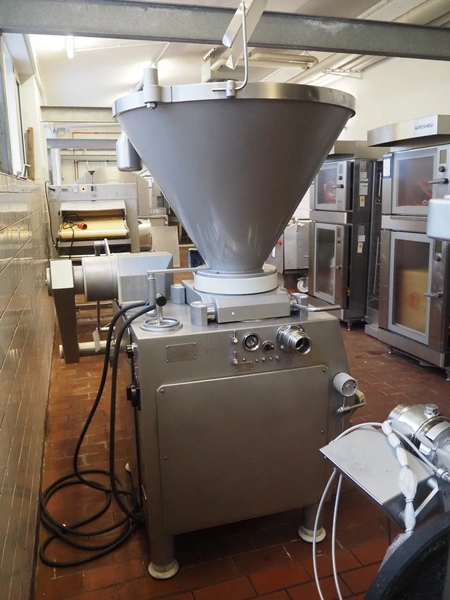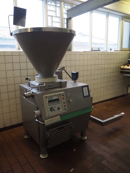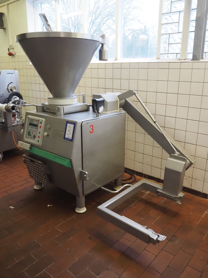 Vemag vacuum filling machine with lifter for 200 liter meat bins, model: ROBOT DP 10 C, number: 1530273, year of construction: 1998, Busch vacuum pump, type: KC 0016, serial number: CZM125030507, capacity: 19 m³/per hour, dimensions: 2150 mm x 1350 mm x 1960 mm.