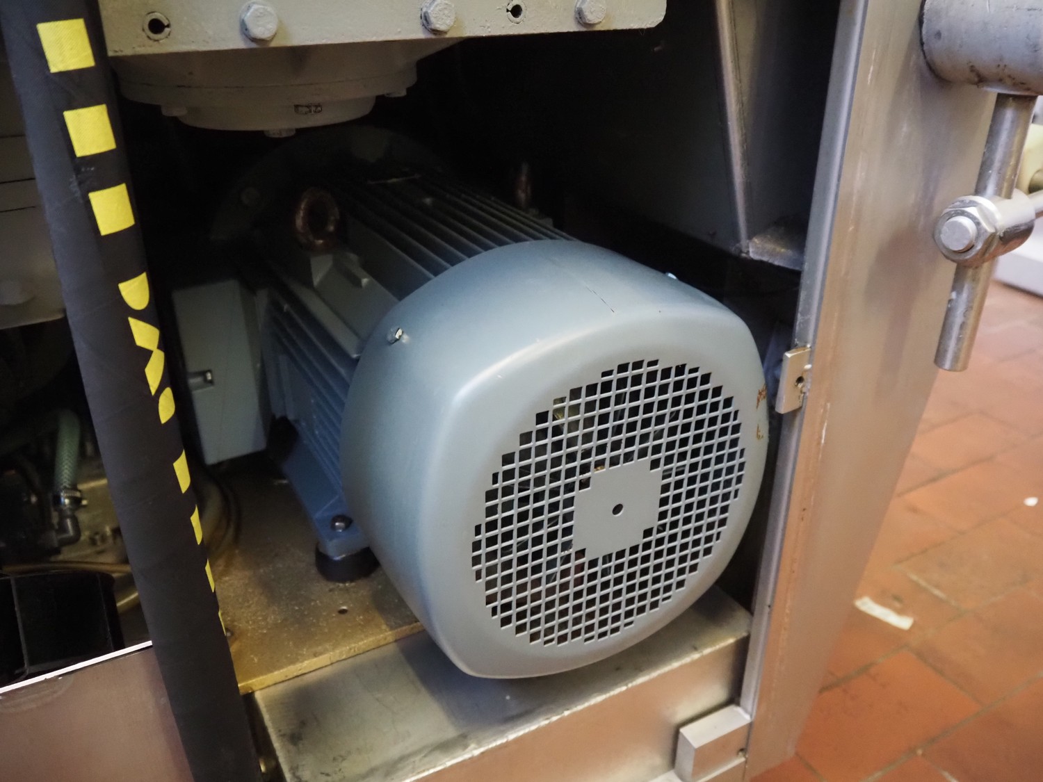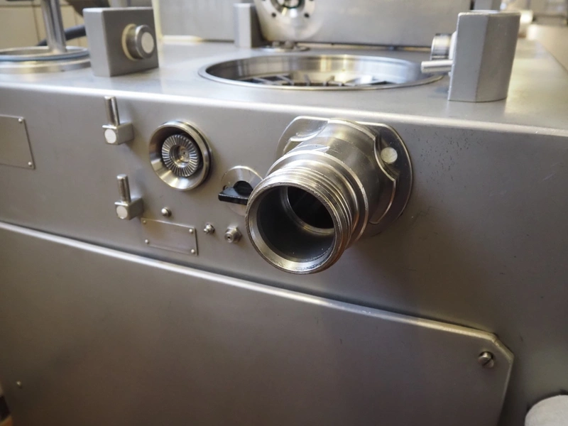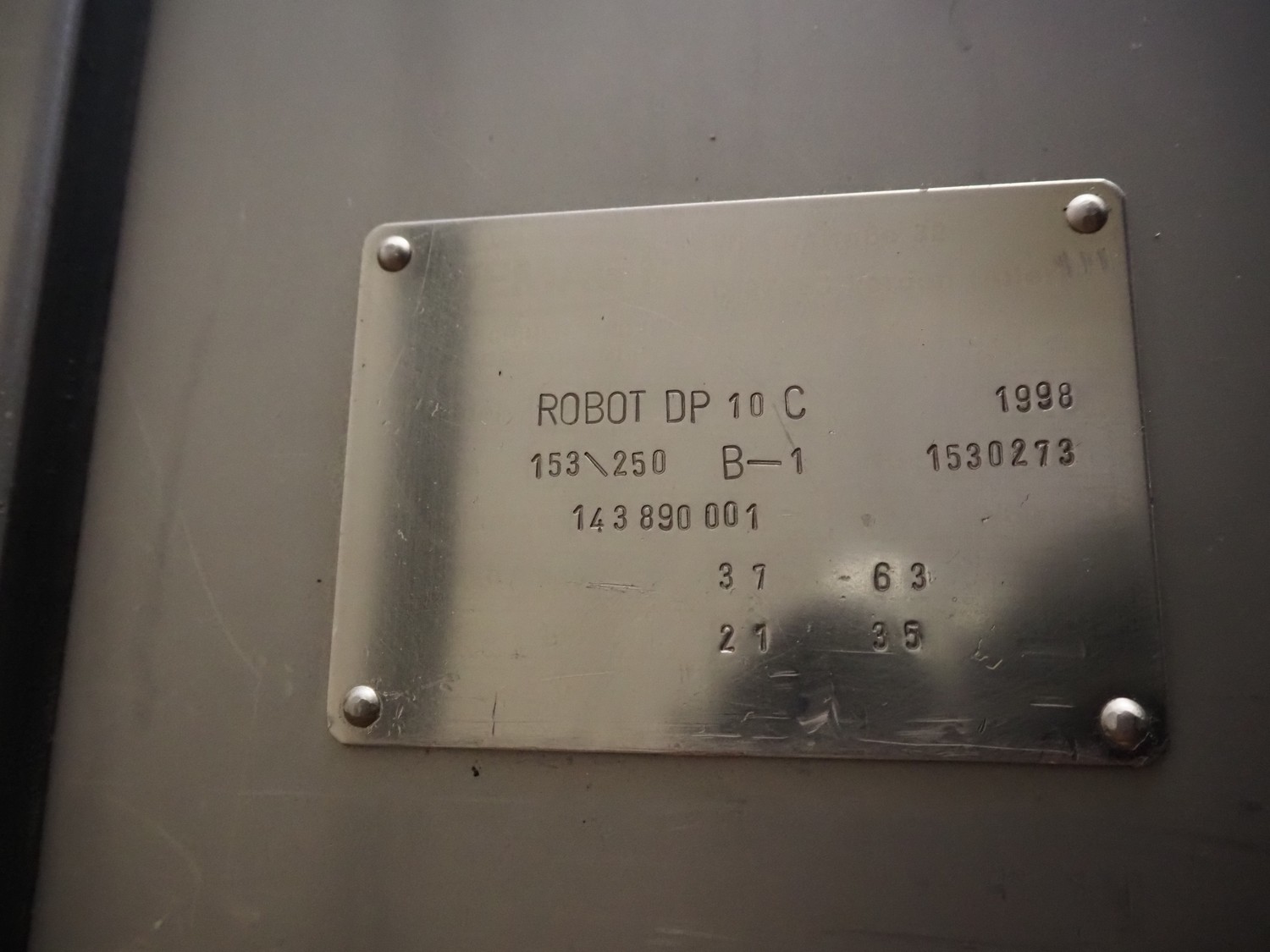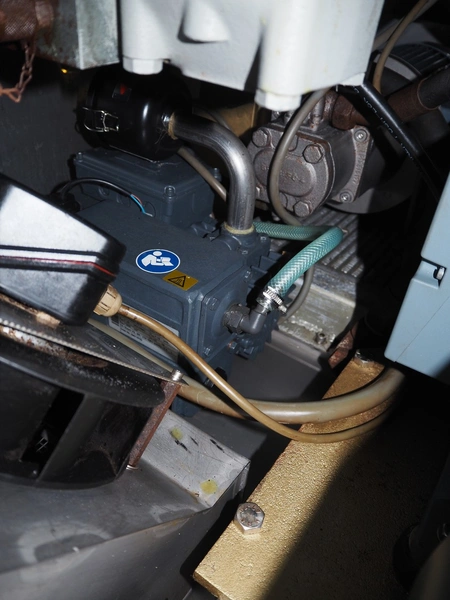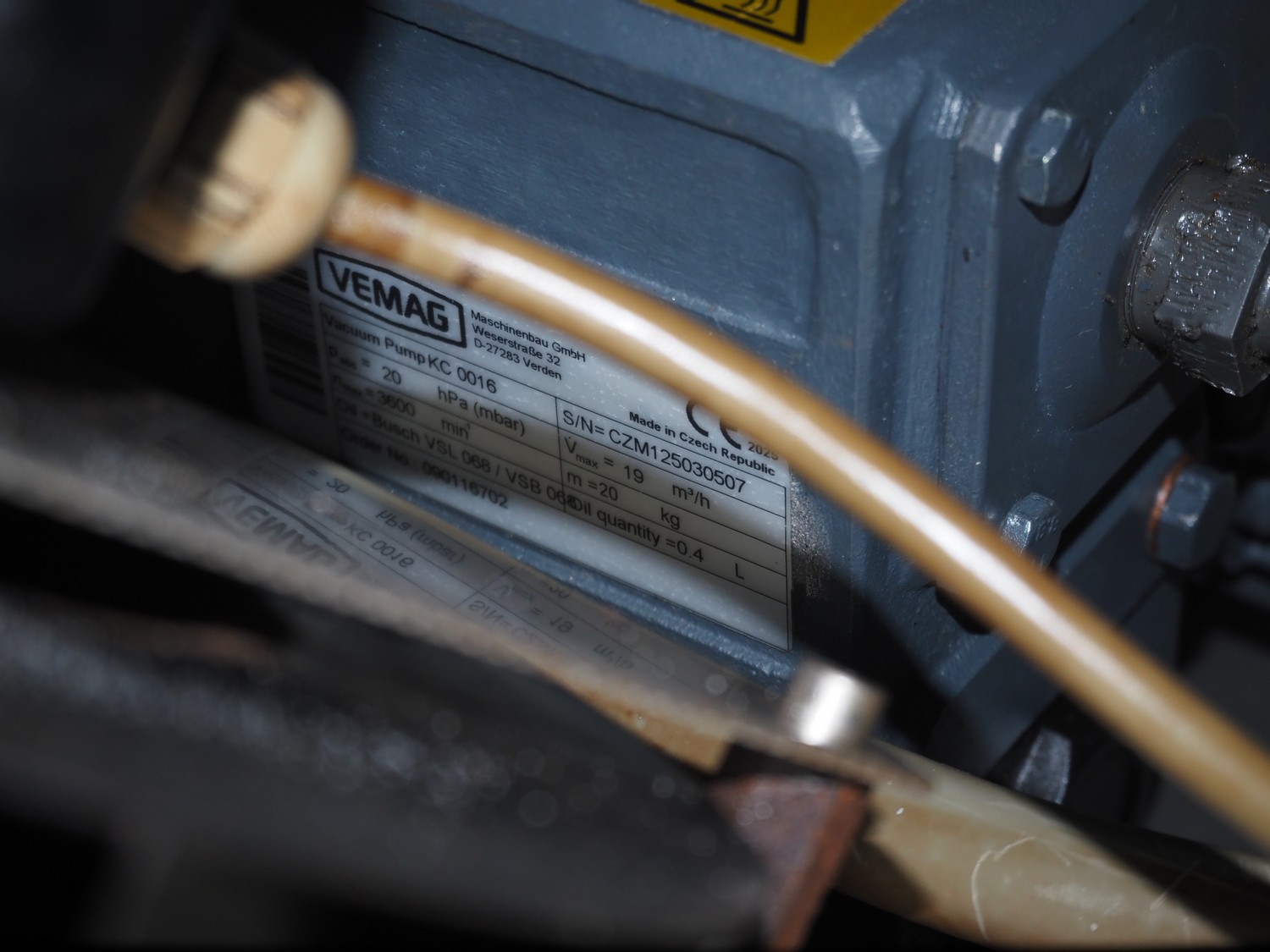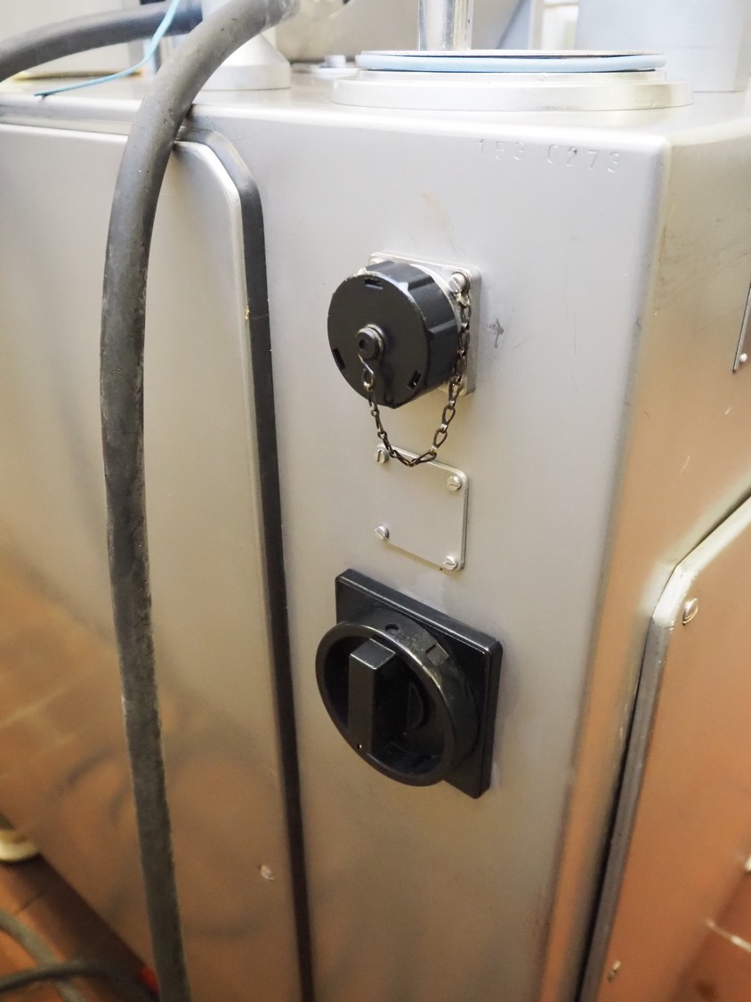 Vemag vacuum filling machine with lifter for 200 liter meat bins, model: ROBOT DP 10 C, number: 1530273, year of construction: 1998, Busch vacuum pump, type: KC 0016, serial number: CZM125030507, capacity: 19 m³/per hour, dimensions: 2150 mm x 1350 mm x 1960 mm.