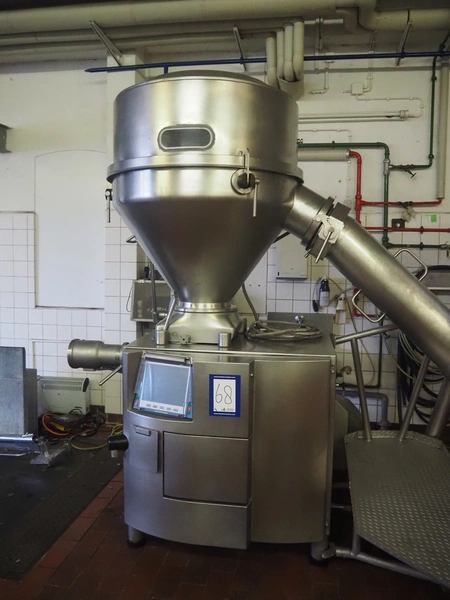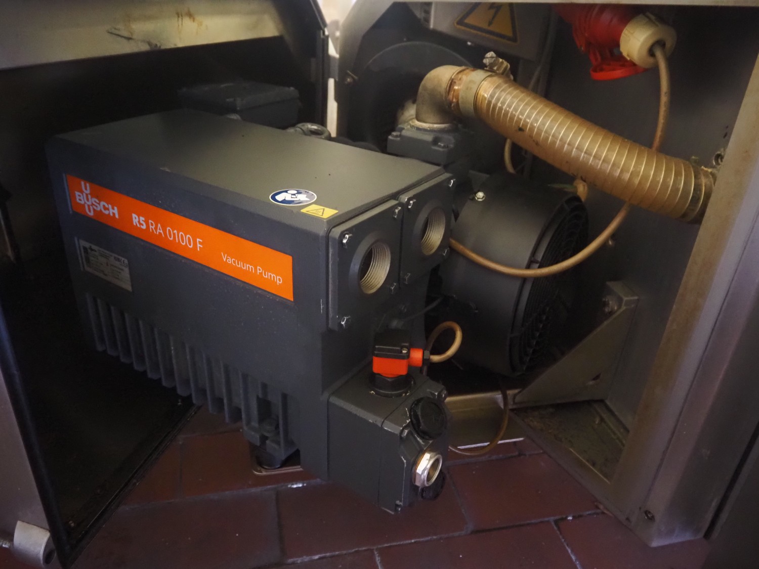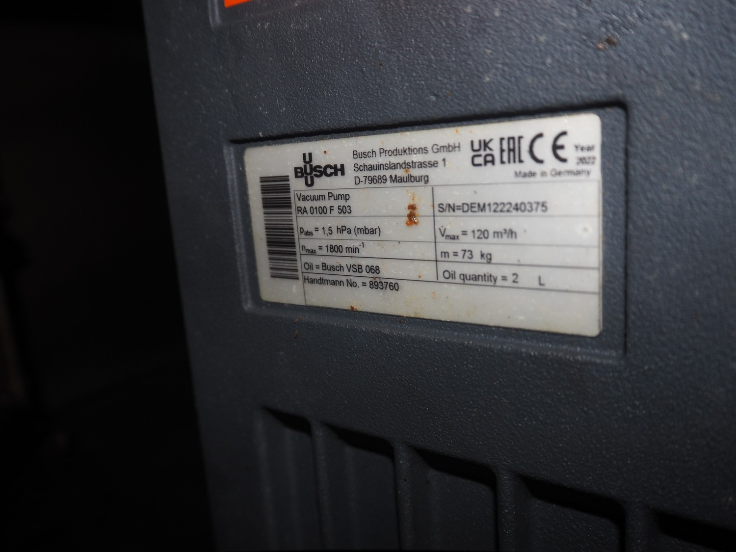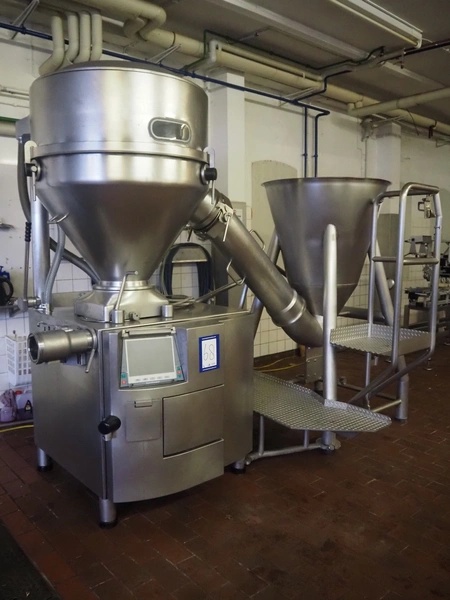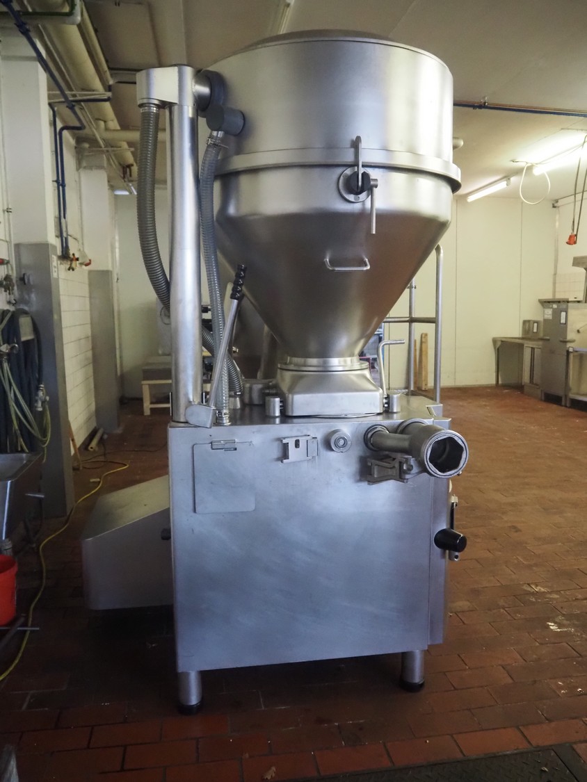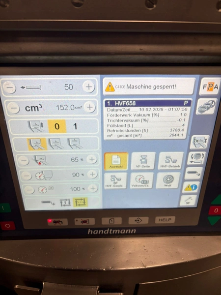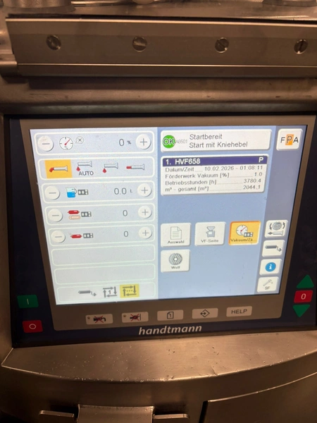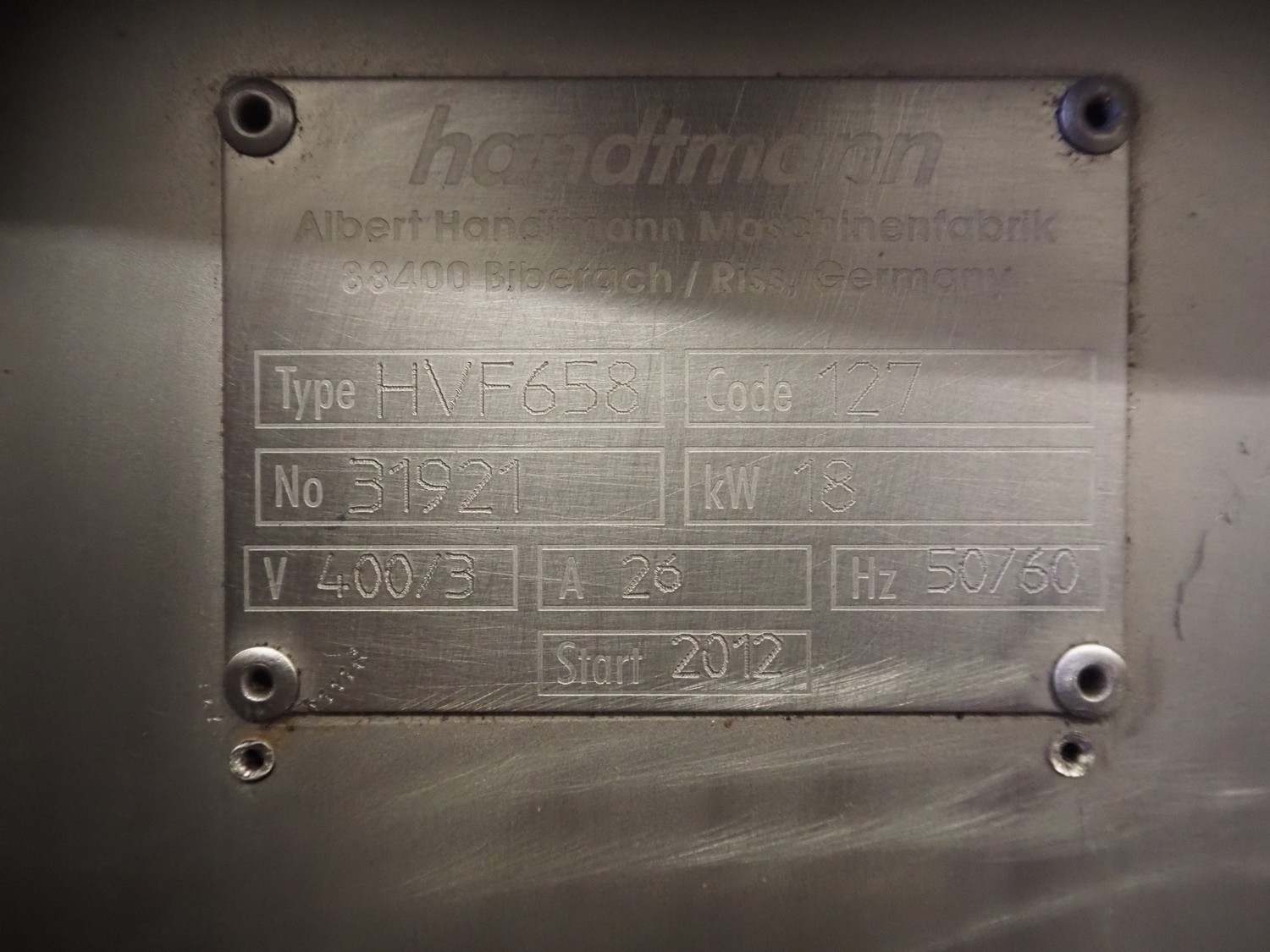 Handtmann high vacuum filling machine with infeed hopper, type: HVF658, number: 31921, year of construction: 2012, 400 V, 3 Ph, 50 Hz, 26 A, 18 kW, Busch vacuum pump, KB 0040 D IZO, number: CZM123380806, capacity: 48 m³ per hour, dimensions: 1660 mm x 1600 mm x 2400 mm, dimensions infeed hopper: 1900 mm x 1550 mm x 2000 mm.