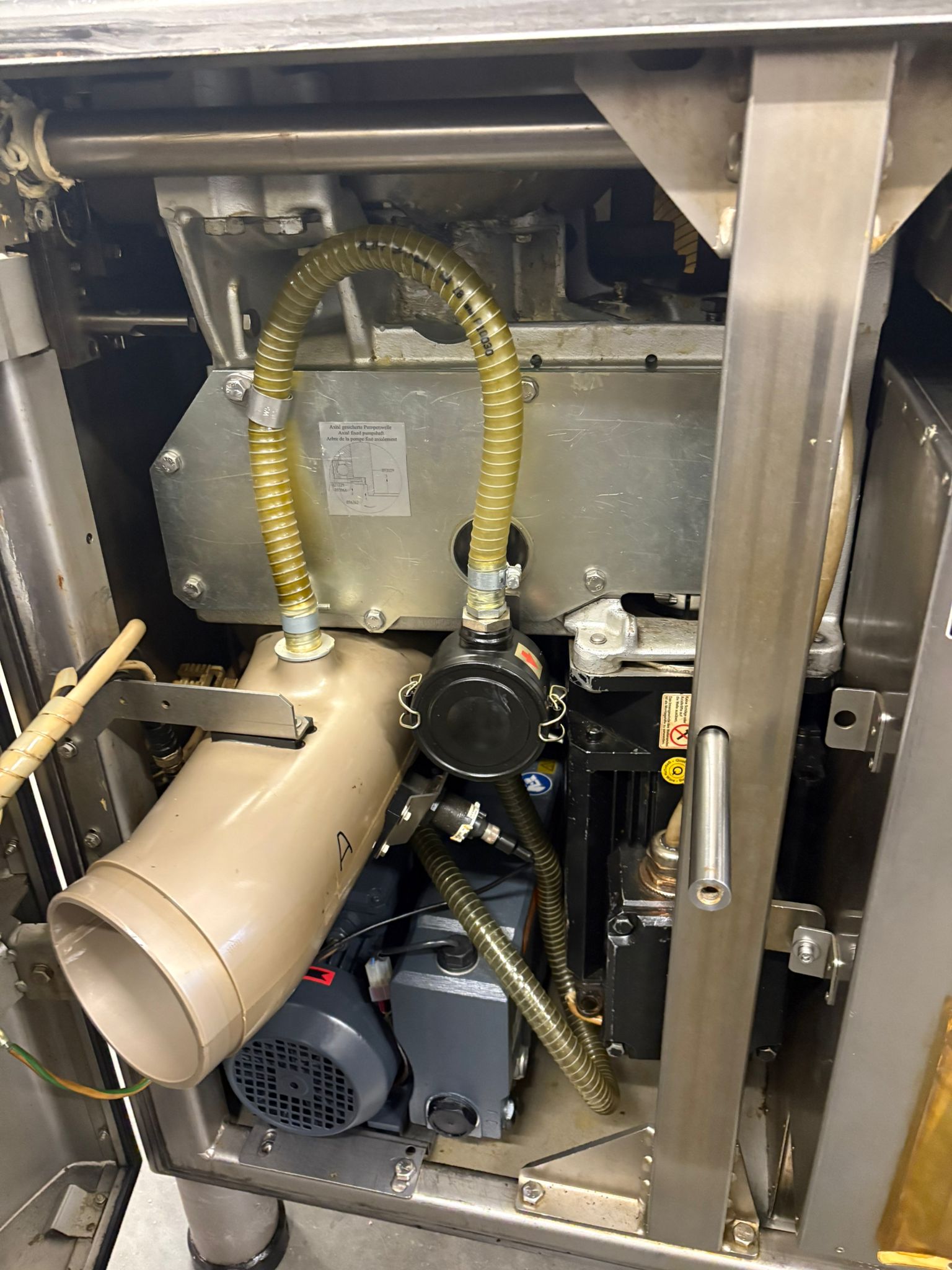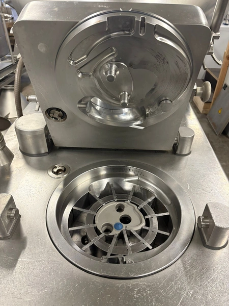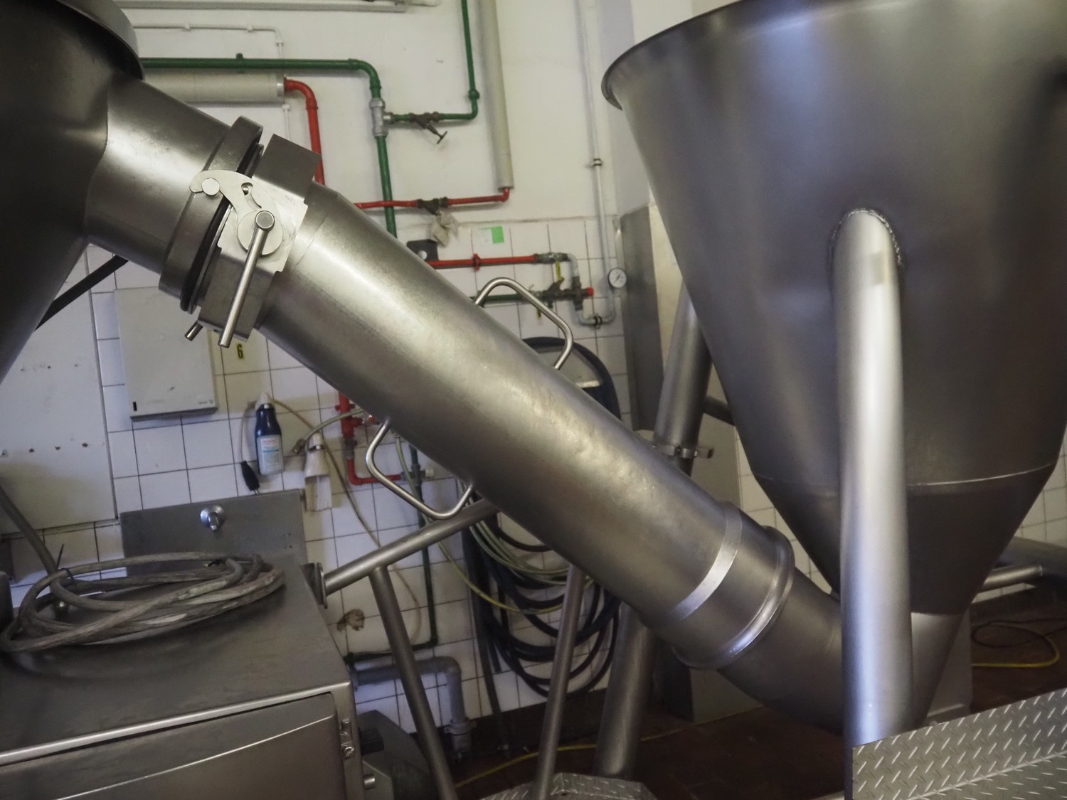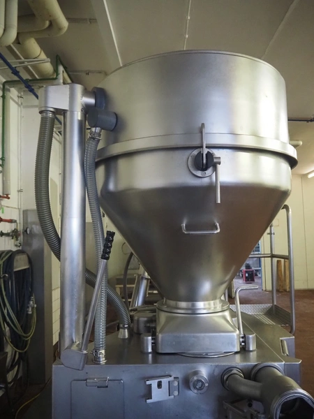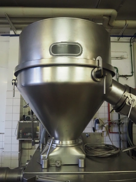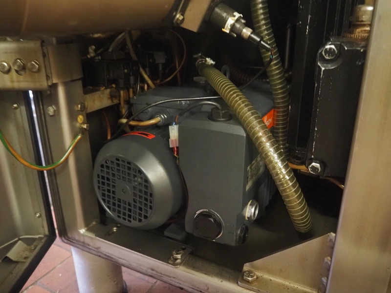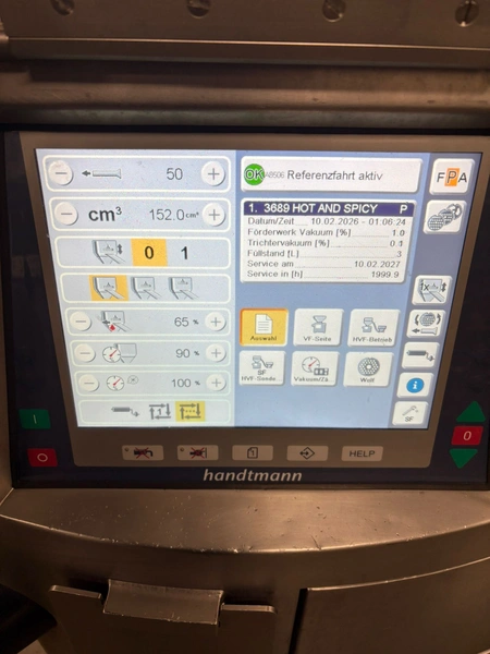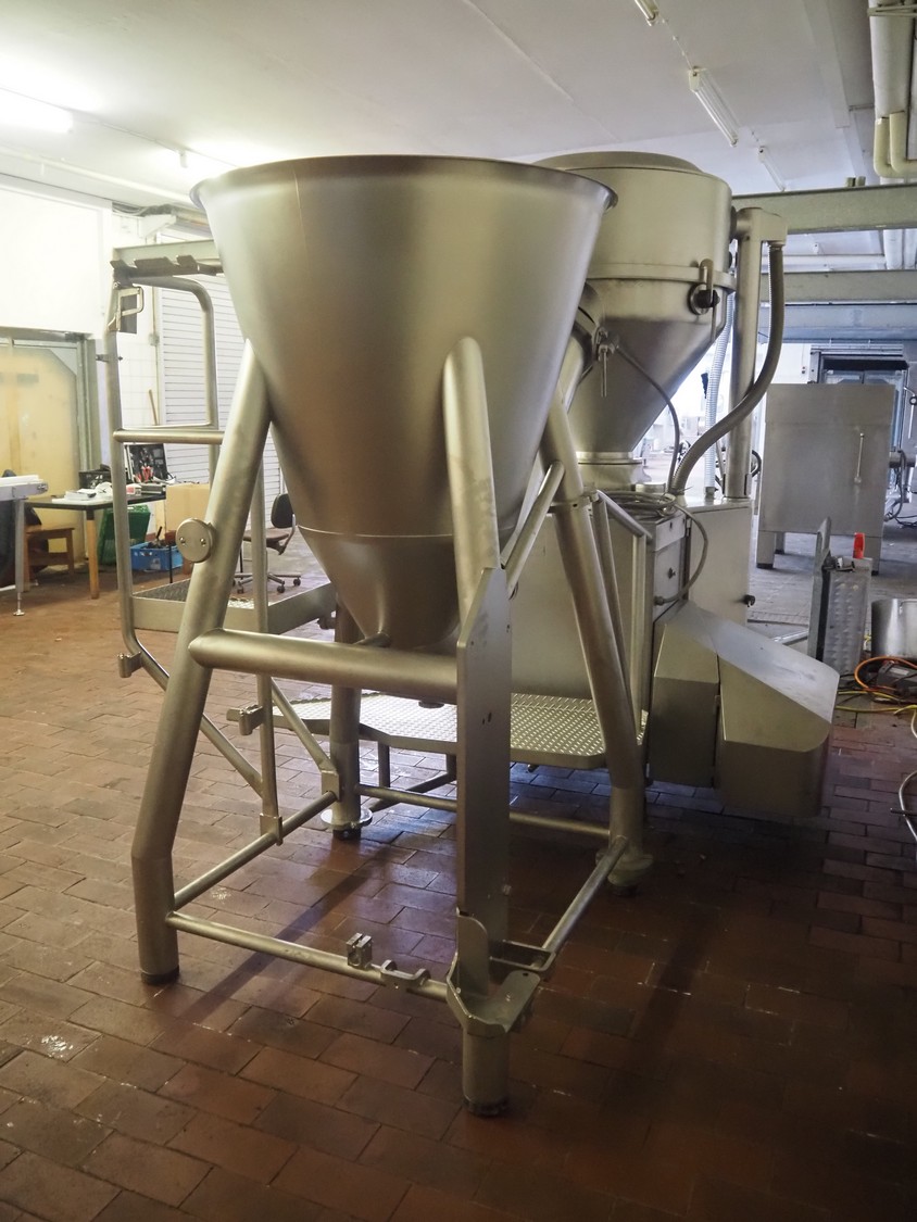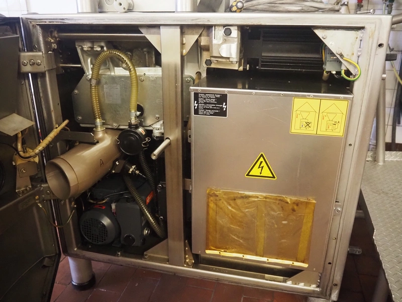 Handtmann high vacuum filling machine with infeed hopper, type: HVF658, number: 31921, year of construction: 2012, 400 V, 3 Ph, 50 Hz, 26 A, 18 kW, Busch vacuum pump, KB 0040 D IZO, number: CZM123380806, capacity: 48 m³ per hour, dimensions: 1660 mm x 1600 mm x 2400 mm, dimensions infeed hopper: 1900 mm x 1550 mm x 2000 mm.