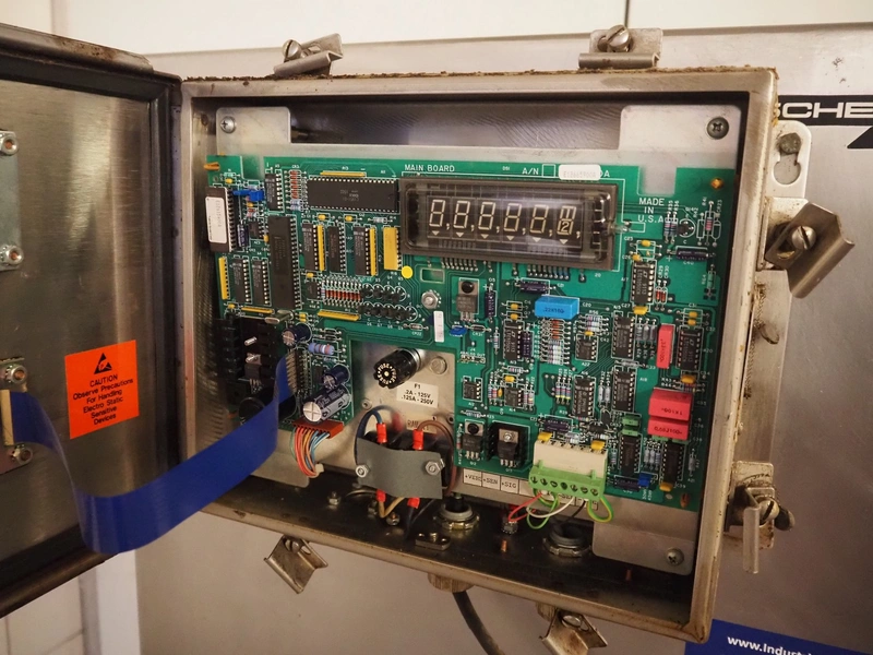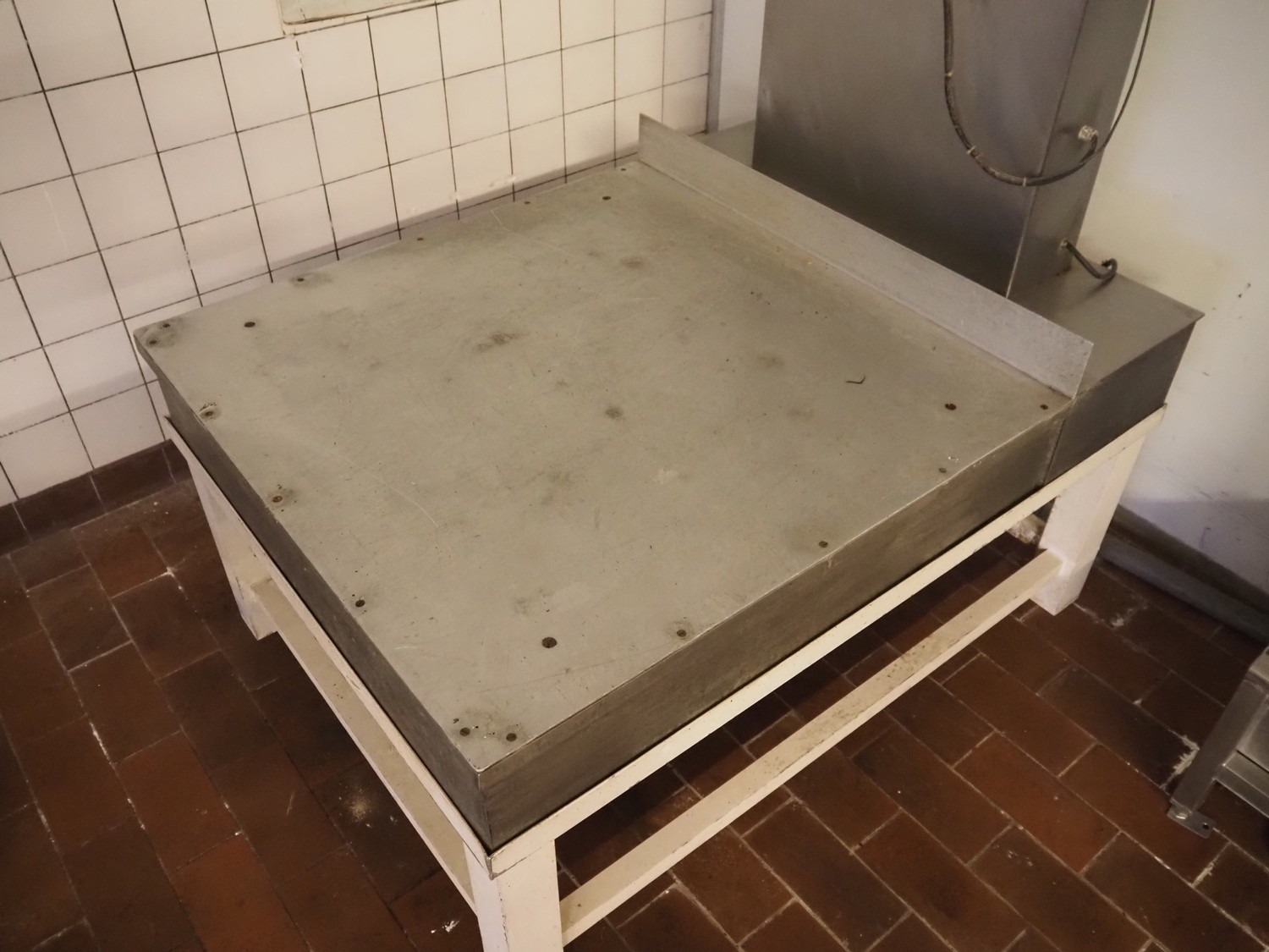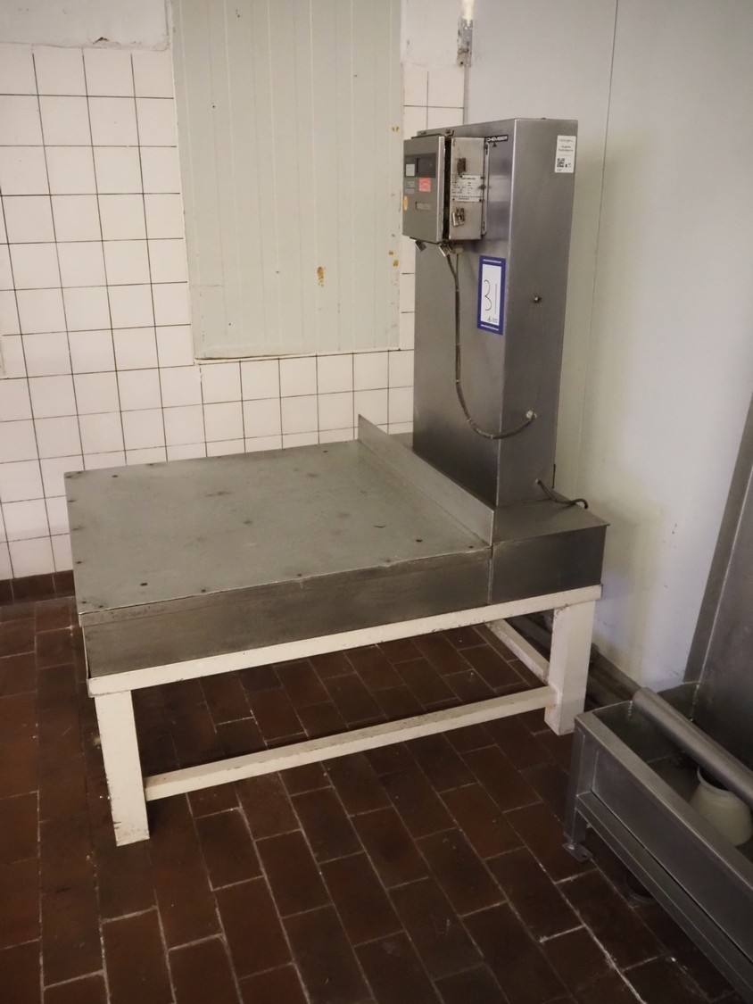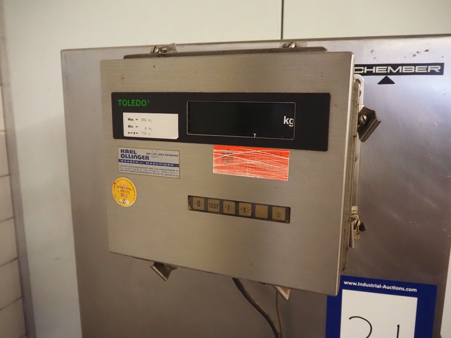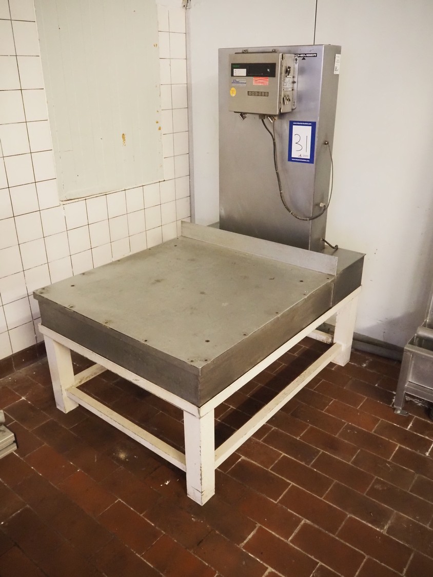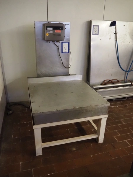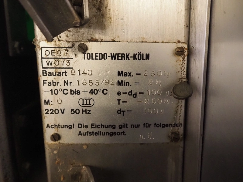 Toledo weighing scale, model: 8139, serial number: 4120732-4SL, 120 V, 50/60 Hz, 0.15 kW with Schember indicator, type: 320-3, number: 45478, minimum /maximum weight: 5 kg / 250 kg, e=d= 100 g, scale dimensions: 1000 mm x 1000 mm, total dimensions: 1350 mm x 1000 mm x 1670 mm.