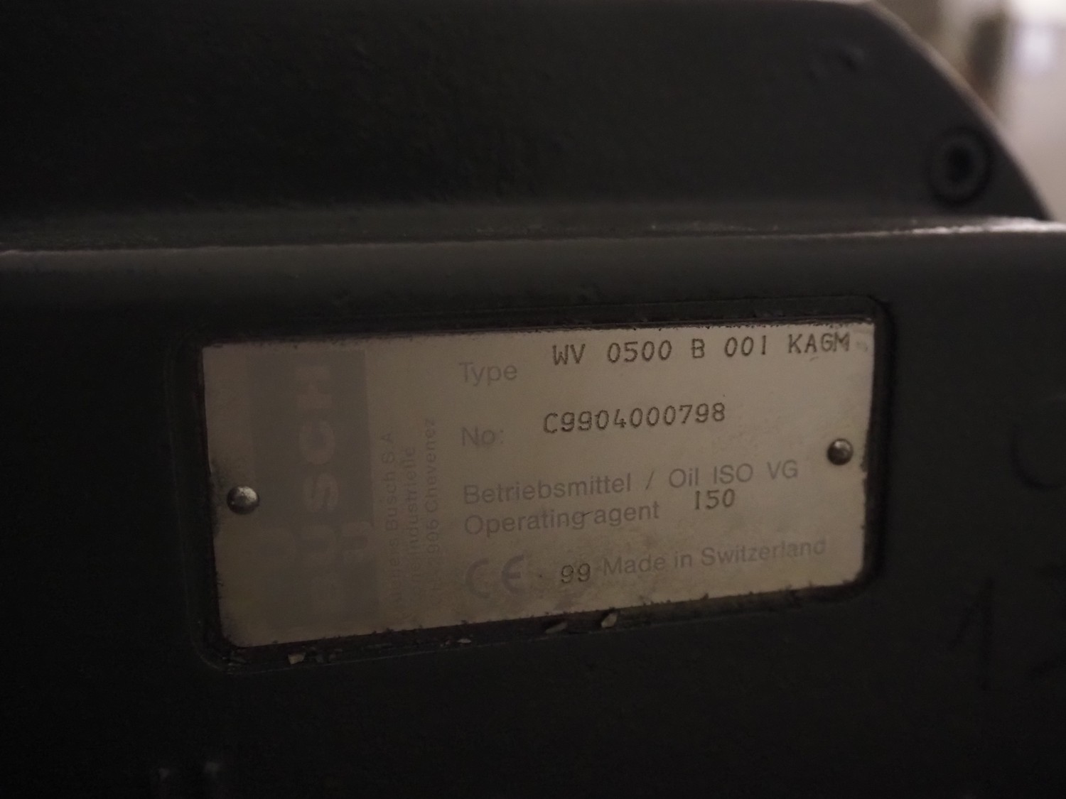 Busch booster pump, type: WV 0500 B 001 KAGM, number: C9904000798, year of construction: 1999, capacity: 500 m³/h, dimensions: 890 mm x 340 mm x 270 mm.