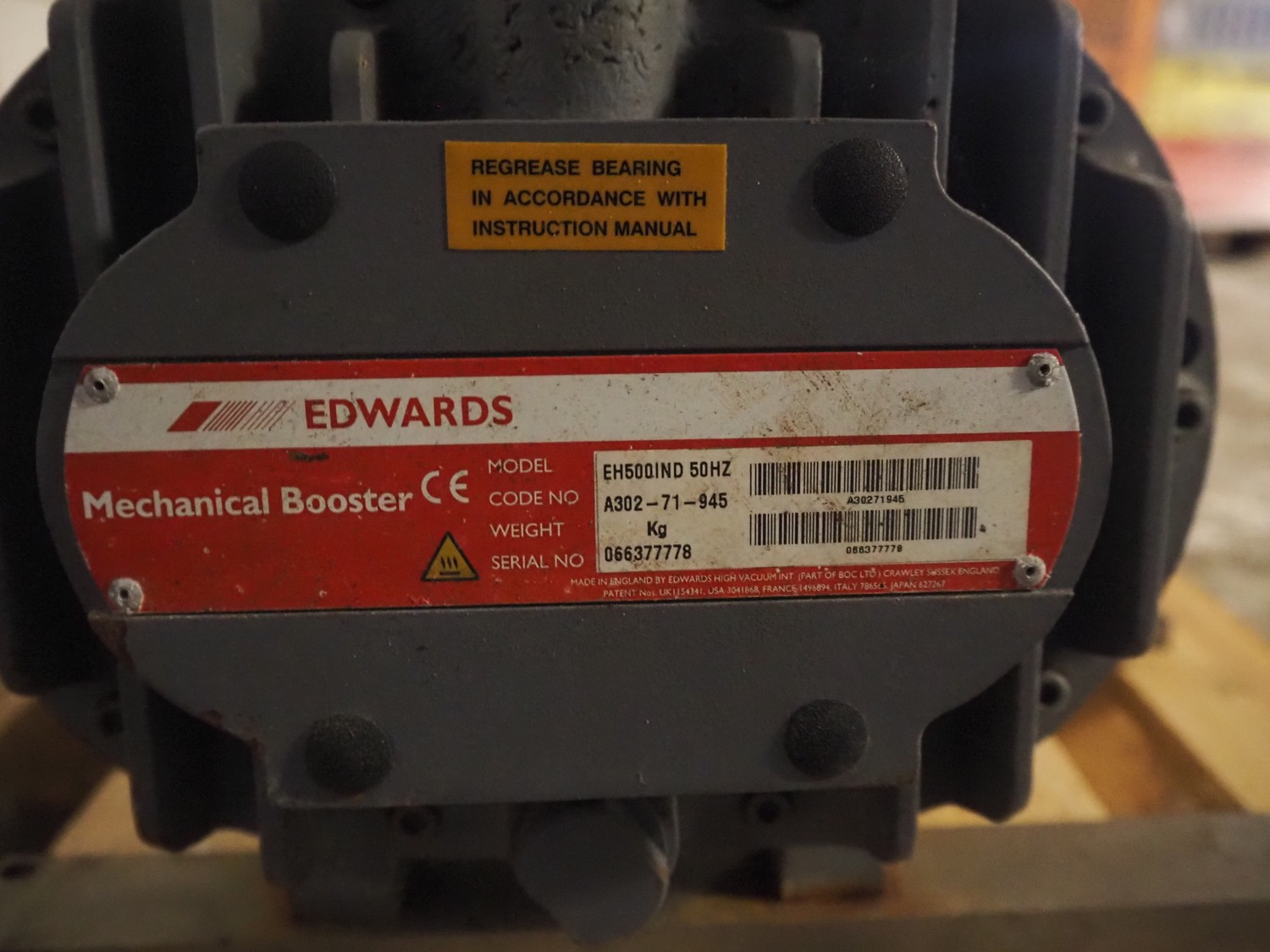 Edwards vacuum pump, model: EH500IND, serial number: 066377778, 50 Hz, capacity: 505 m³ per hour, total dimensions: 820 mm x 380 mm x 400 mm.