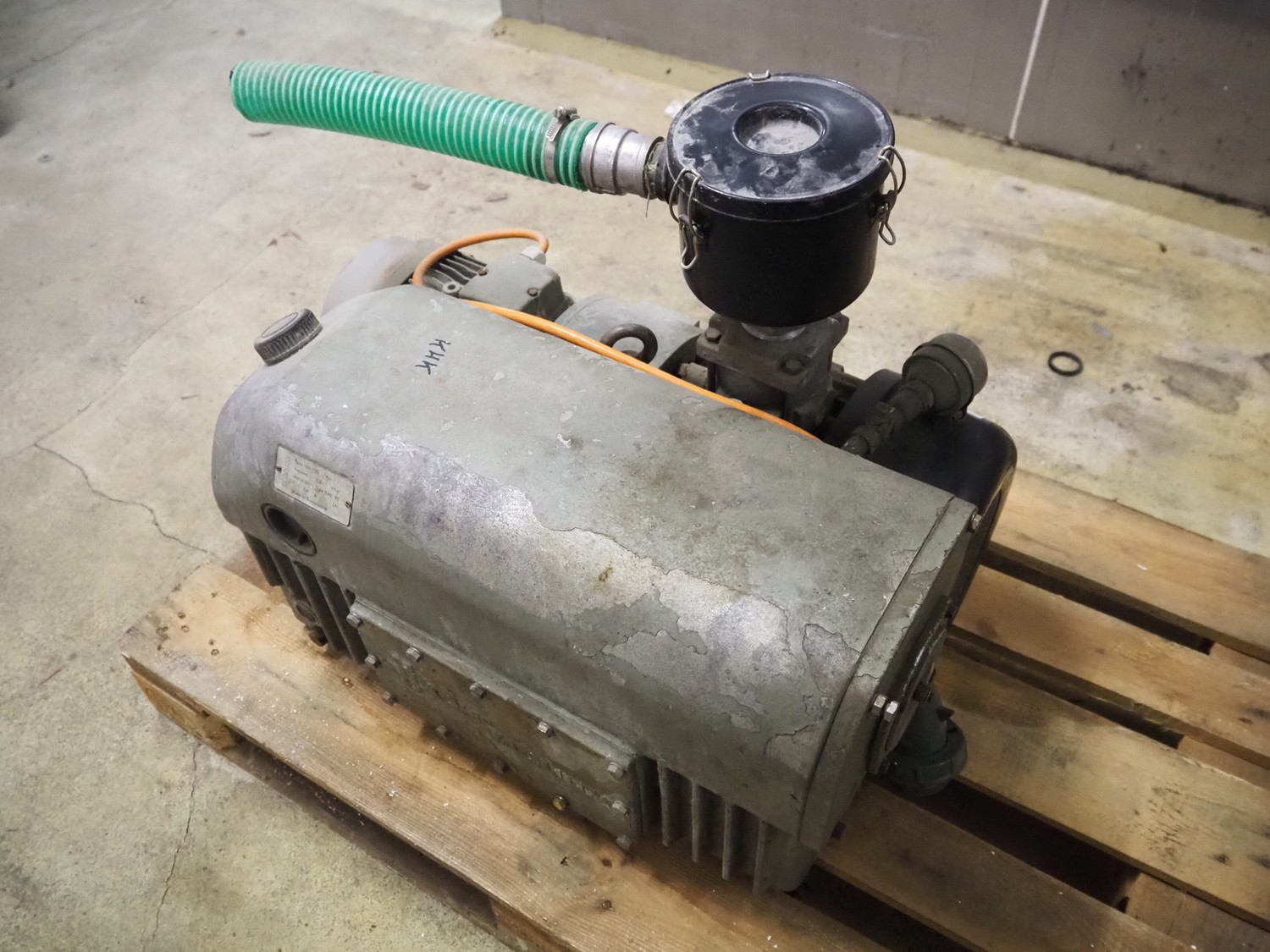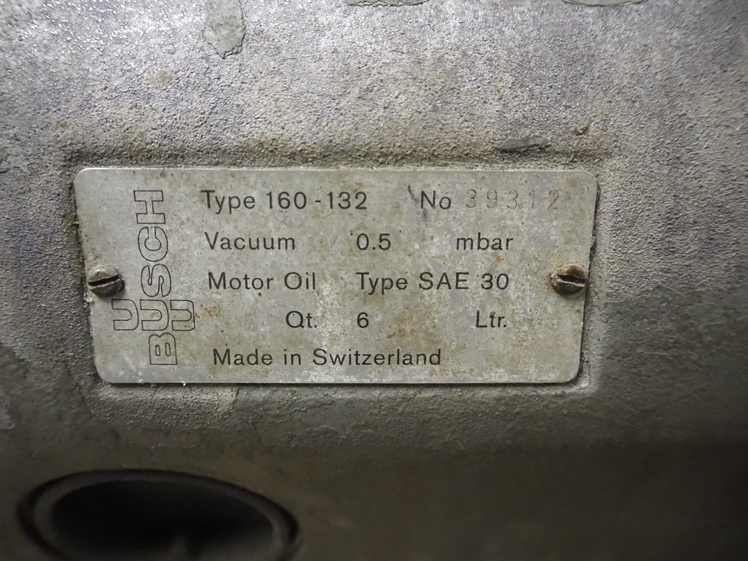 Busch vacuum pump, type: 160-132, number: 39312, capacity: 160 m³ per hour, dimensions: 800 mm x 500 mm x 620 mm.