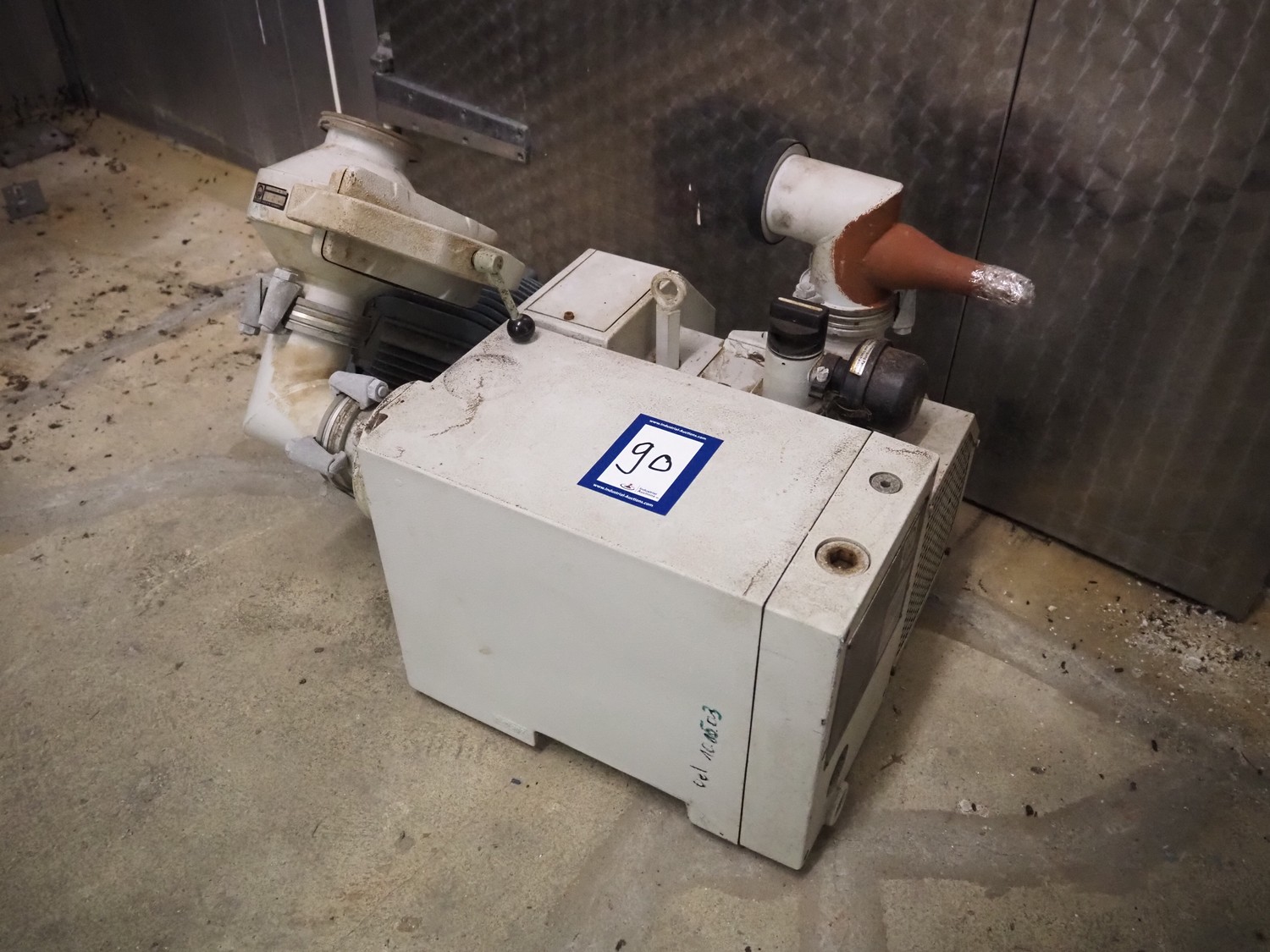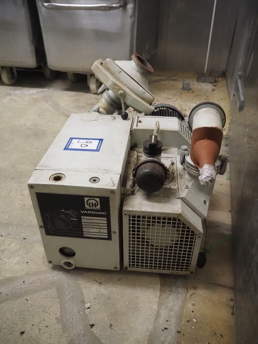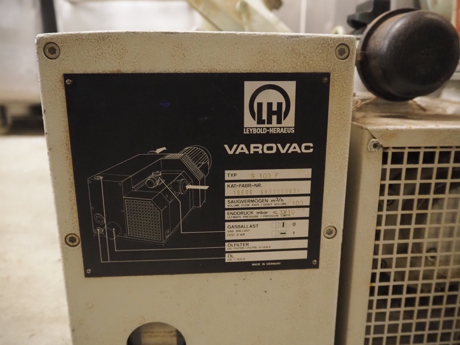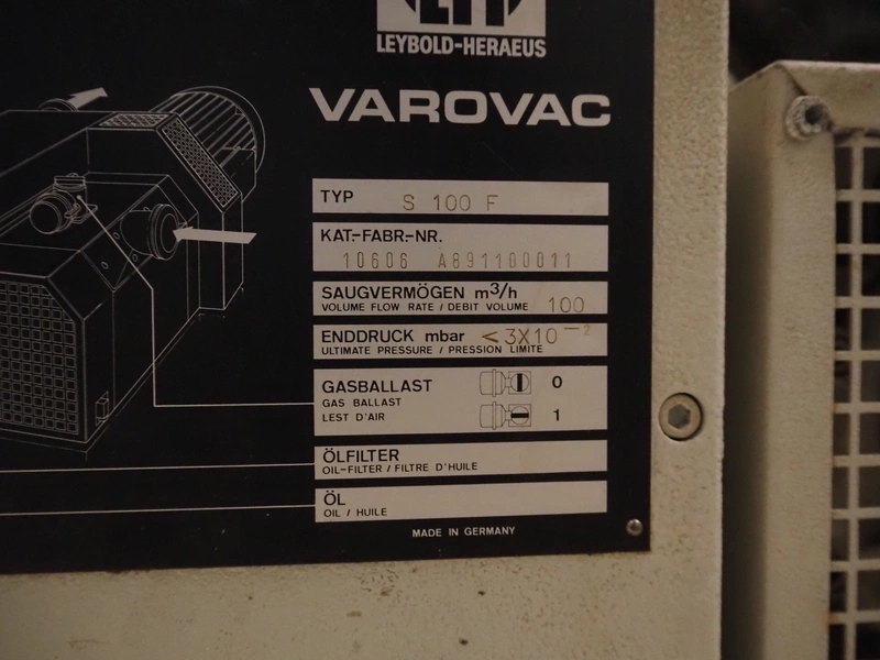 Leybold-Heraeus Varovac vacuum pump, type: S 100 F, fabrication number: 10606 A891100011, volume flow rate: 100 m³ per hour, dimensions: 700 mm x 500 mm x 400 mm.