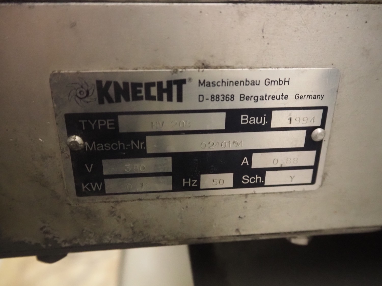 Knecht mobile knife sharpener, type: HV 208, number: 0210194, year of construction: 1994, 380 V, 50 Hz, 0.88 A, 0.18 kW, dimensions: 1220 mm x 1000 mm x 1330 mm. Incomplete.