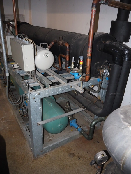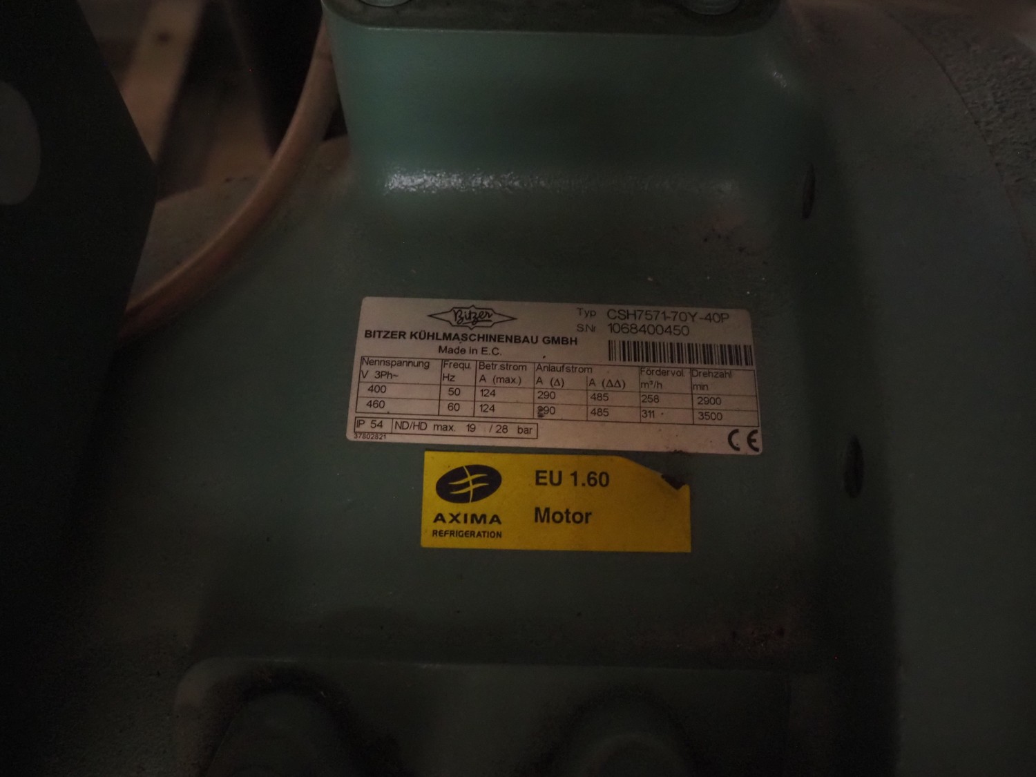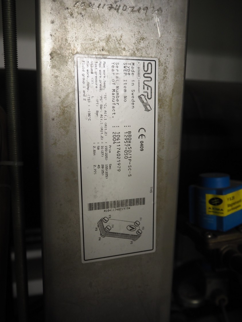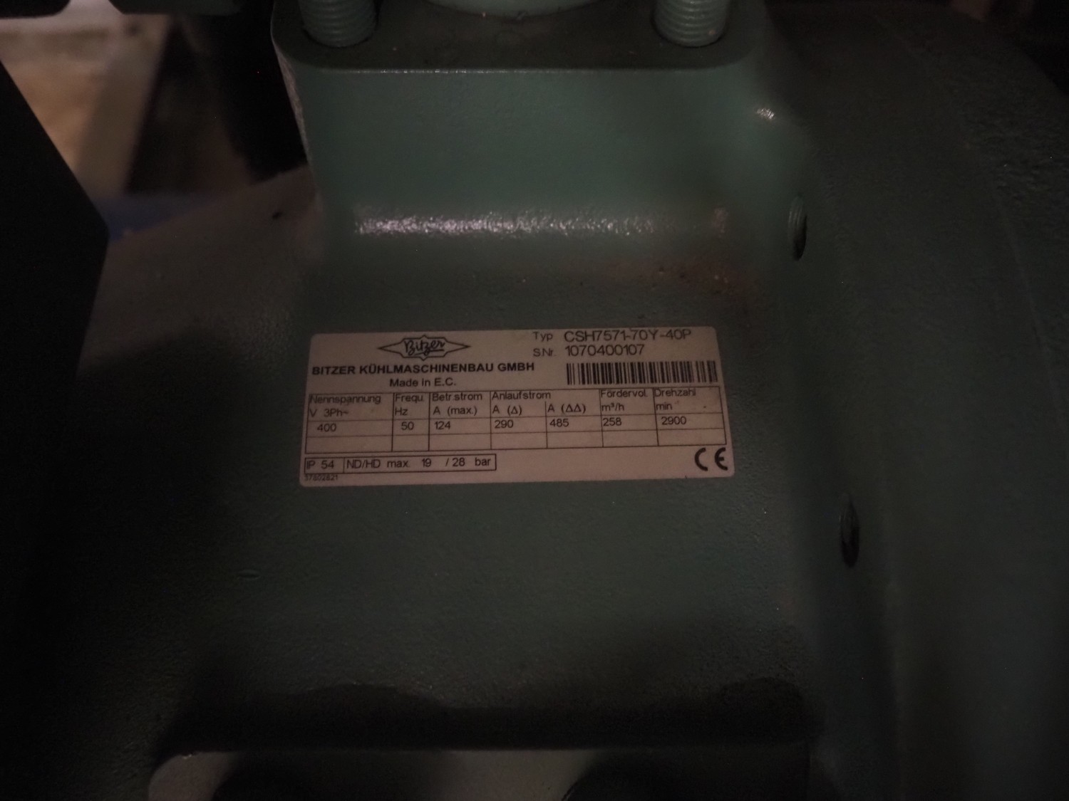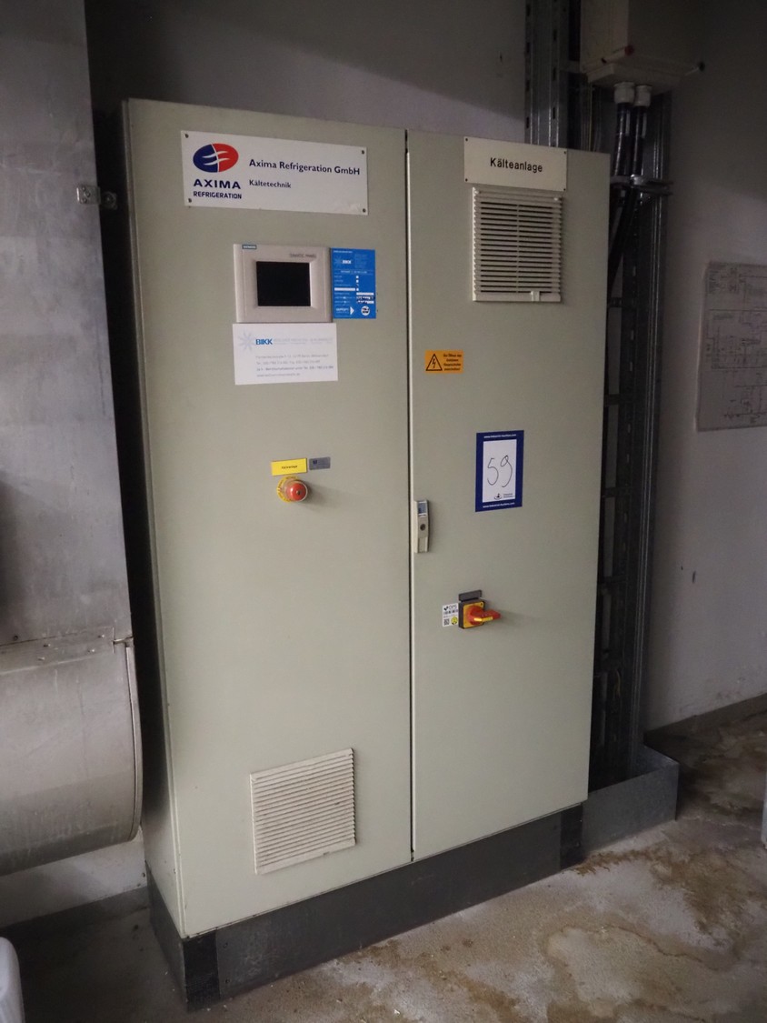 Bitzer Kühlmaschinenbau GmbH cooling compressor rack consisting of 2 cooling compressors, type: (2x) CSH7571-70Y-40P, serial number: 1070400107/1068400450, 400/460 V, 50/60 Hz, 124 A, capacity: (2x) 258/311 m³ per hour, dimensions: 3100 mm x 1200 mm x 1700 mm, steel switch cabinet, dimensions: 1200 mm x 400 mm x 2000 mm.