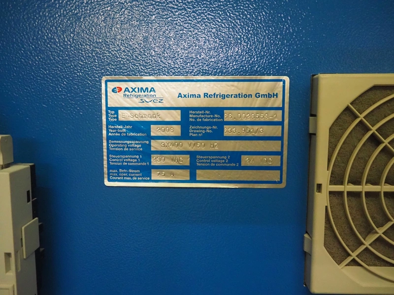 Axima Refrigeration GmbH water chiller, type: AquaChill, fabrication number: 66.0028559-1, year of construction: 2006, 400 V, 3 Ph, 50 Hz, 75 A. dimensions: 2200 mm x 900 mm x 2050 mm.