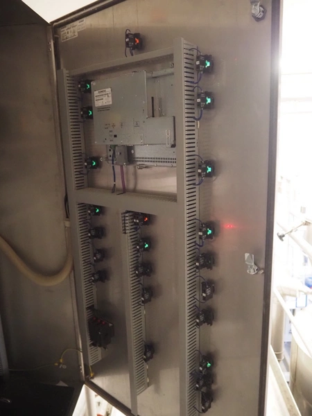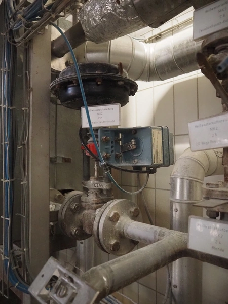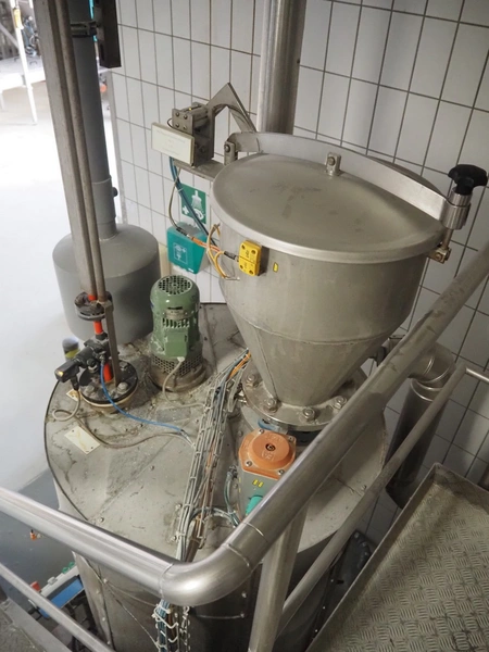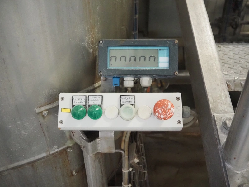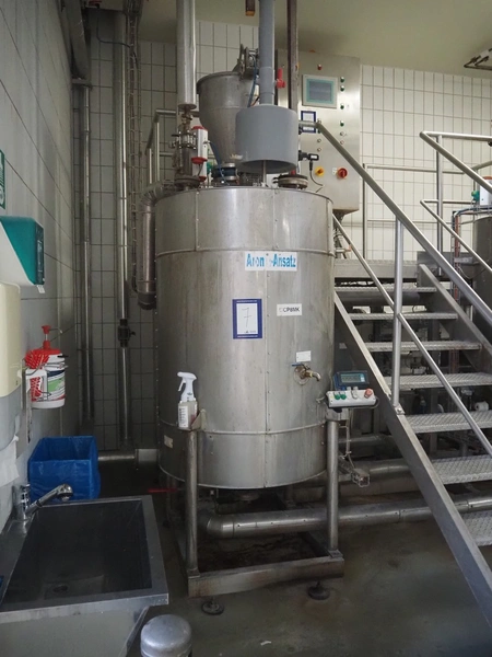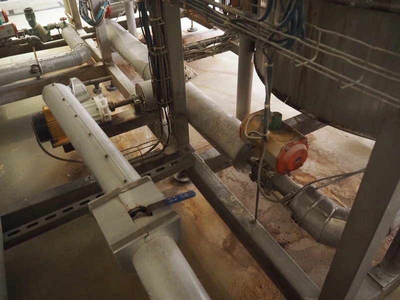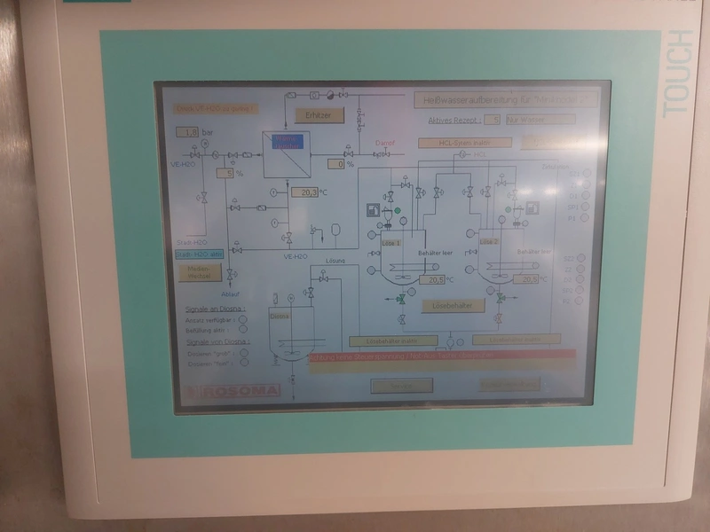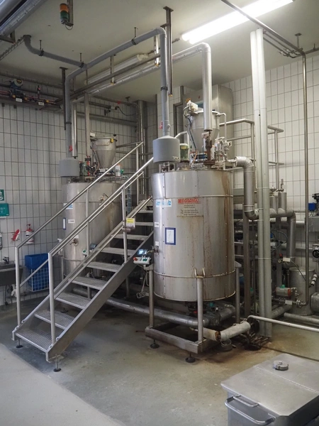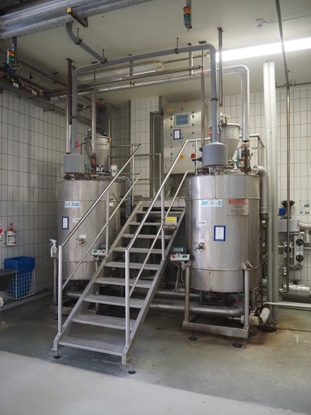 Rosoma GmbH hot water installation consisting of: 2 hot water tanks, dimensions: (2x) Ø 1050 mm x 3000 mm, s/s switch cabinet, dimensions: 800 mm x 450 mm x 1350 mm, s/s platform, dimensions: 3500 mm x 3000 mm x 3800 mm, various valves.