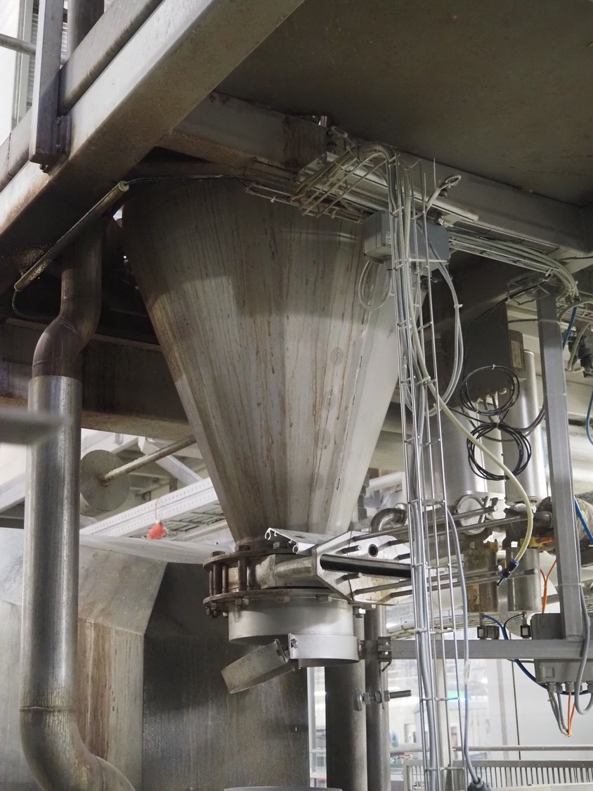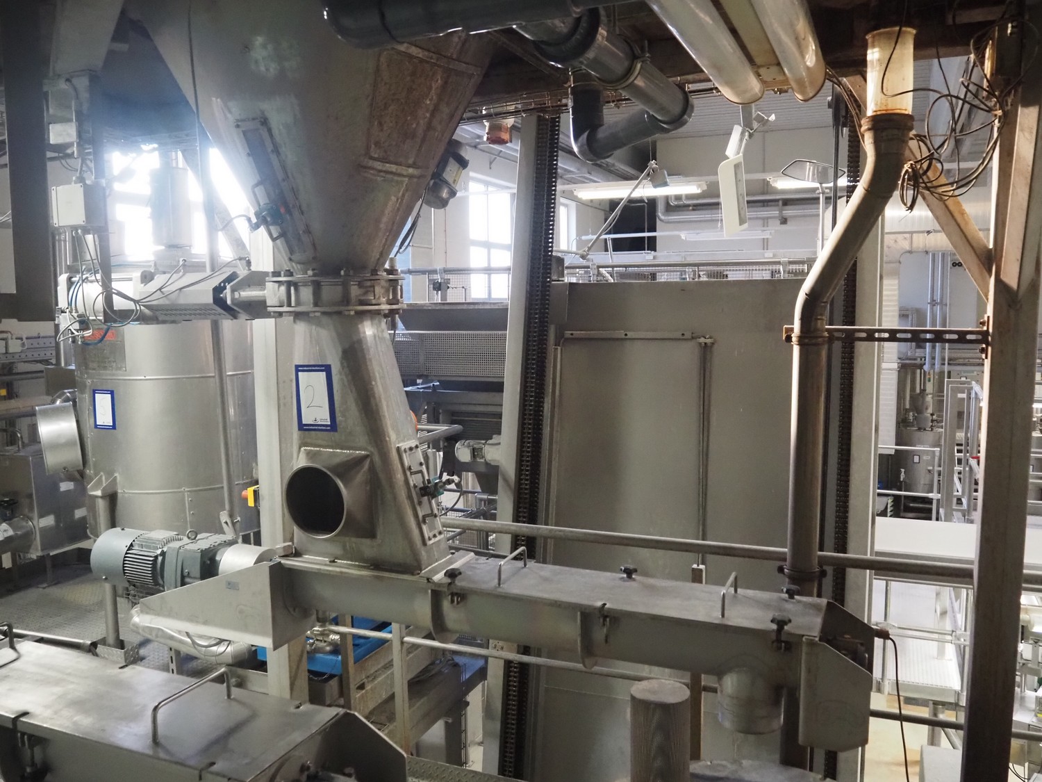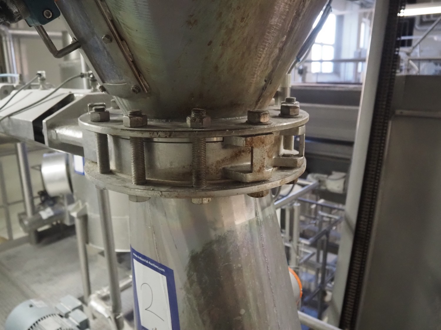 Eima GmbH infeed hopper with transport screw and outfeed hopper on weighing cells with valve, s/s screw, diameter: 180 mm, tier: 120 mm, dimensions infeed hopper with transport screw: 2500 mm x 1000 mm x 4000 mm, dimensions outfeed hopper: 1300 mm x 1300 mm x 2000 mm.