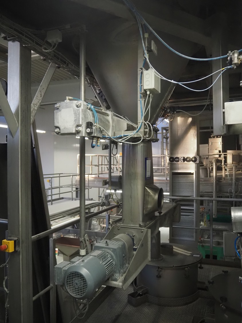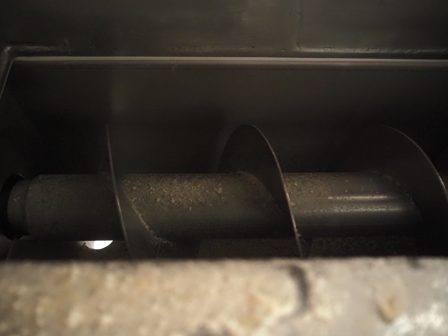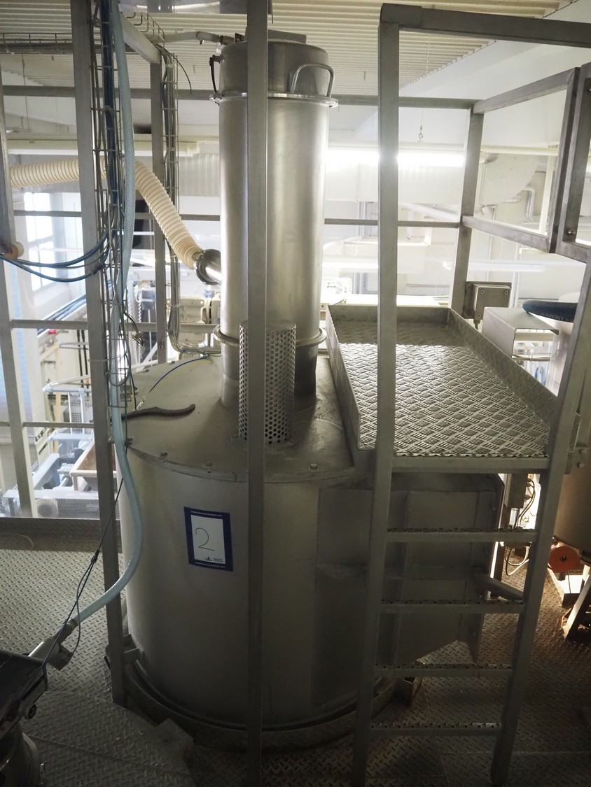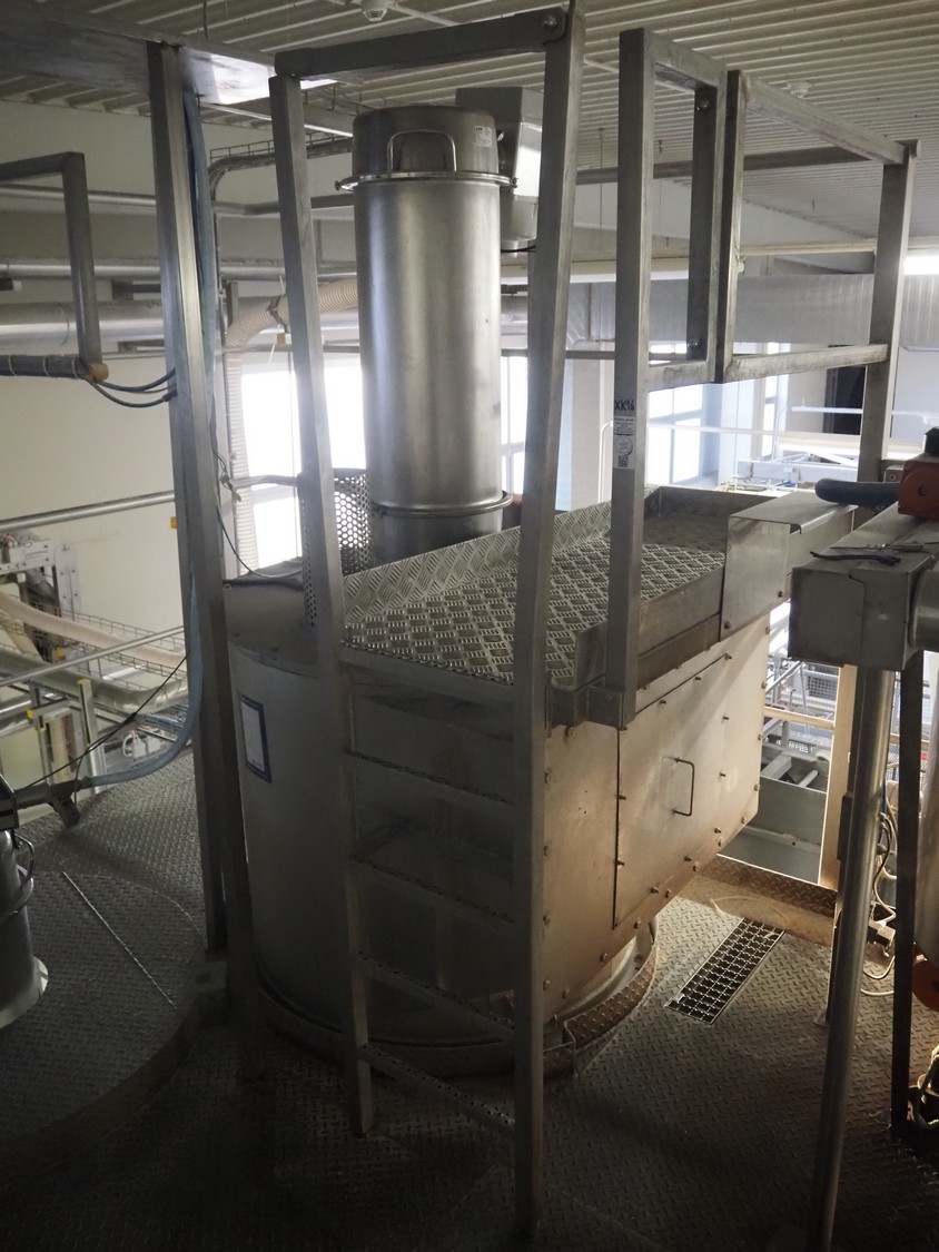 Eima GmbH infeed hopper with transport screw and outfeed hopper on weighing cells with valve, s/s screw, diameter: 180 mm, tier: 120 mm, dimensions infeed hopper with transport screw: 2500 mm x 1000 mm x 4000 mm, dimensions outfeed hopper: 1300 mm x 1300 mm x 2000 mm.