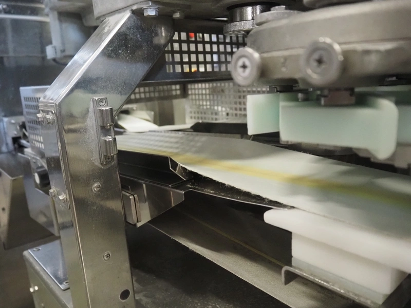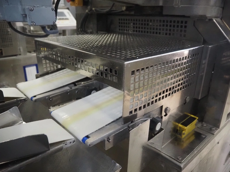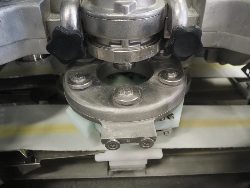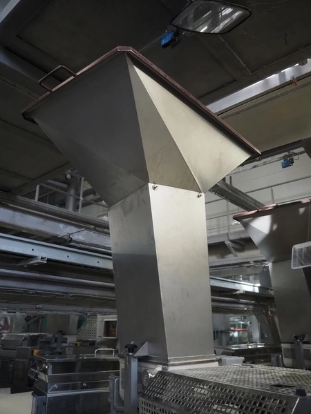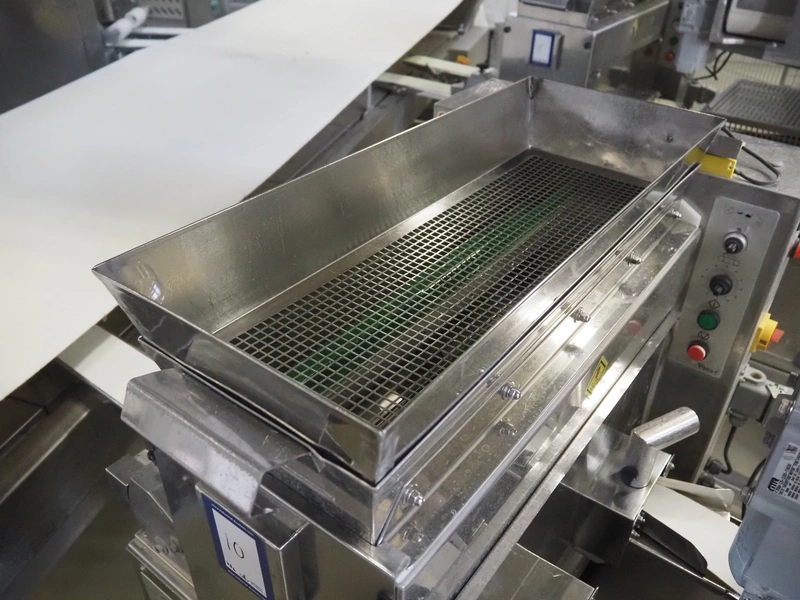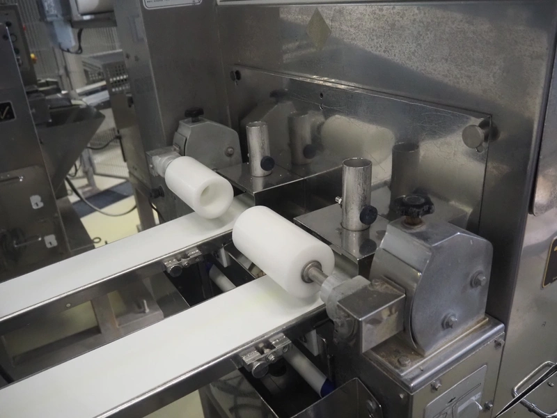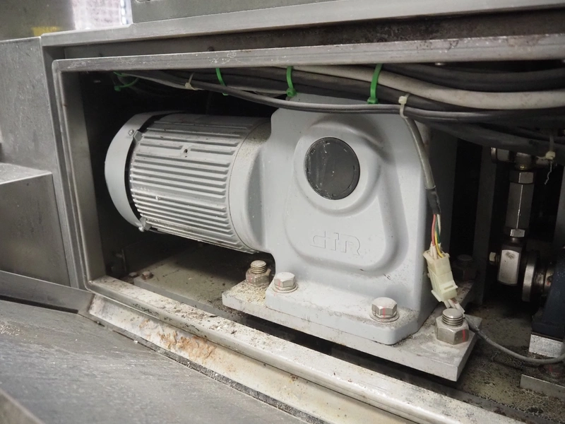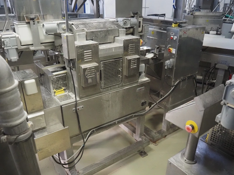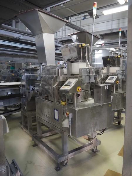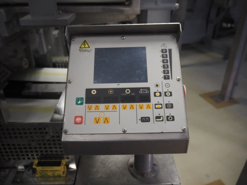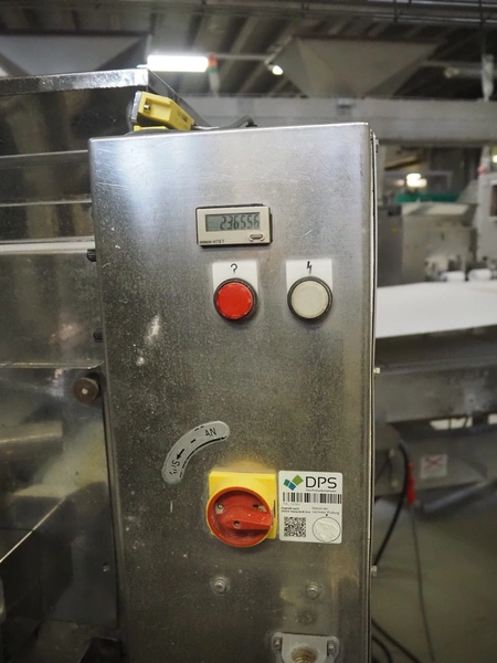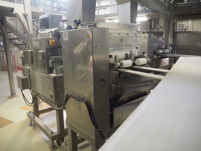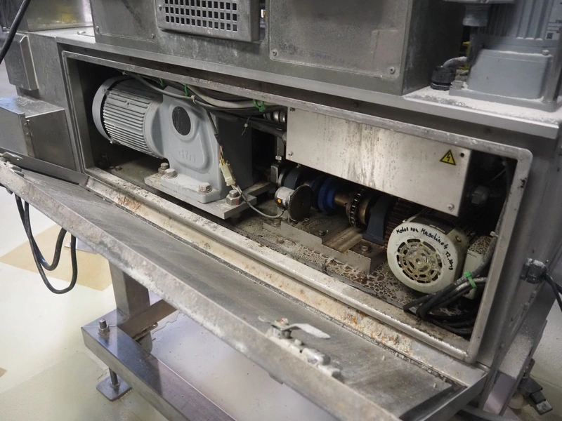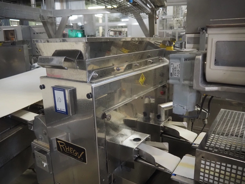 Rheon double lane encrusting machine with flour covering device, model encrusting machine: WN055, serial number: 126, year of construction: sep. 2006, 380 V, 3 Ph, 50/60 Hz, 11.3 A, 4.3 kW, plastic belt, belt width: (2x) 130 mm, total dimensions: 1700 mm x 1000 mm x 2750 mm, model flour covering device: DU220, serial number: 043, year of construction: sep. 2006, 200 V, 3 Ph, 50 Hz, 2.6 A, 0.28 kW, plastic belt, belt width: (2x) 100 mm, total dimensions: 1600 mm x 900 mm x 1750 mm.