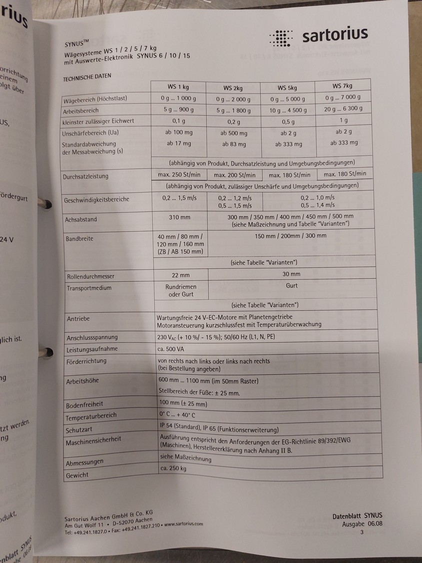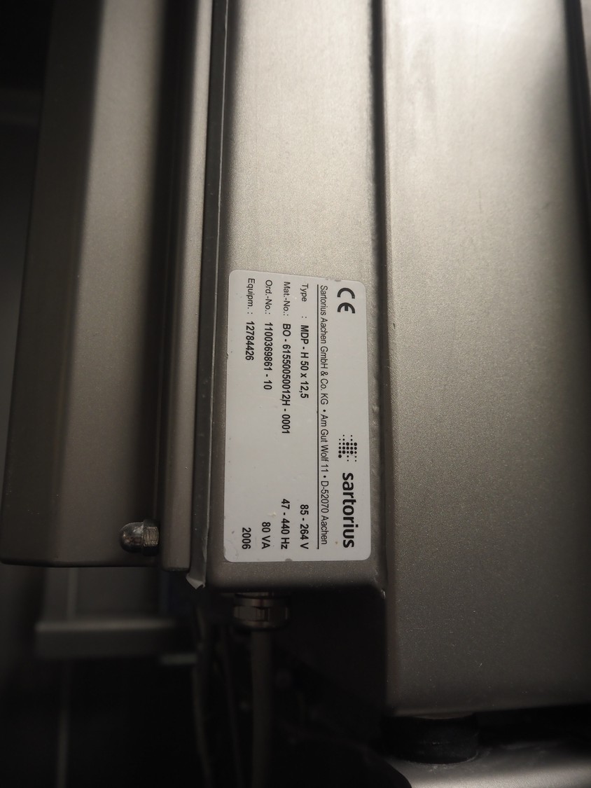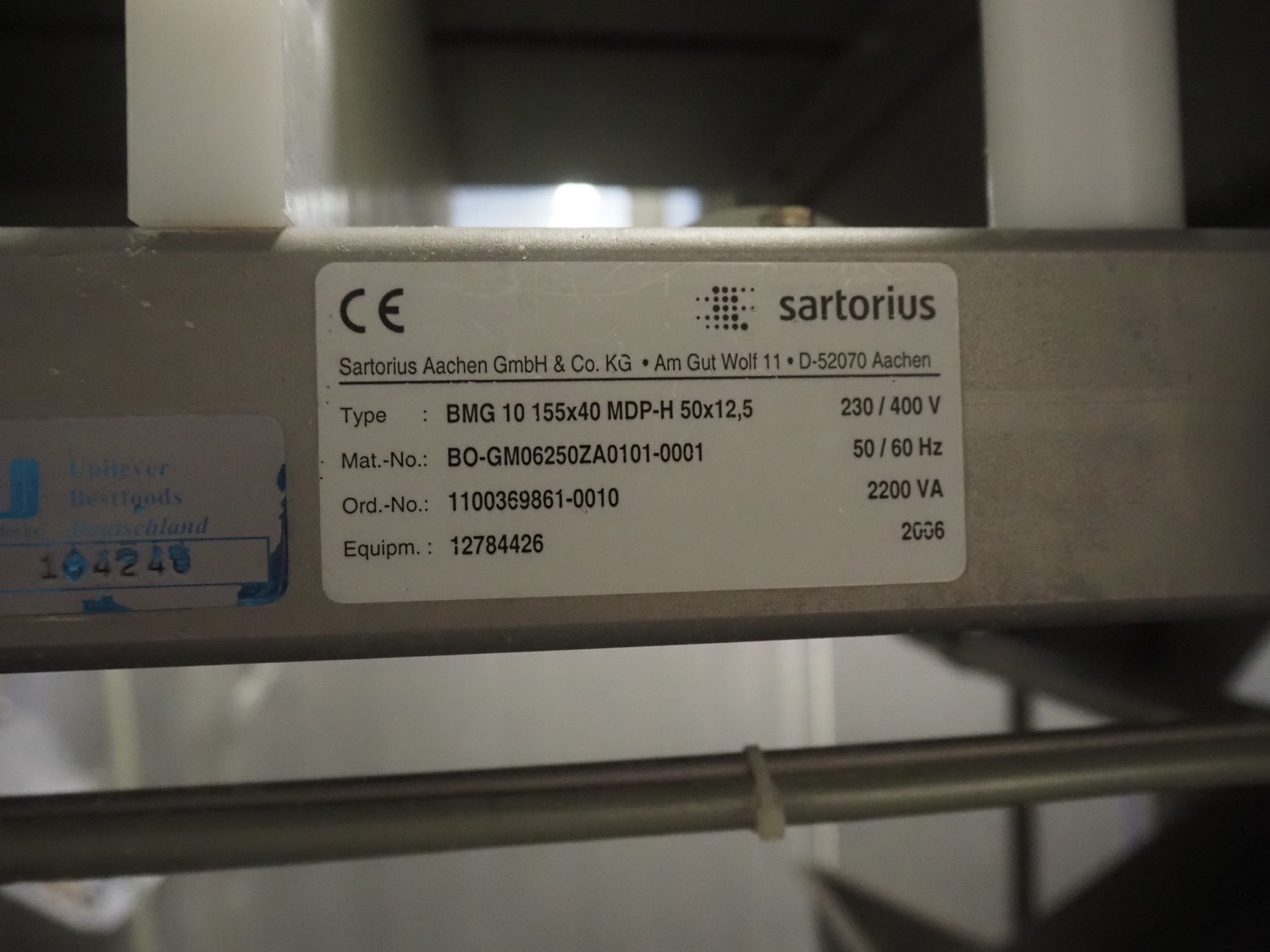 Sartorius metal detector with rejector, type: BMG 10 155x40 MDP-H 50x12.5, serial number: BOGM06250ZA0101-0001, year of construction: 2006, 230/400 V, 50/60 Hz, 2200 VA, plastic belt, belt width: 400 mm, clearance: 330 mm x 100 mm, total dimensions: 2000 mm x 800 mm x 2300 mm.