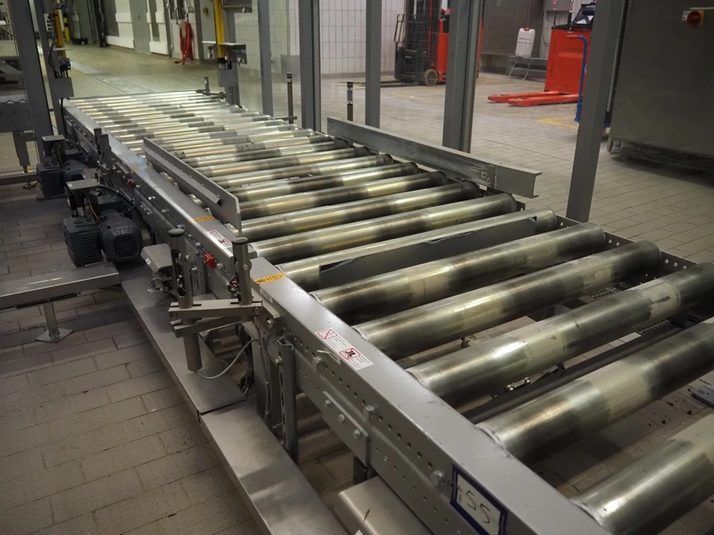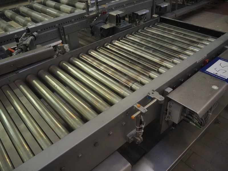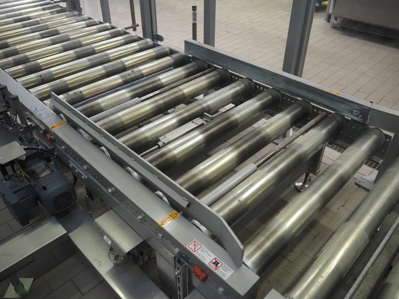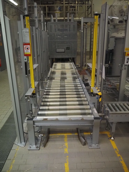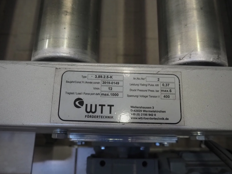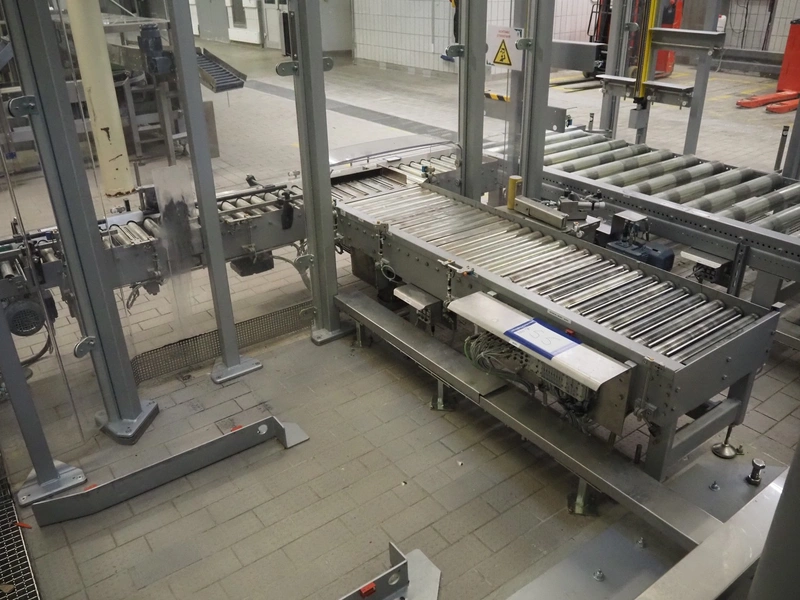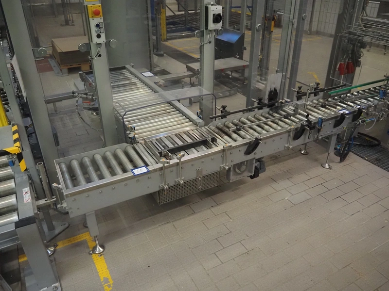 Transnova RUF / WTT Fördertechnik conveyor system with pallet de-stacker, type: 470, machine number: 1329, year of construction: 2019, 400/230 V, 50 Hz, 14.7 KVA, s/s rollers, roller width: 910 / 500 / 400 mm, dimensions de-stacker: 1800 mm x 1350 mm x 2870 mm, conveyor length: 6000 mm, 2000 mm and 3000 mm, steel switch cabinet, dimensions: 800 mm x 500 mm x 1180 mm.