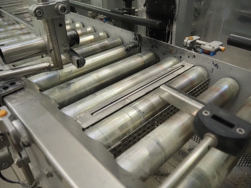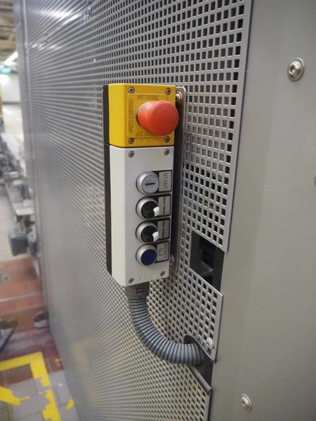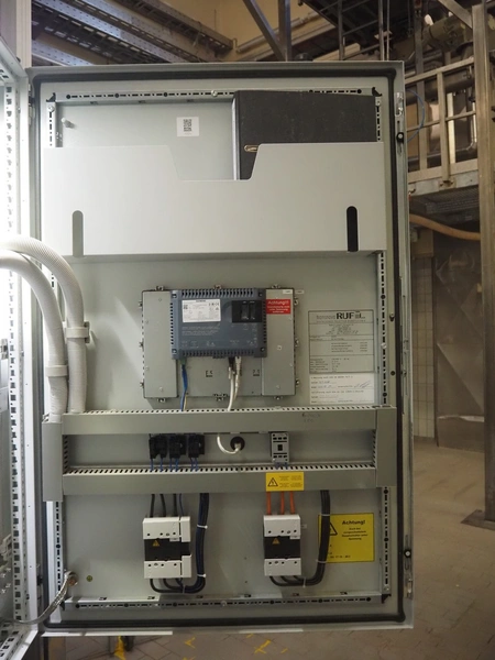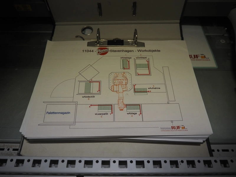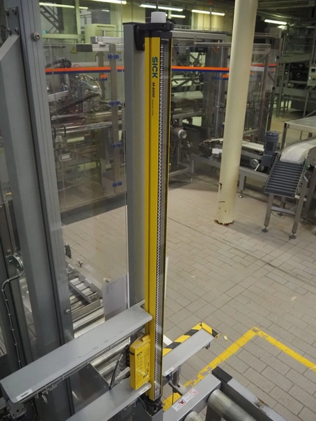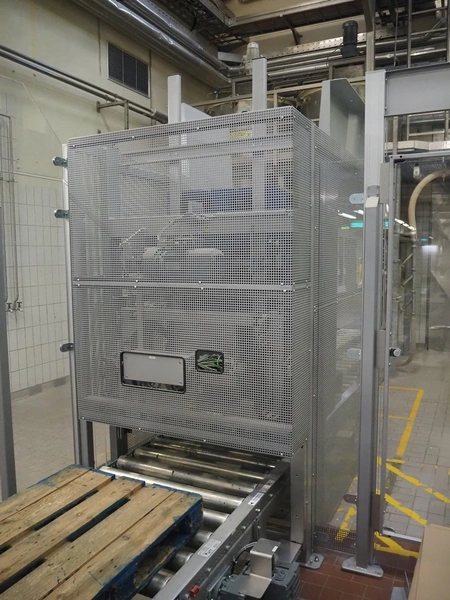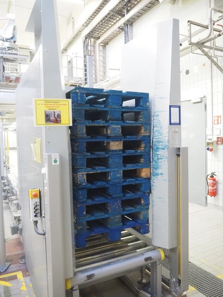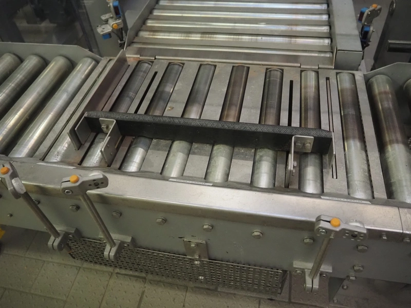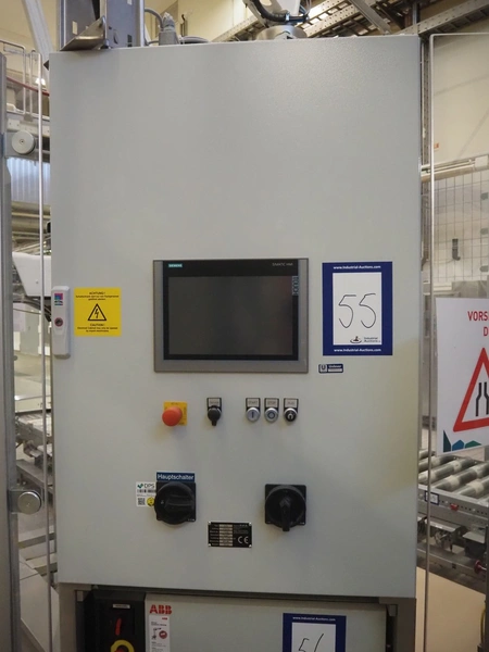 Transnova RUF / WTT Fördertechnik conveyor system with pallet de-stacker, type: 470, machine number: 1329, year of construction: 2019, 400/230 V, 50 Hz, 14.7 KVA, s/s rollers, roller width: 910 / 500 / 400 mm, dimensions de-stacker: 1800 mm x 1350 mm x 2870 mm, conveyor length: 6000 mm, 2000 mm and 3000 mm, steel switch cabinet, dimensions: 800 mm x 500 mm x 1180 mm.