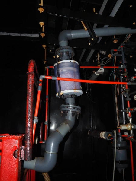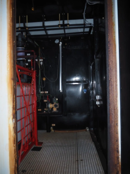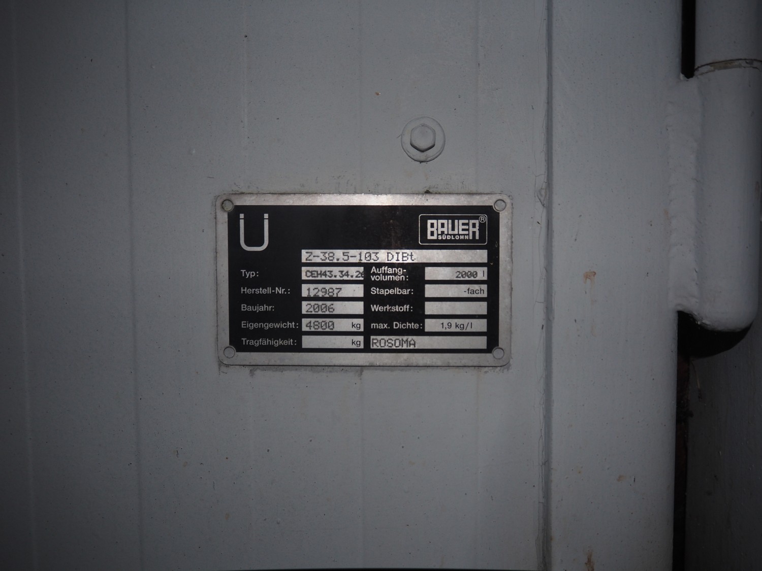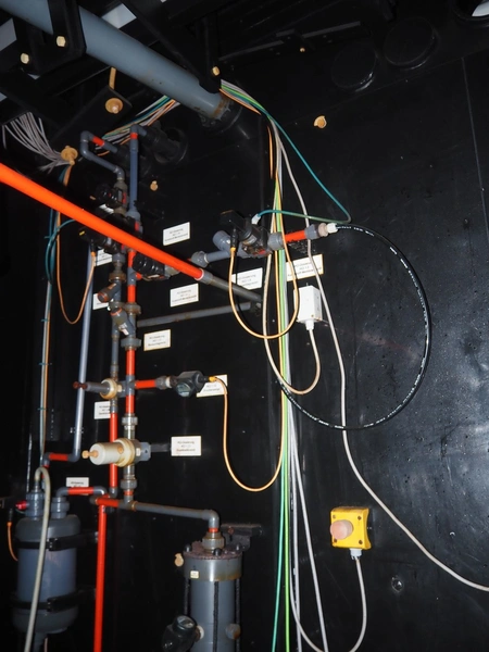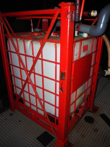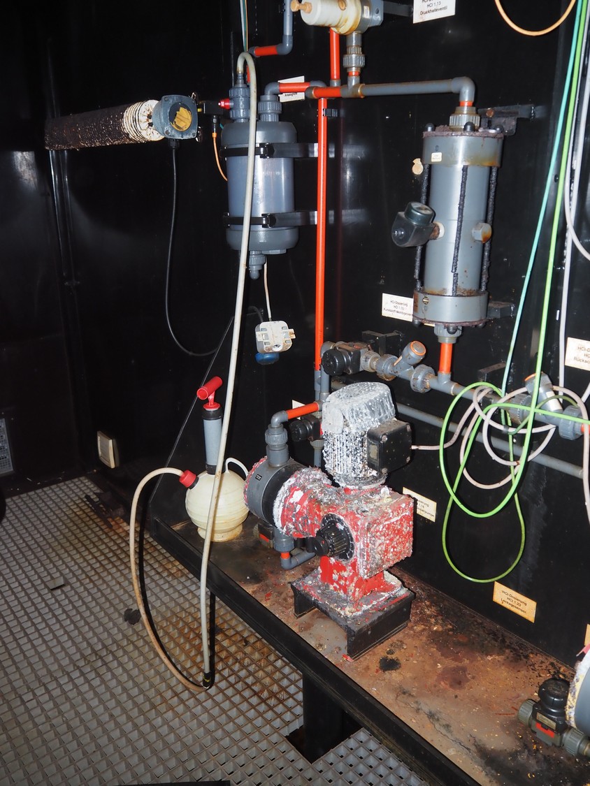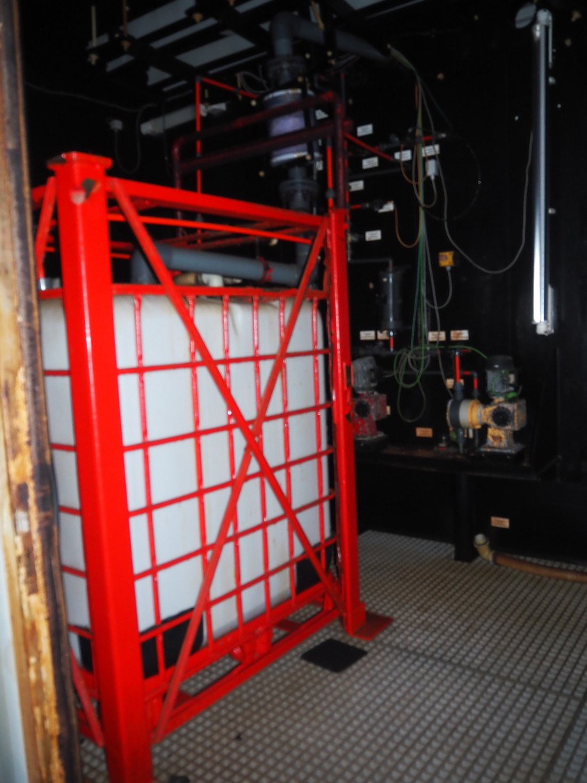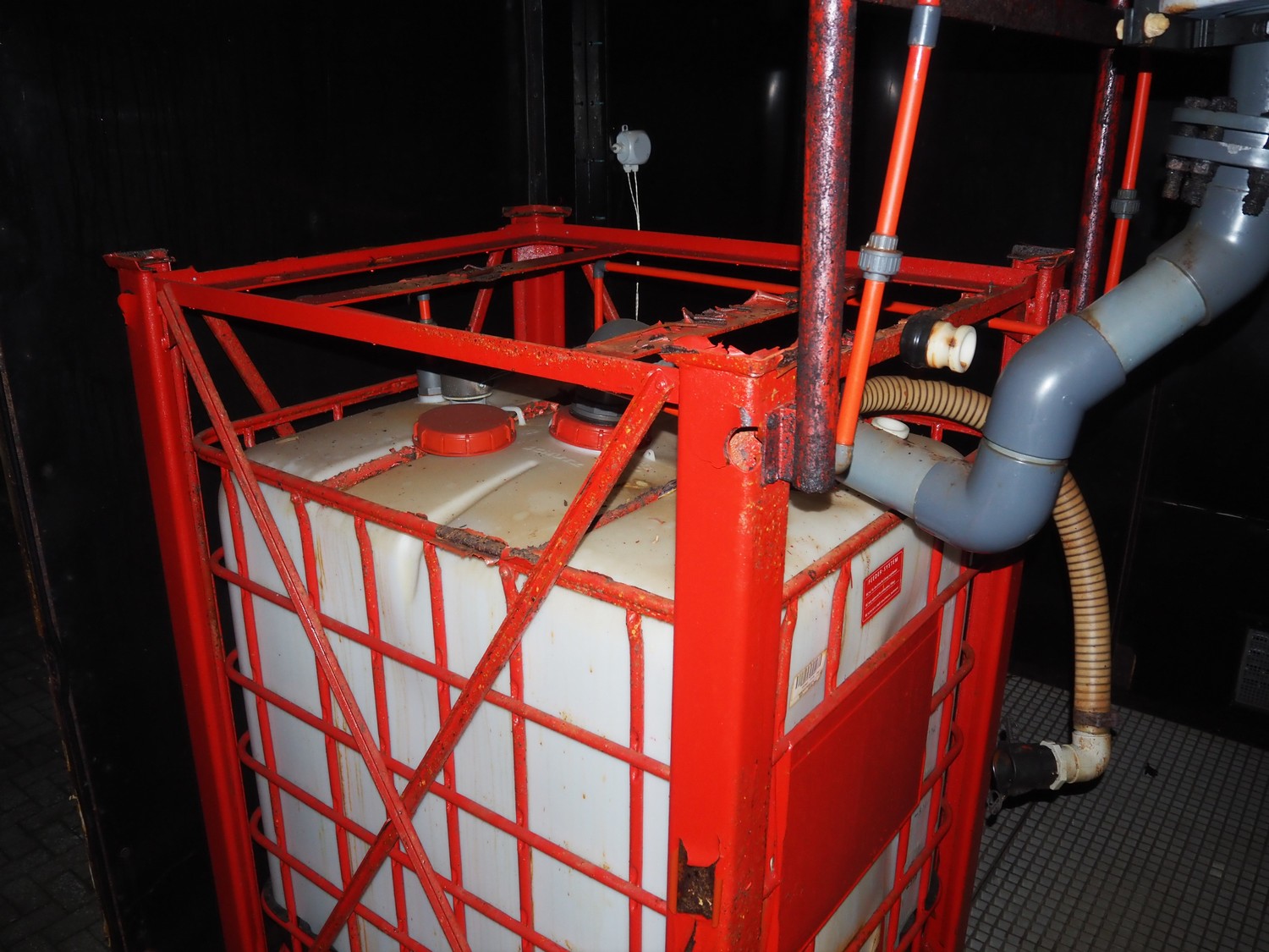 Chemical dosing system consisting of IBC tank with steel frame, dimensions: 1100 mm x 1300 mm x 1750 mm, 2 dosing pumps, s/s switch cabinet, dimensions: 800 mm x 300 mm x 1000 mm.