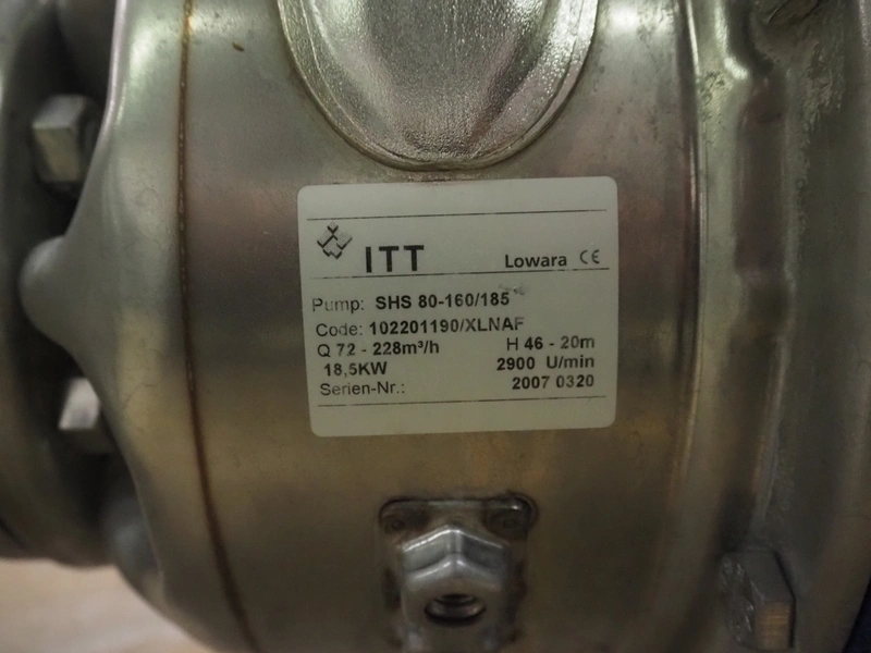 Lowara centrifugal pump, type: SHS 80-160/185, serial number: 2007 0320, capacity: 72-228 m³ per hour, dimensions: 850 mm x 350 mm x 500 mm.