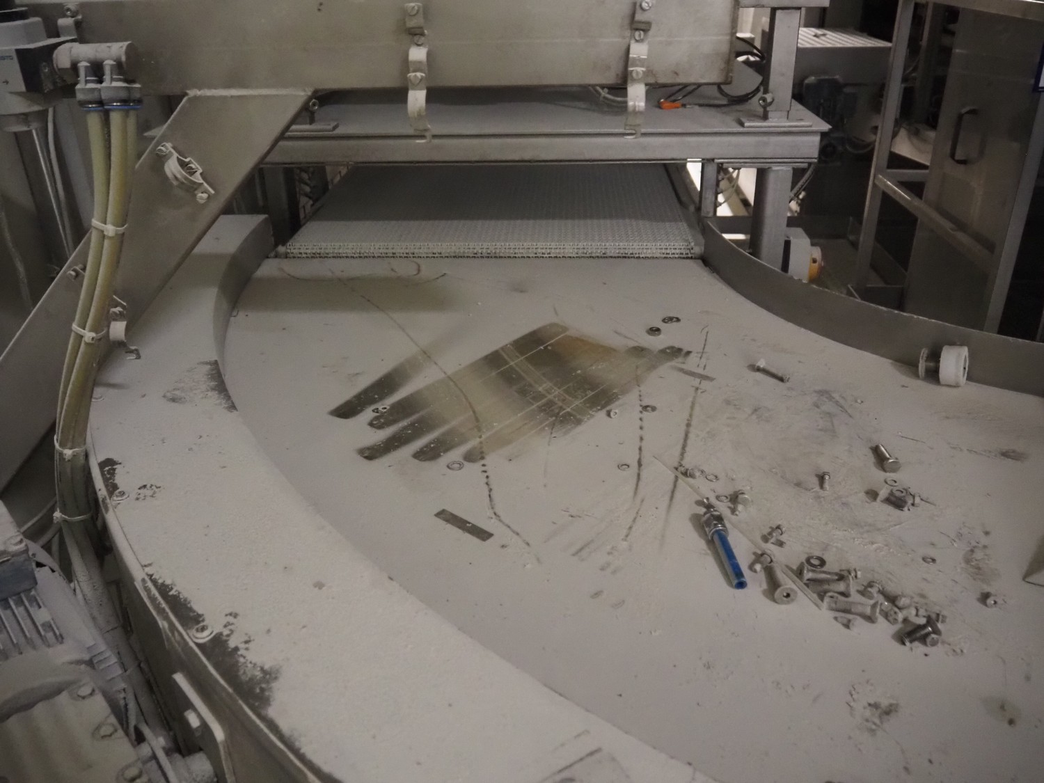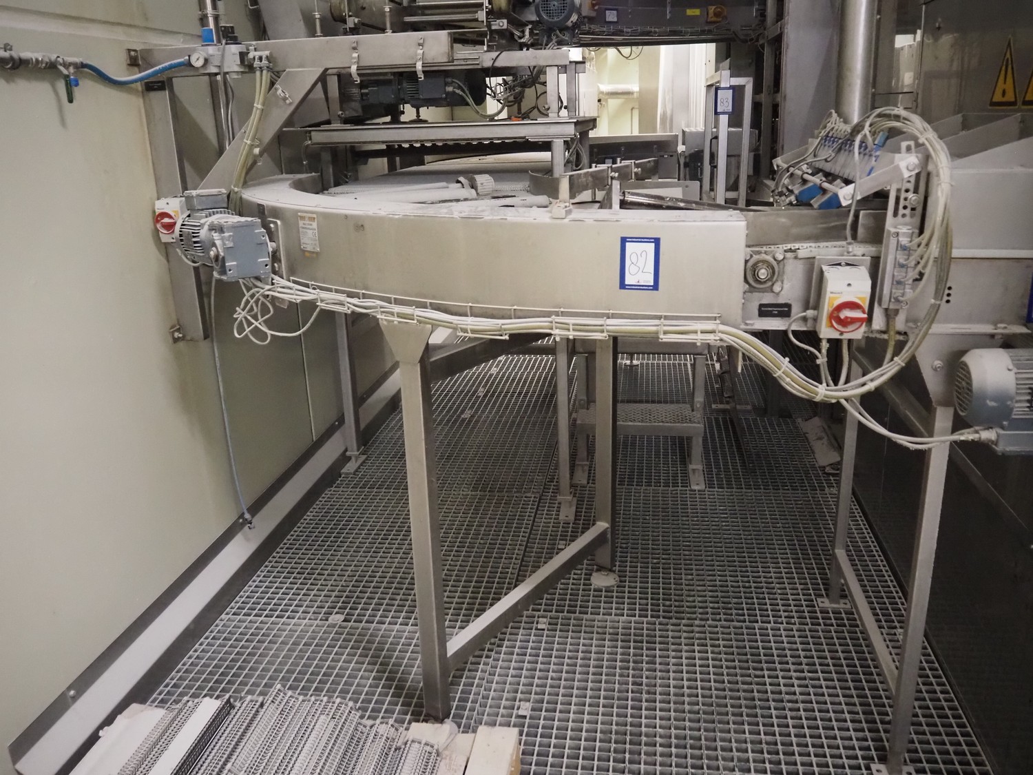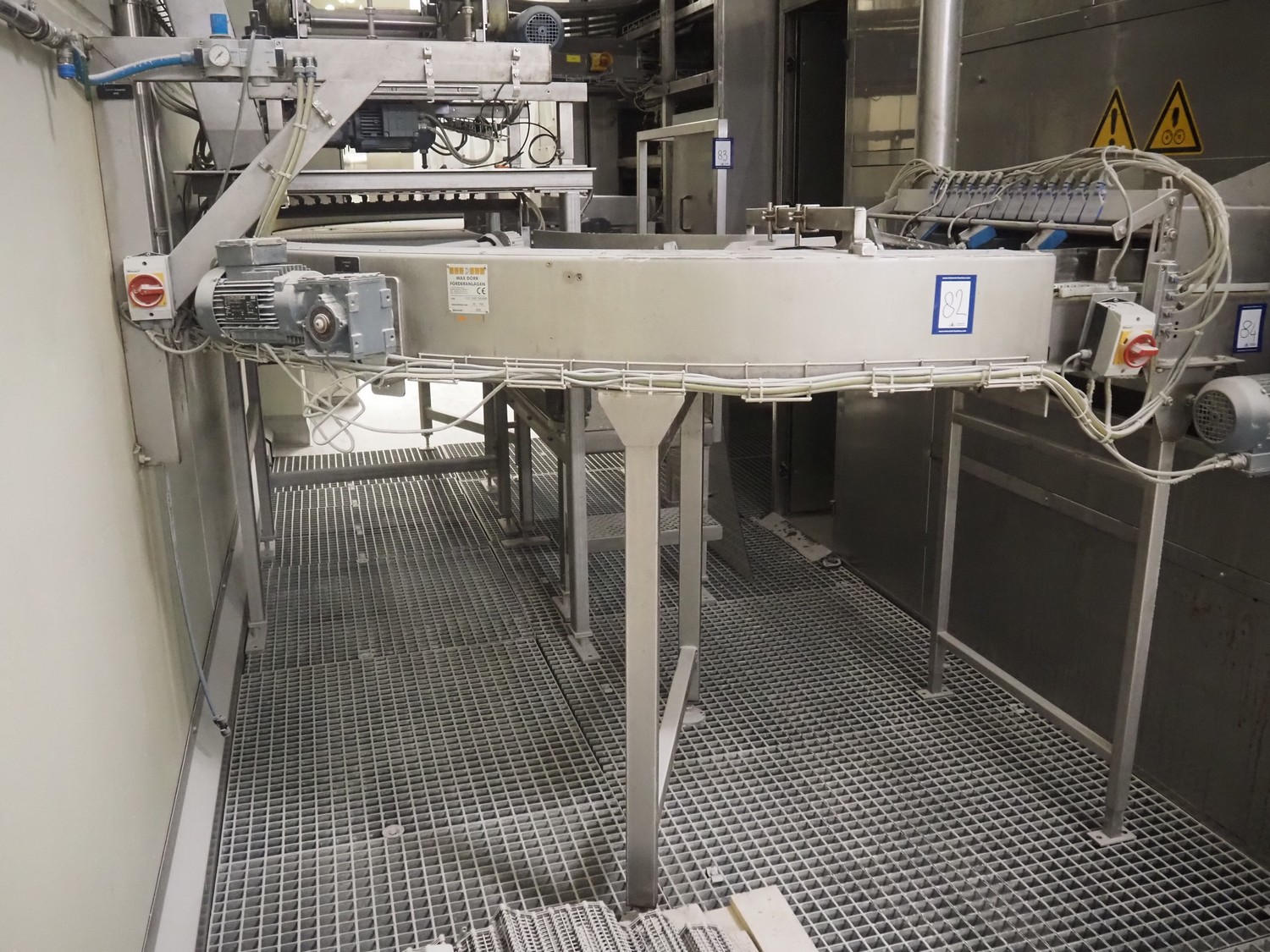 Max Dörr 90° curve conveyor, plastic belt, belt width: 800 mm, total dimensions: 1600 mm x 1500 mm x 1400 mm.
