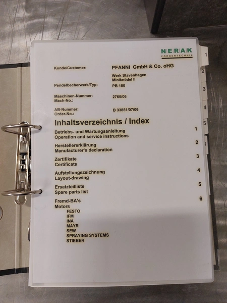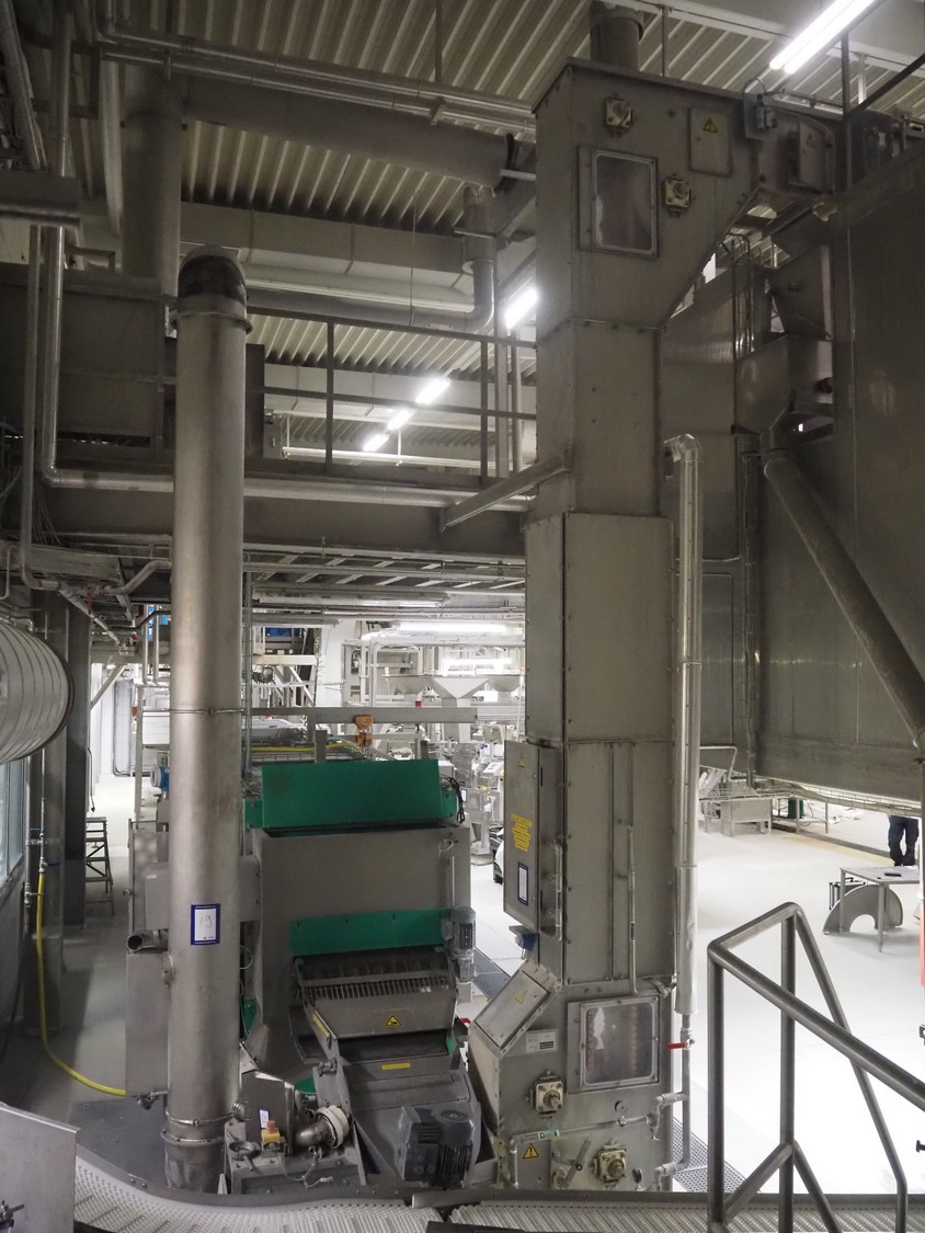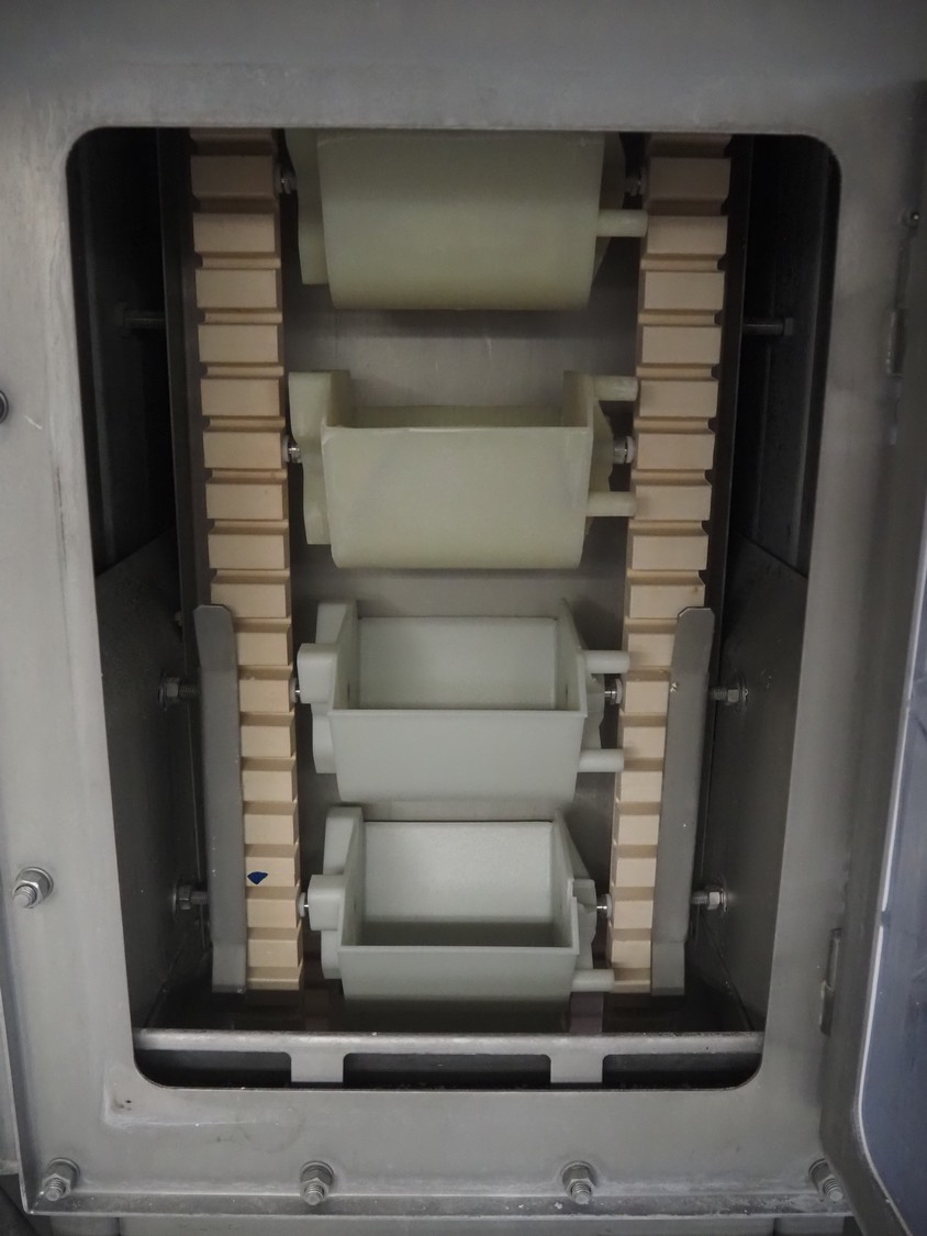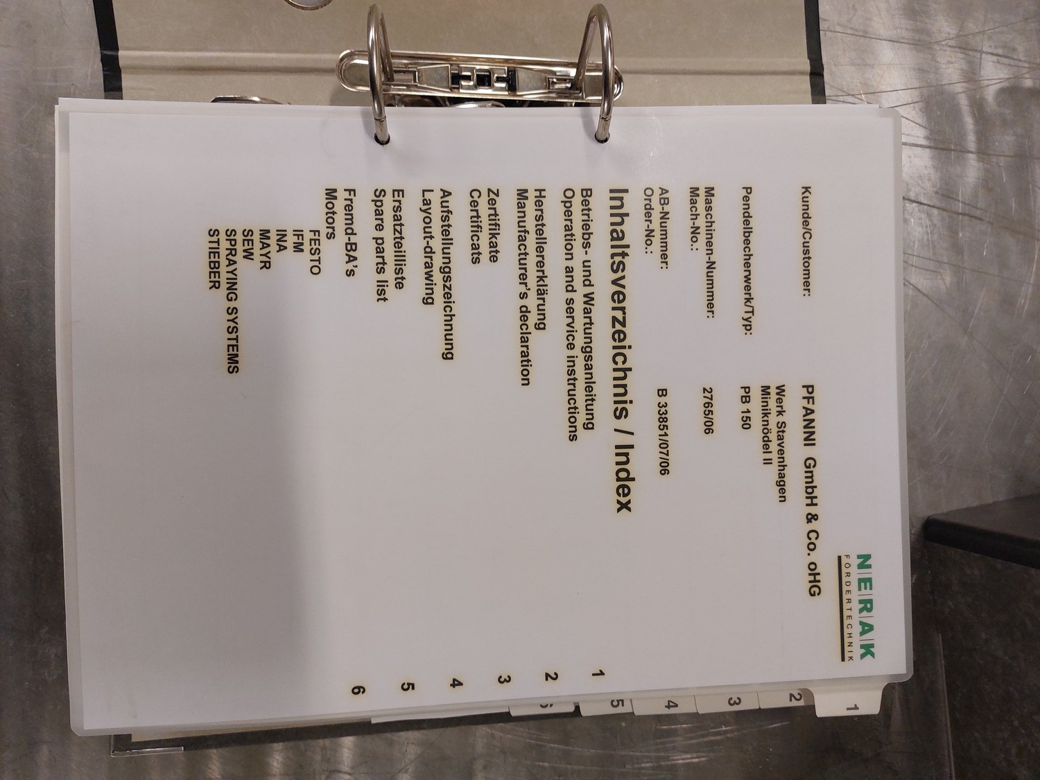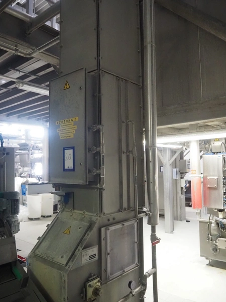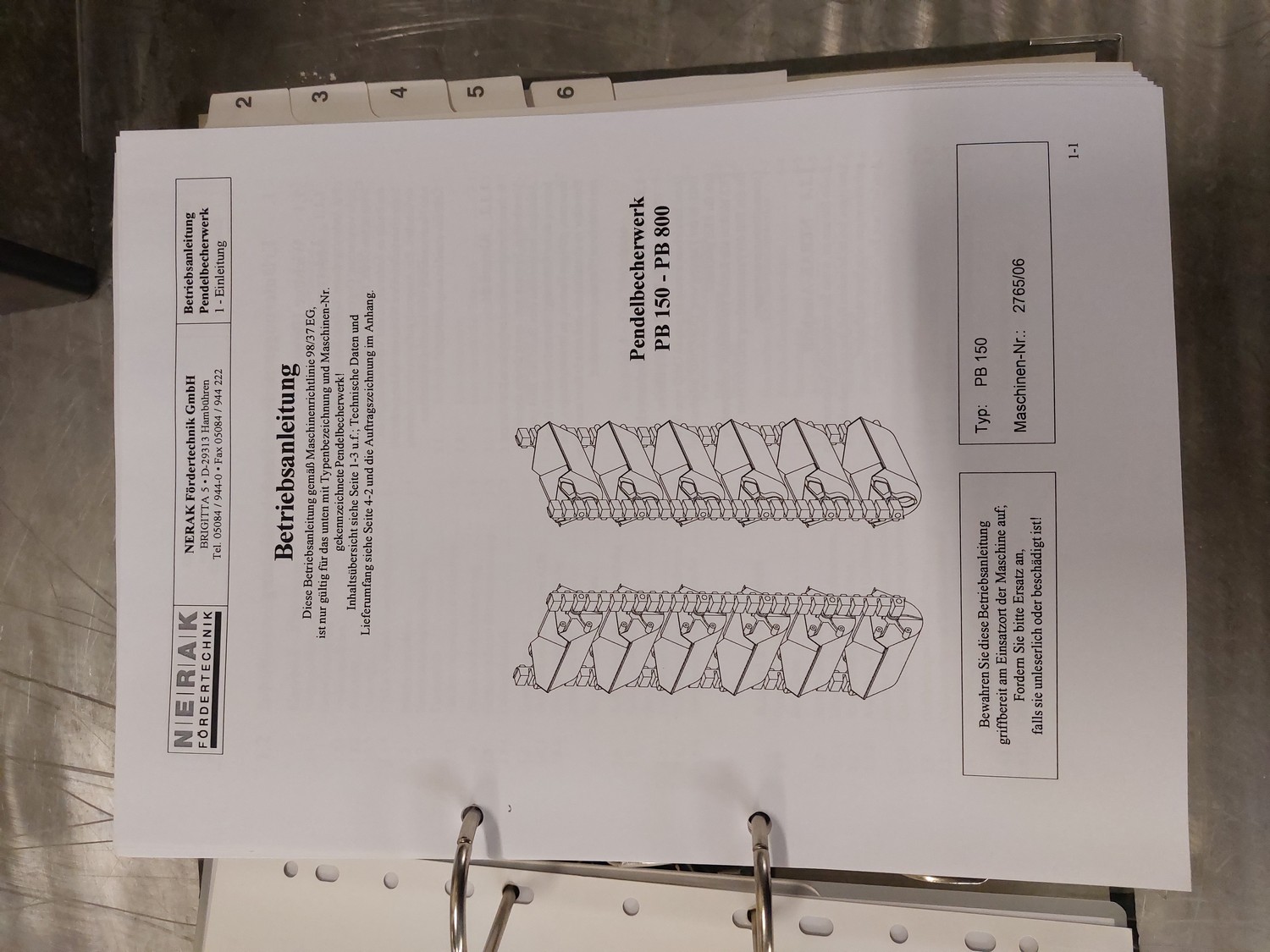 Nerak elevating belt, type: PB 150, machine number: 2765/06, year of construction: 2006, plastic bucket belt, dimensions each bucket: 190 mm x 160 mm x 140 mm, total dimensions: 4000 mm x 650 mm x 6000 mm.