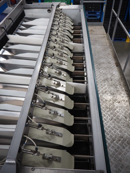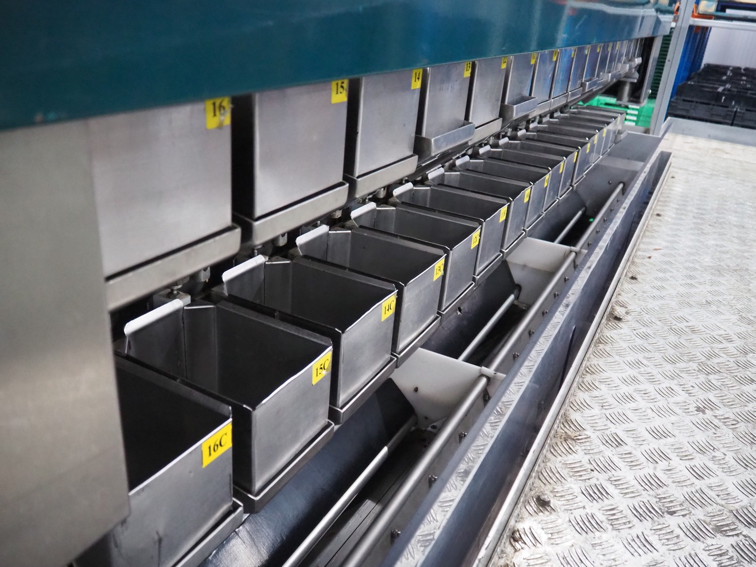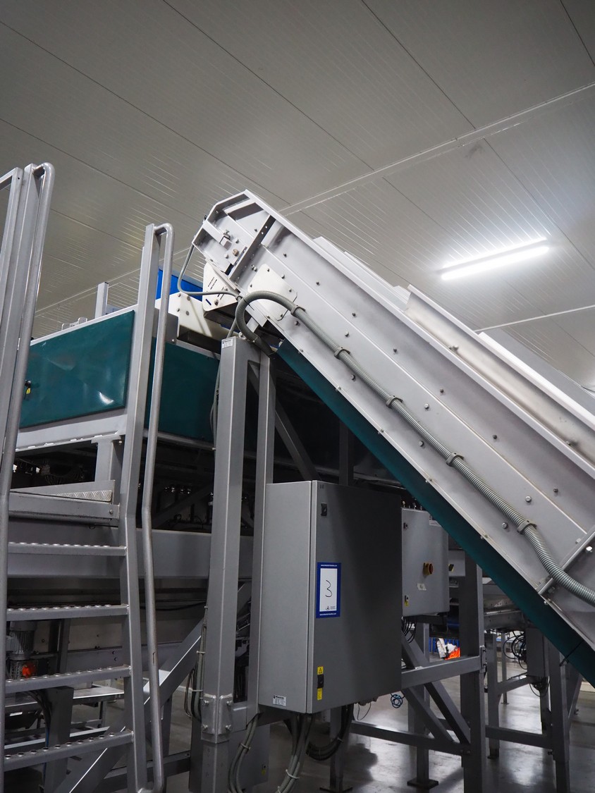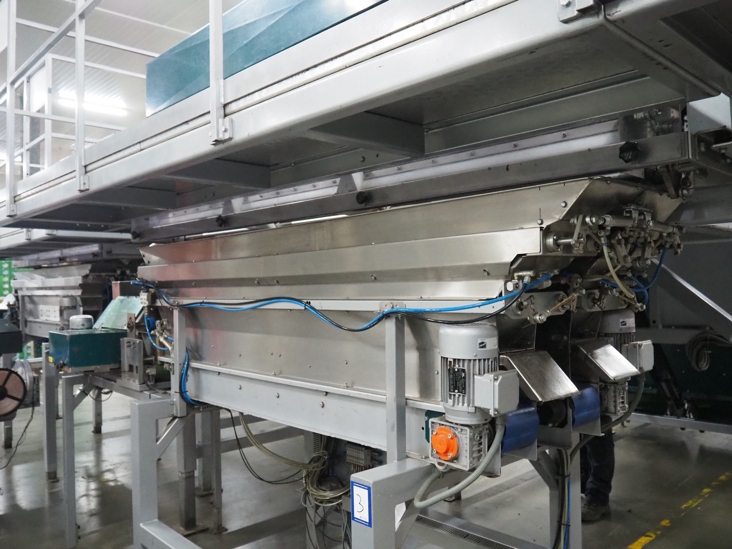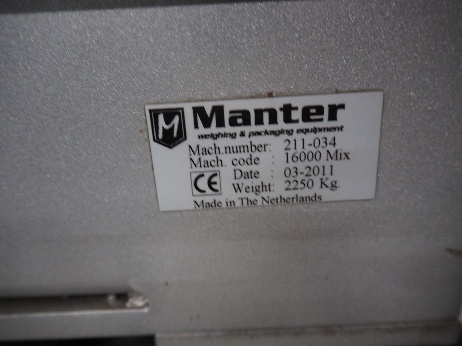 Manter linear weighing machine, type: 16000 Mix, machine number: 211-034, year of construction: 2011, 16 lanes, lane width: (16x) 140 mm, 2 outfeed belts, belt width: (2x) 150 mm, dimensions linear weighing machine: 4800 mm x 3200 mm x 3150 mm, elevating infeed belt, 3 lanes, plastic belt with dividers, belt width: 445 mm, divider height: 40 mm, distance between divides: 240 mm, elevating height: 2900 mm, dimensions elevating belt: 5200 mm x 2400 mm x 3700 mm.