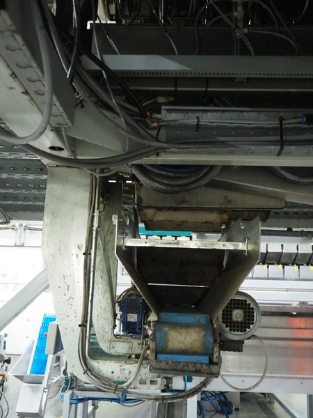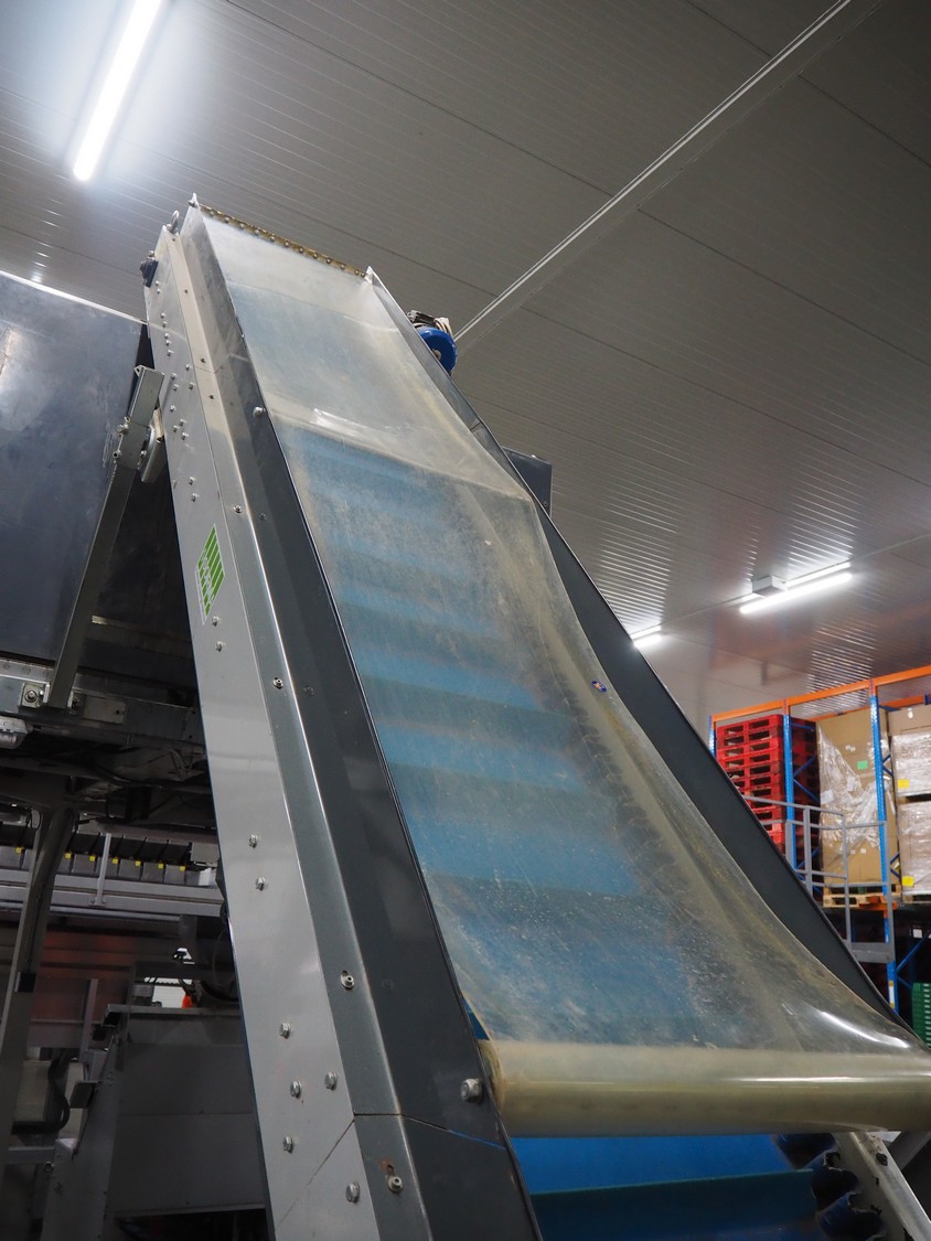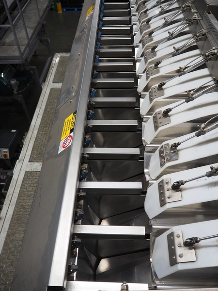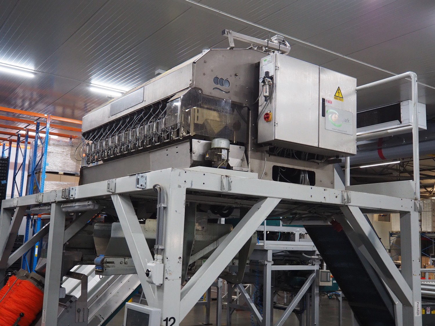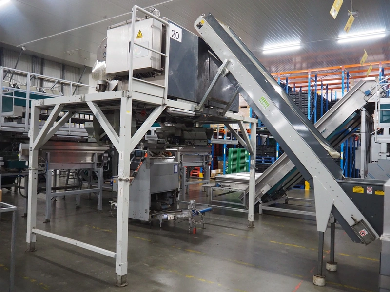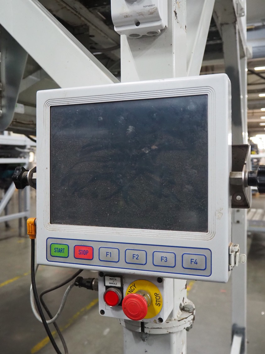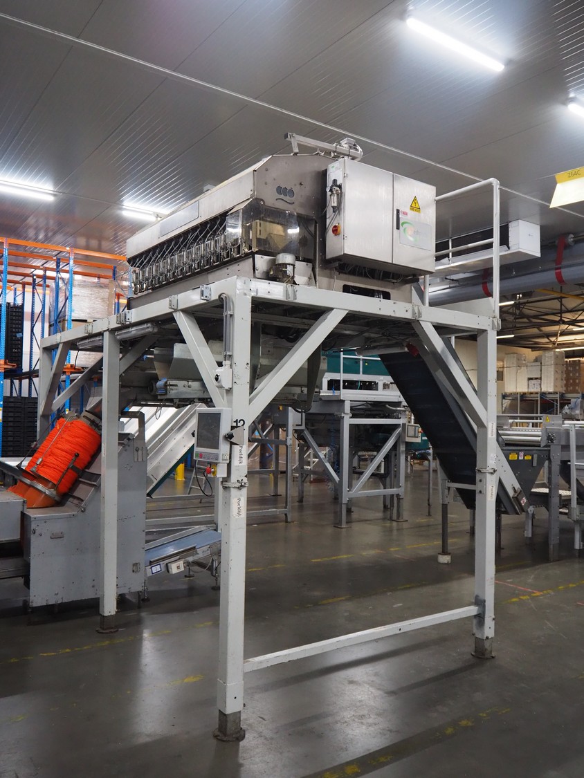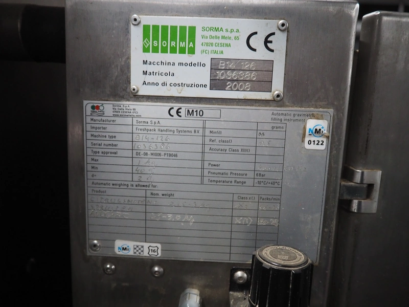 Sorma s.p.a. linear weighing machine, type: B14-126, serial number: 1036386, year of construction: 2008, weighing range: 40g-1kg, d=2g, temperature range: -10°C/+40°C, 14 lanes, lane width: (14x) 120 mm, dimensions linear weighing machine: 4150 mm x 2300 mm x 4100 mm, elevating belt, plastic belt with dividers, belt width: 500 mm, divider height: 50 mm, distance between dividers: 190 mm, elevating height: 3800 mm, dimensions elevating belt: 3200 mm x 950 mm x 4100 mm.