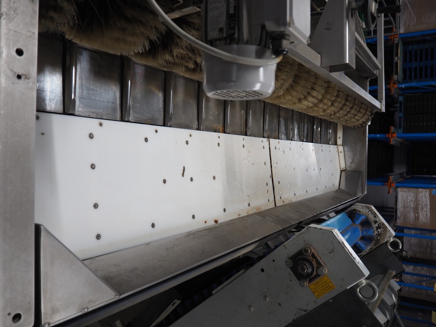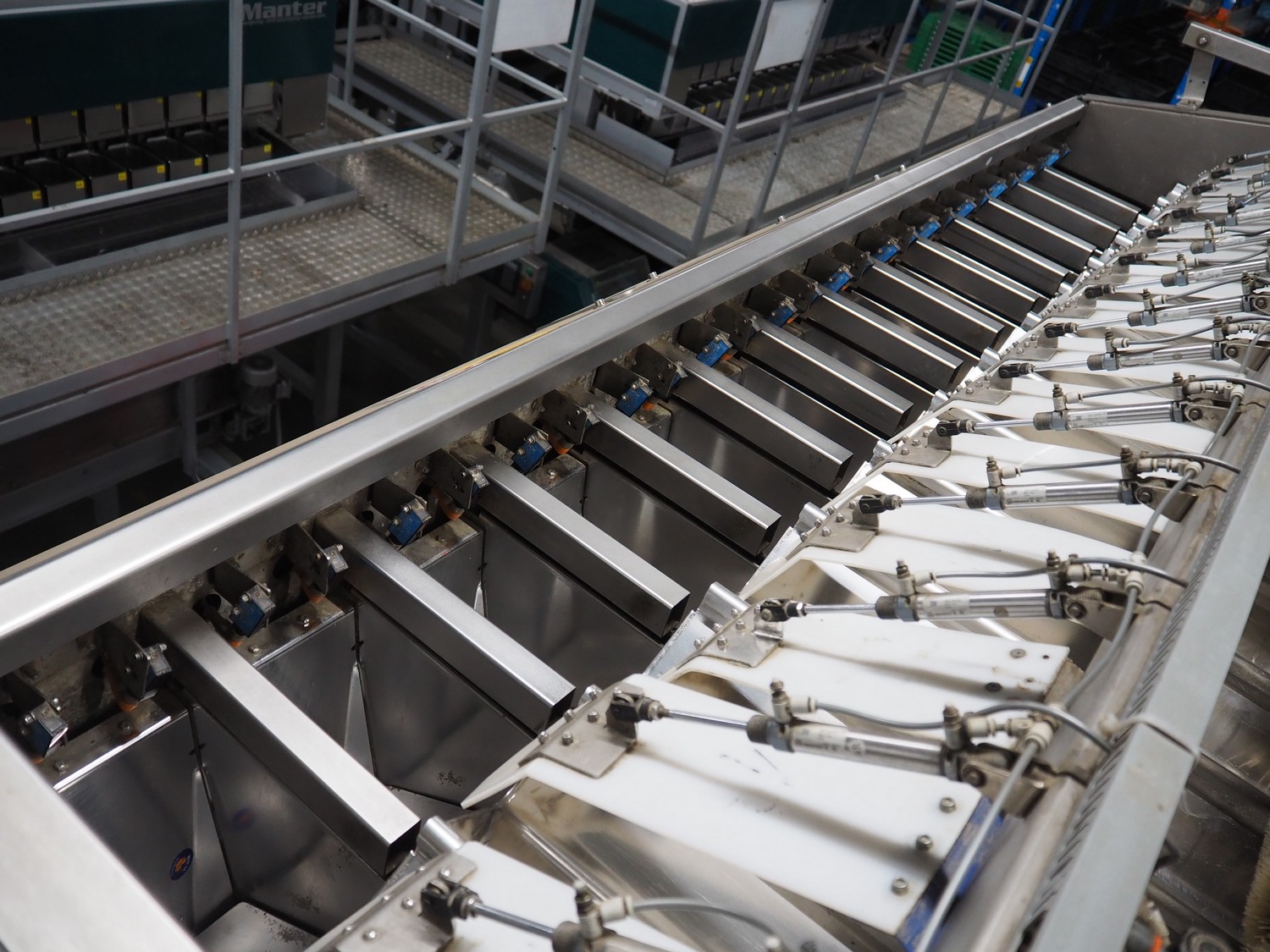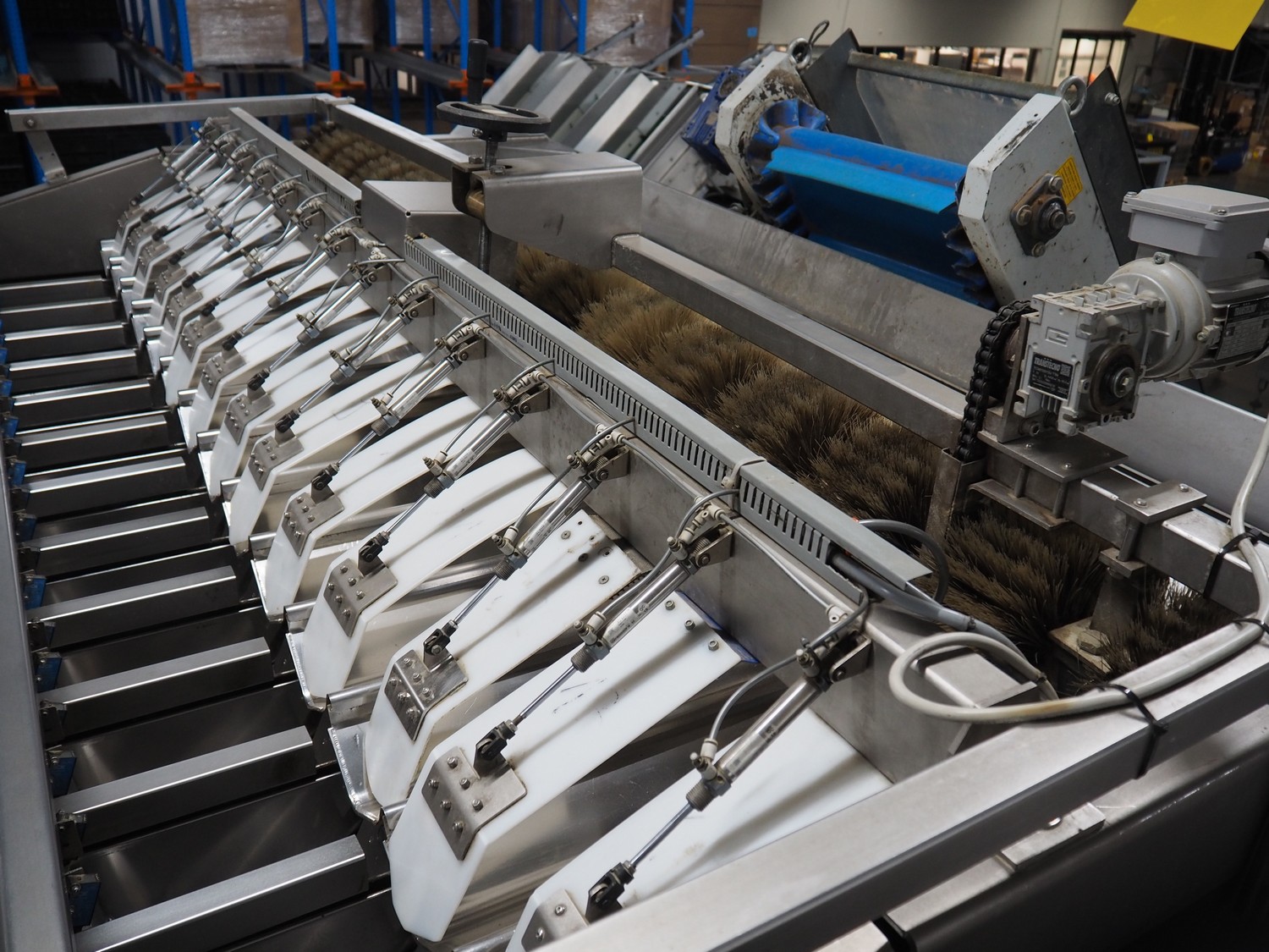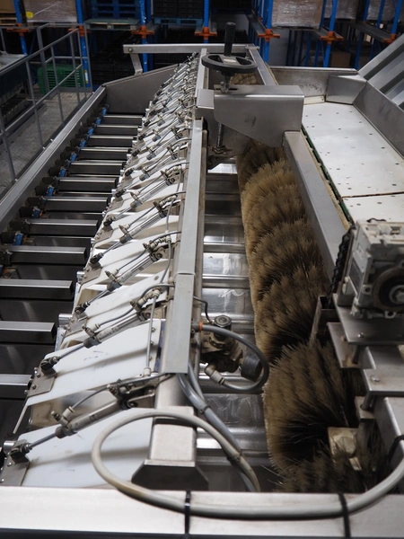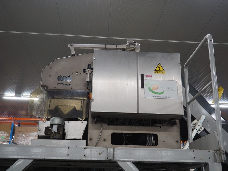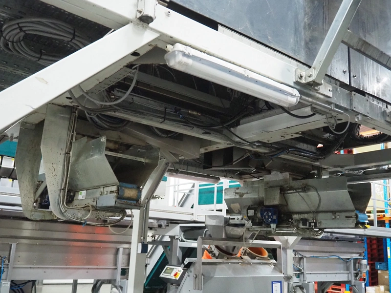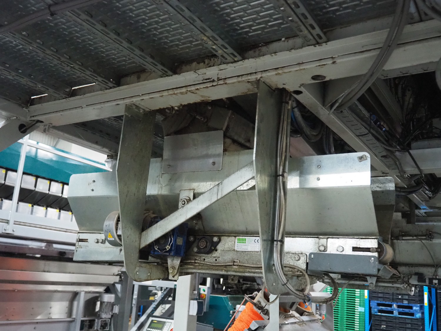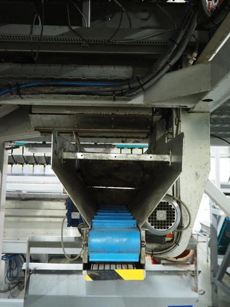 Sorma s.p.a. linear weighing machine, type: B14-126, serial number: 1036386, year of construction: 2008, weighing range: 40g-1kg, d=2g, temperature range: -10°C/+40°C, 14 lanes, lane width: (14x) 120 mm, dimensions linear weighing machine: 4150 mm x 2300 mm x 4100 mm, elevating belt, plastic belt with dividers, belt width: 500 mm, divider height: 50 mm, distance between dividers: 190 mm, elevating height: 3800 mm, dimensions elevating belt: 3200 mm x 950 mm x 4100 mm.