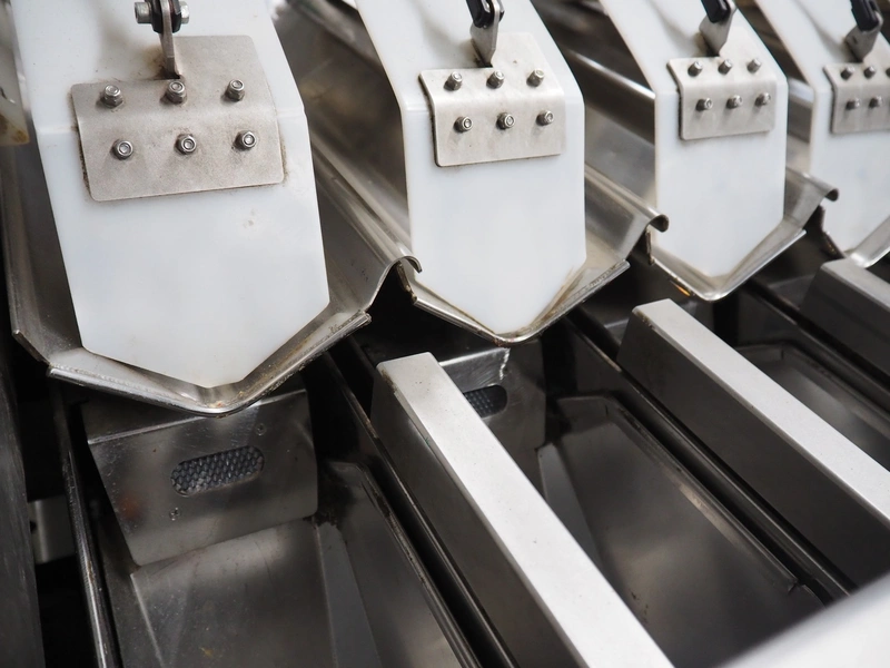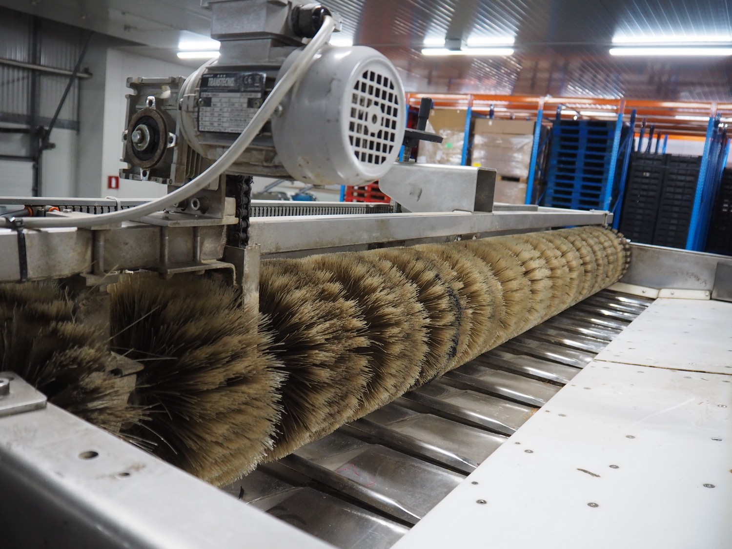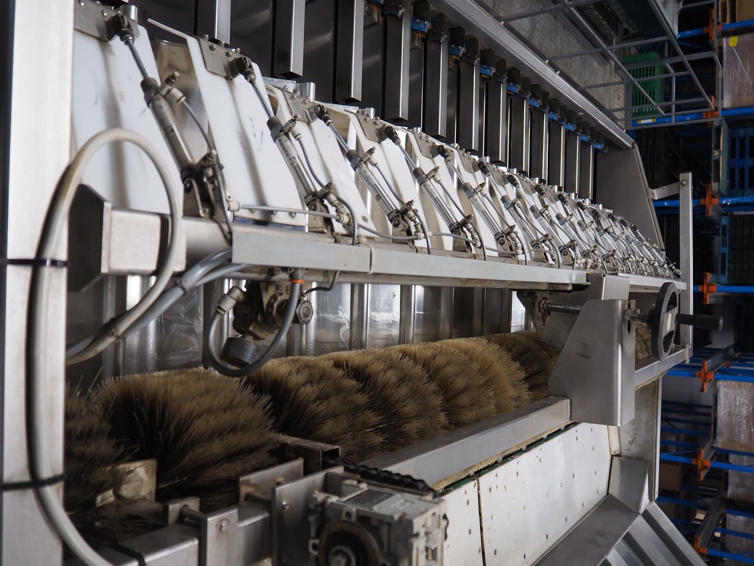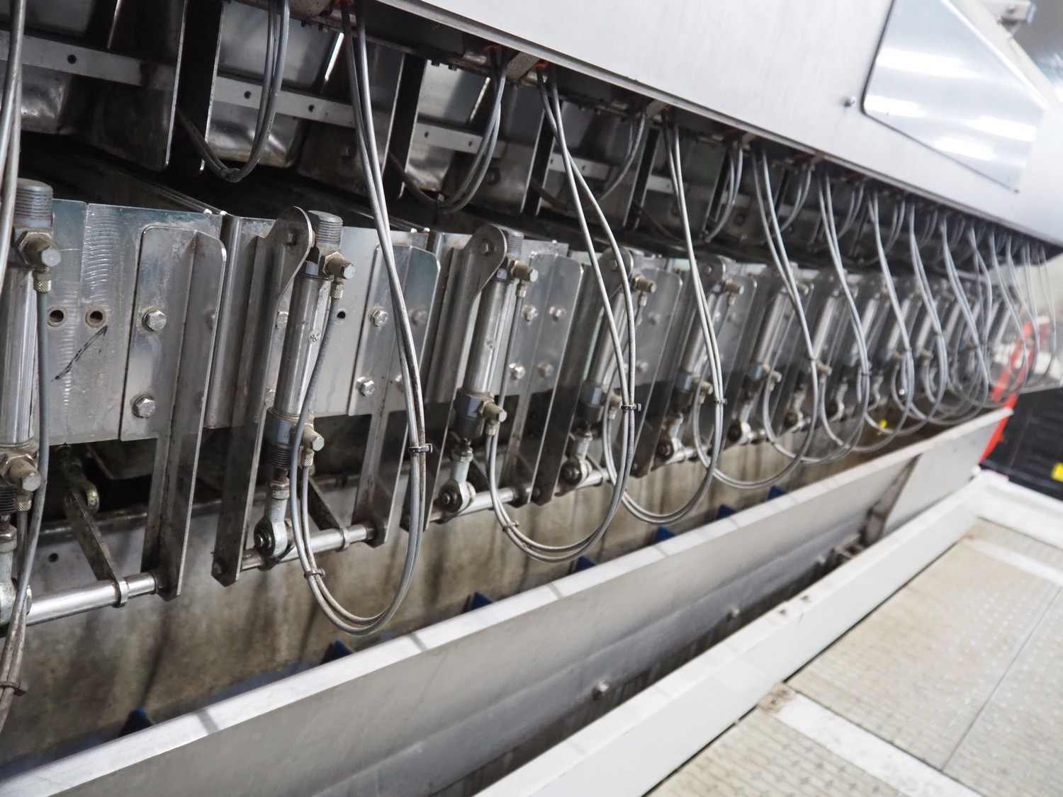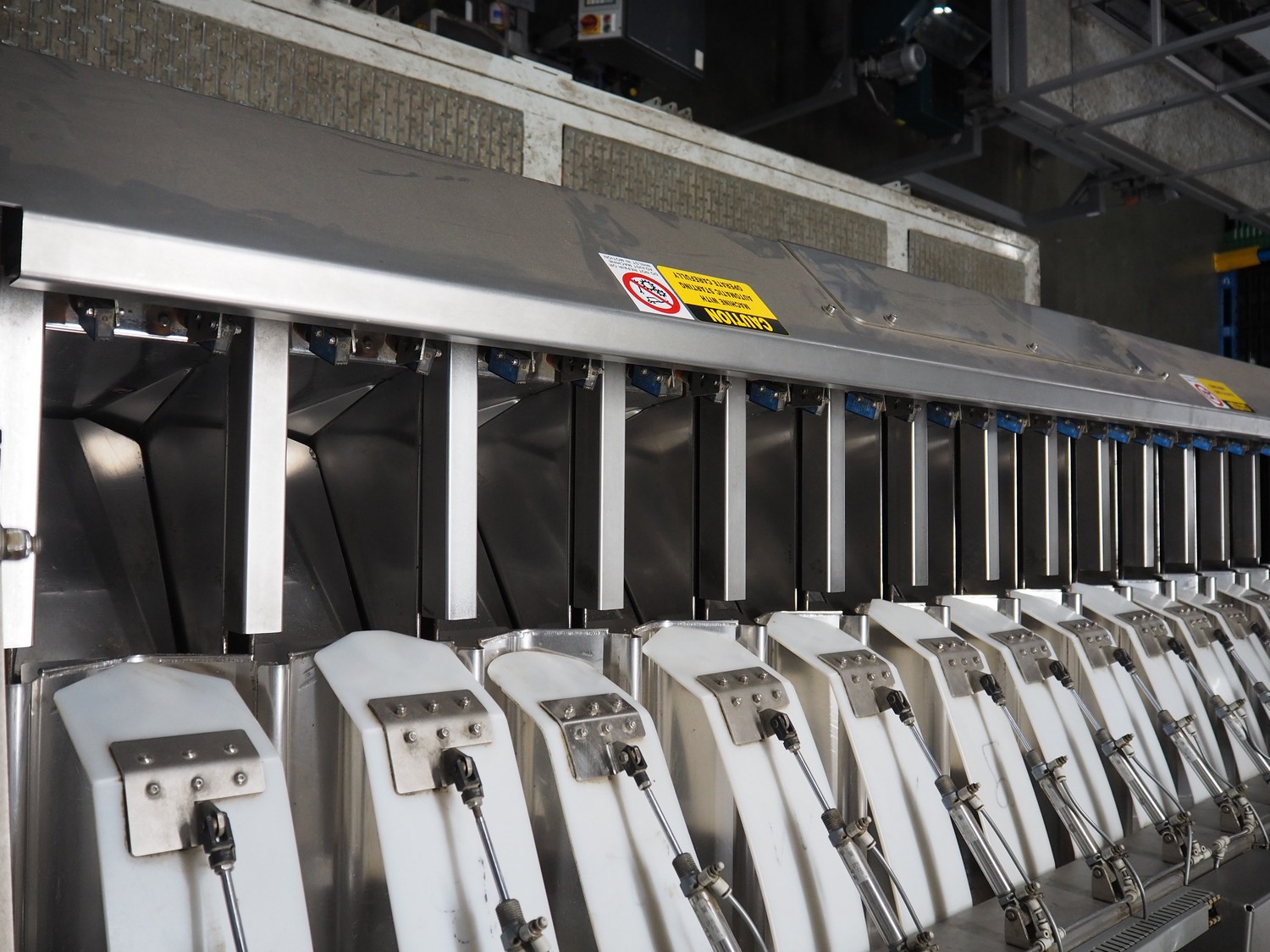 Sorma s.p.a. linear weighing machine, type: B14-126, serial number: 1036386, year of construction: 2008, weighing range: 40g-1kg, d=2g, temperature range: -10°C/+40°C, 14 lanes, lane width: (14x) 120 mm, dimensions linear weighing machine: 4150 mm x 2300 mm x 4100 mm, elevating belt, plastic belt with dividers, belt width: 500 mm, divider height: 50 mm, distance between dividers: 190 mm, elevating height: 3800 mm, dimensions elevating belt: 3200 mm x 950 mm x 4100 mm.