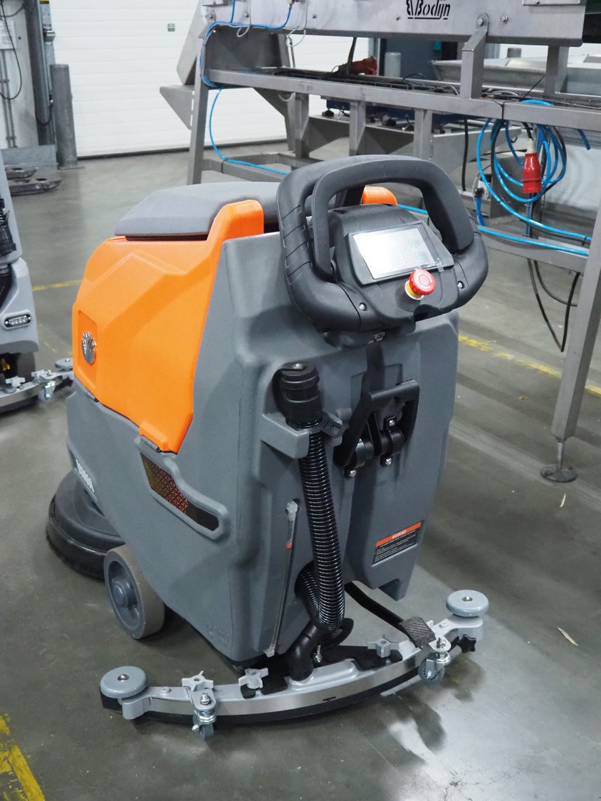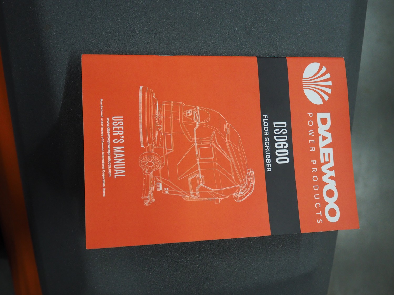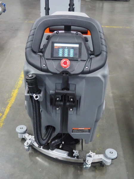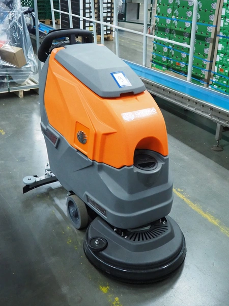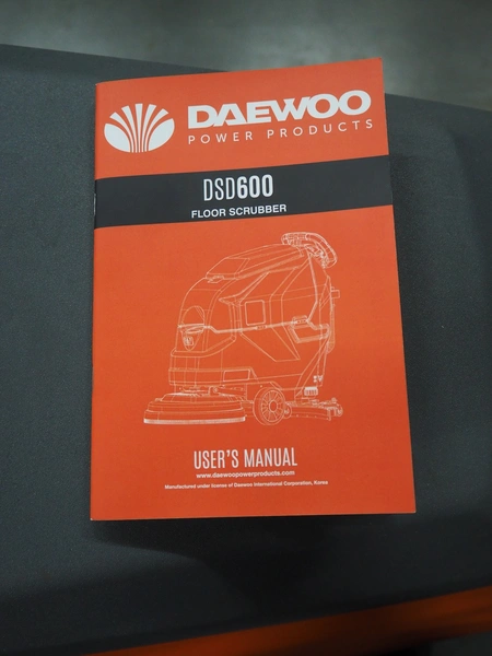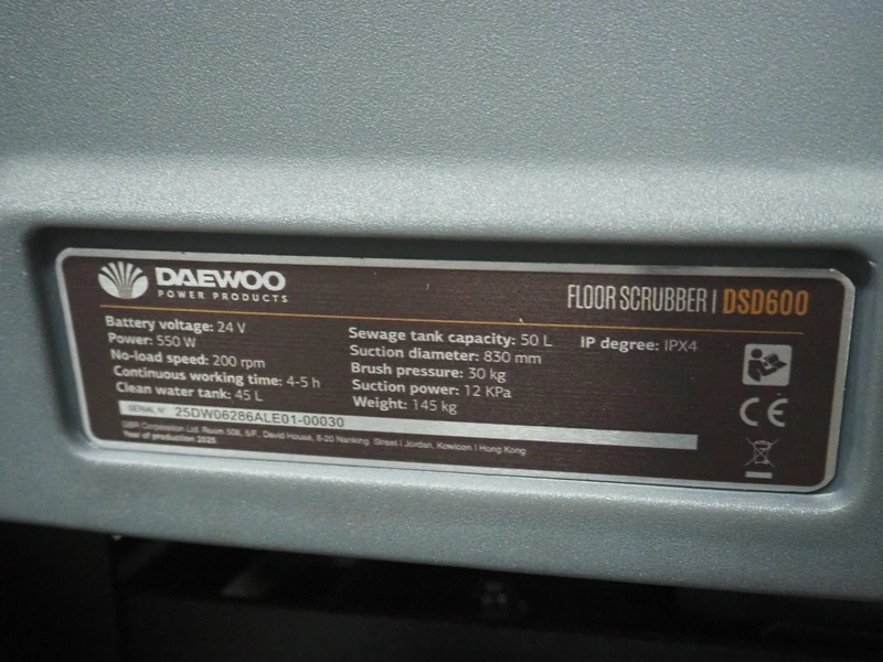 Daewoo floor scrubbing machine, type: DSD600, serial number: 25DW06286ALE01-00033, year of construction: 2025, battery voltage: 24 V, power: 550 W, No-load speed: 200 rpm, continuous working time: 4-5 h, clean water tank: 45 litres, sewage tank capacity: 50 litres, suction diameter: 830 mm, brush pressure: 30 kg, suction power: 12 KPa, weight: 145 kg, dimensions: 1250 mm x 800 mm x 1100 mm. Including battery charger. New.