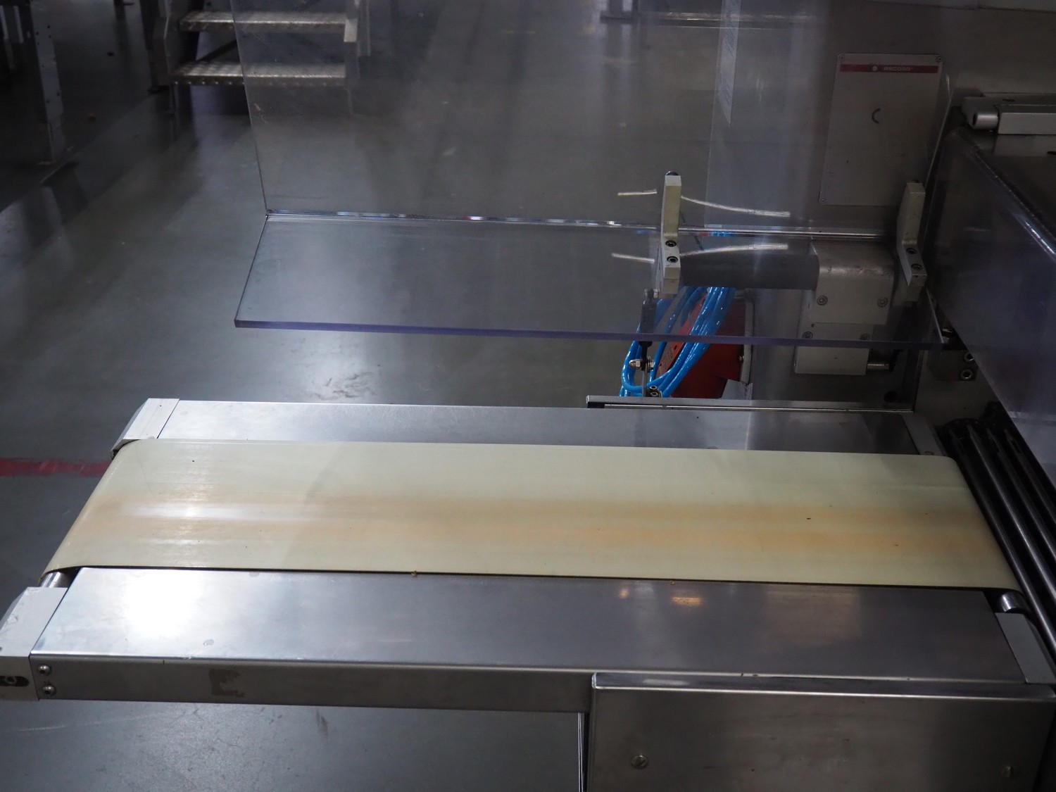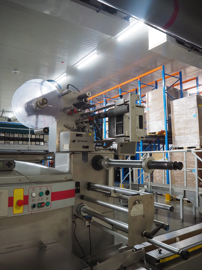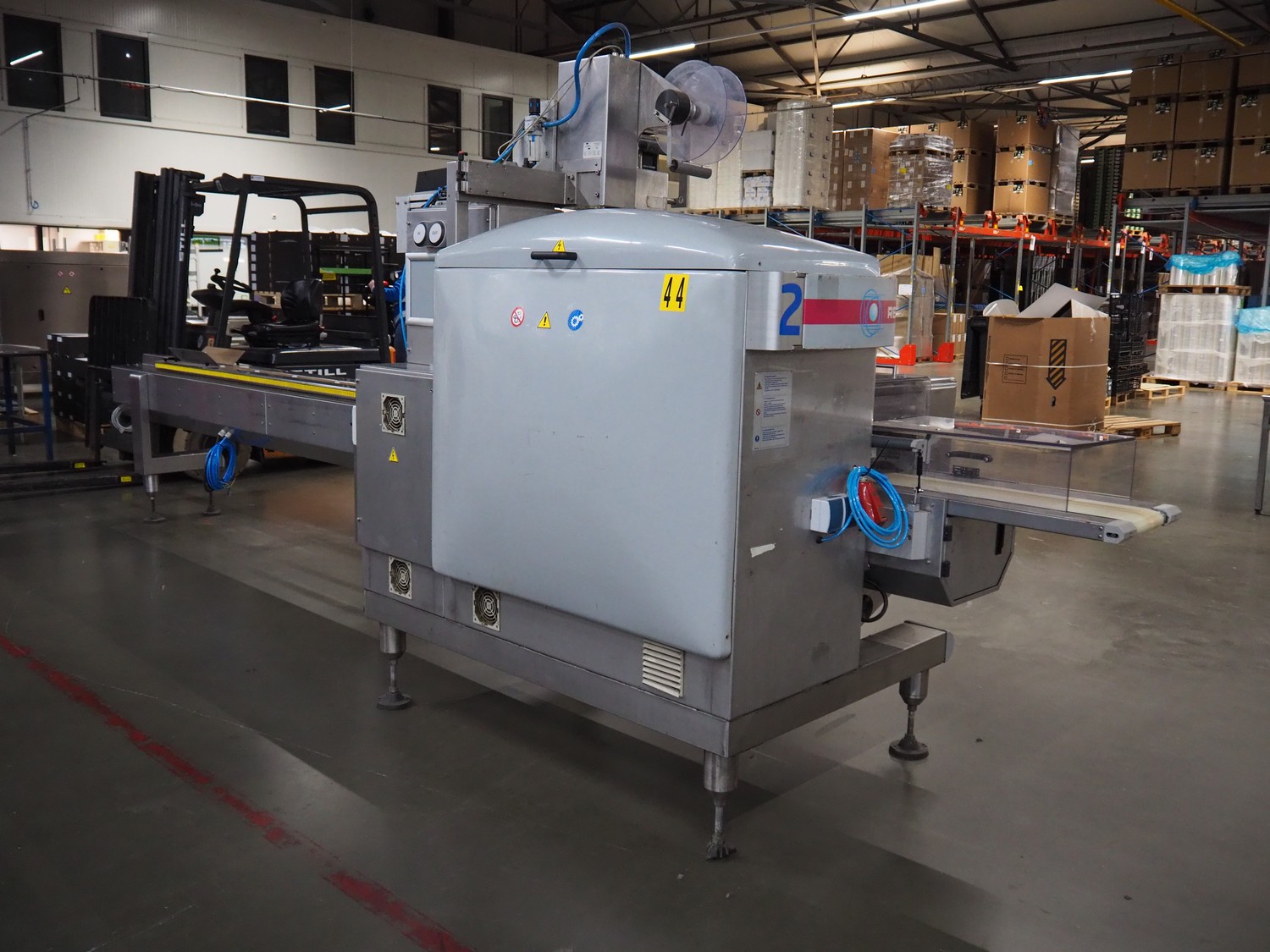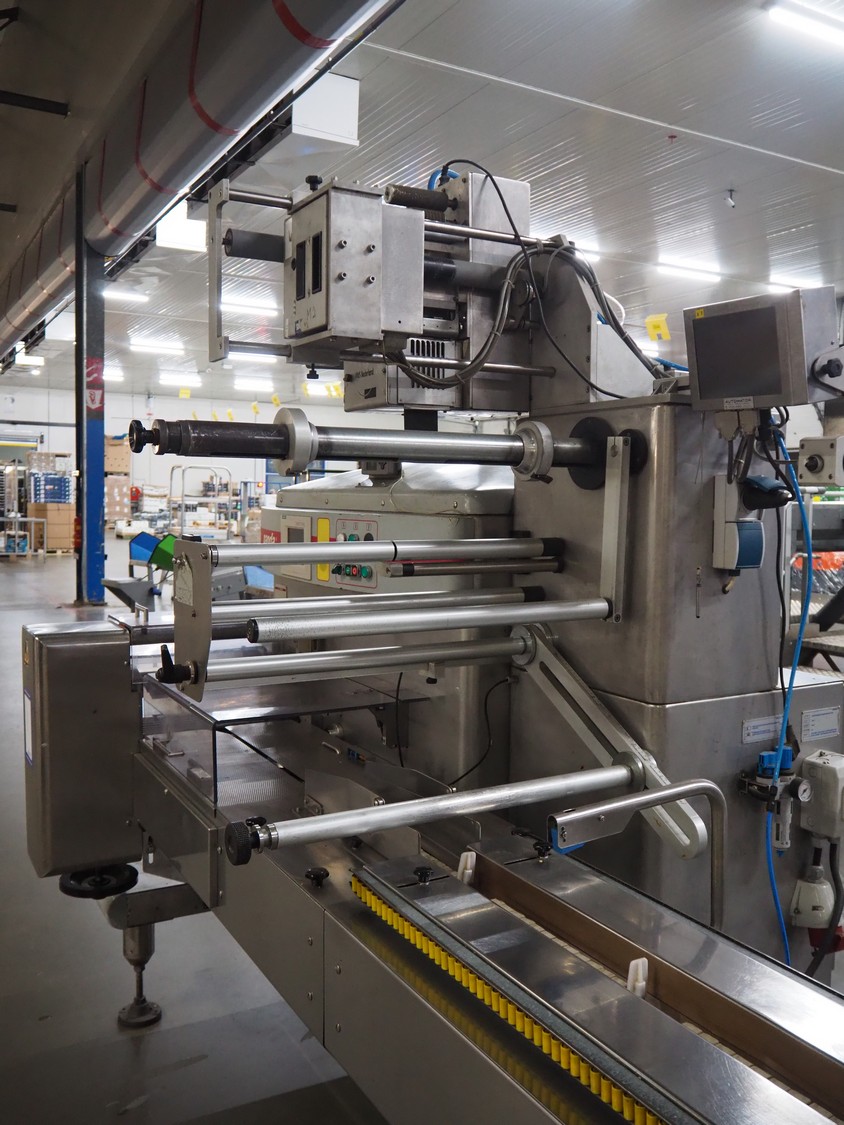 Record flowpacker with VWS Nederland B.V. labelling unit, type: PANDA.MD ST., serial number: 15-06-260, year of construction: 2007, weight: 1050 kg, distance between dividers: 410 mm, seal width: 350 mm, plastic belt, belt width: 210 mm, total dimensions: 6300 mm x 1500 mm x 2250 mm.
