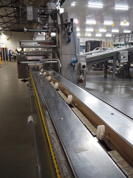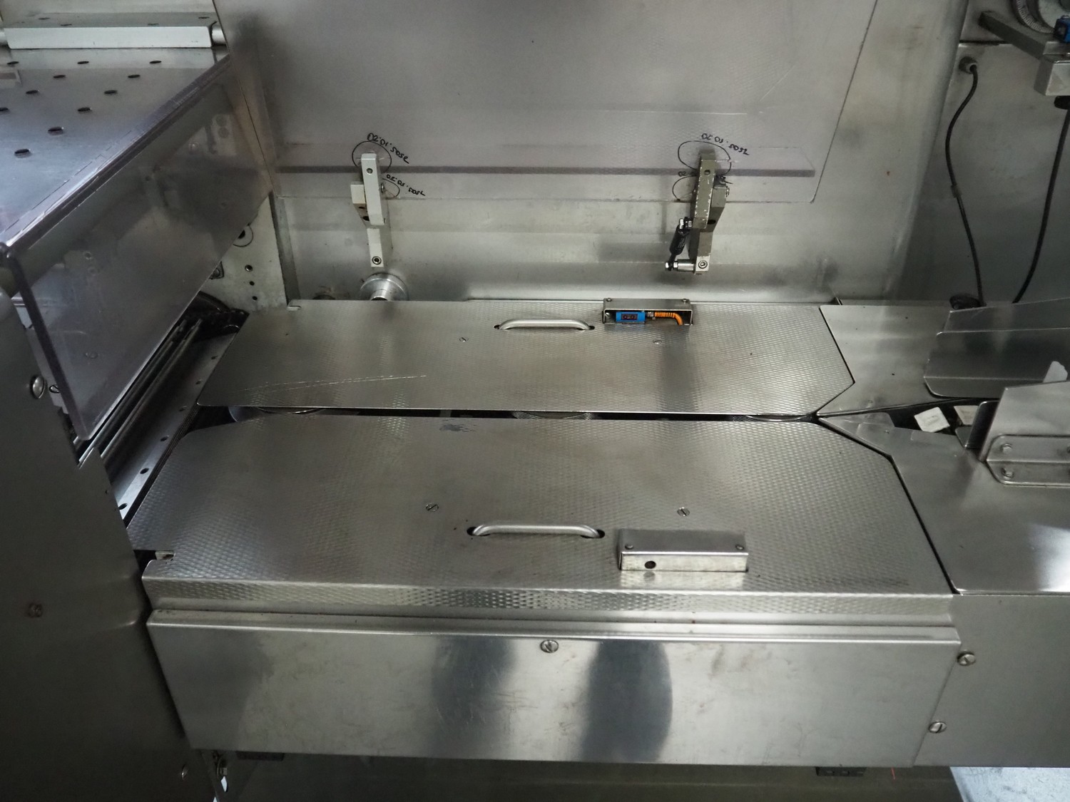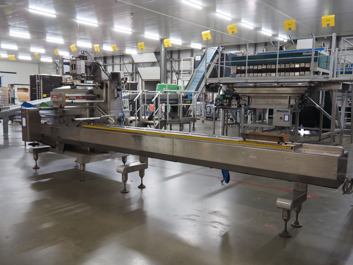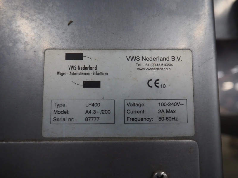 Record flowpacker with VWS Nederland B.V. labelling unit, type: PANDA.MD ST., serial number: 15-06-260, year of construction: 2007, weight: 1050 kg, distance between dividers: 410 mm, seal width: 350 mm, plastic belt, belt width: 210 mm, total dimensions: 6300 mm x 1500 mm x 2250 mm.