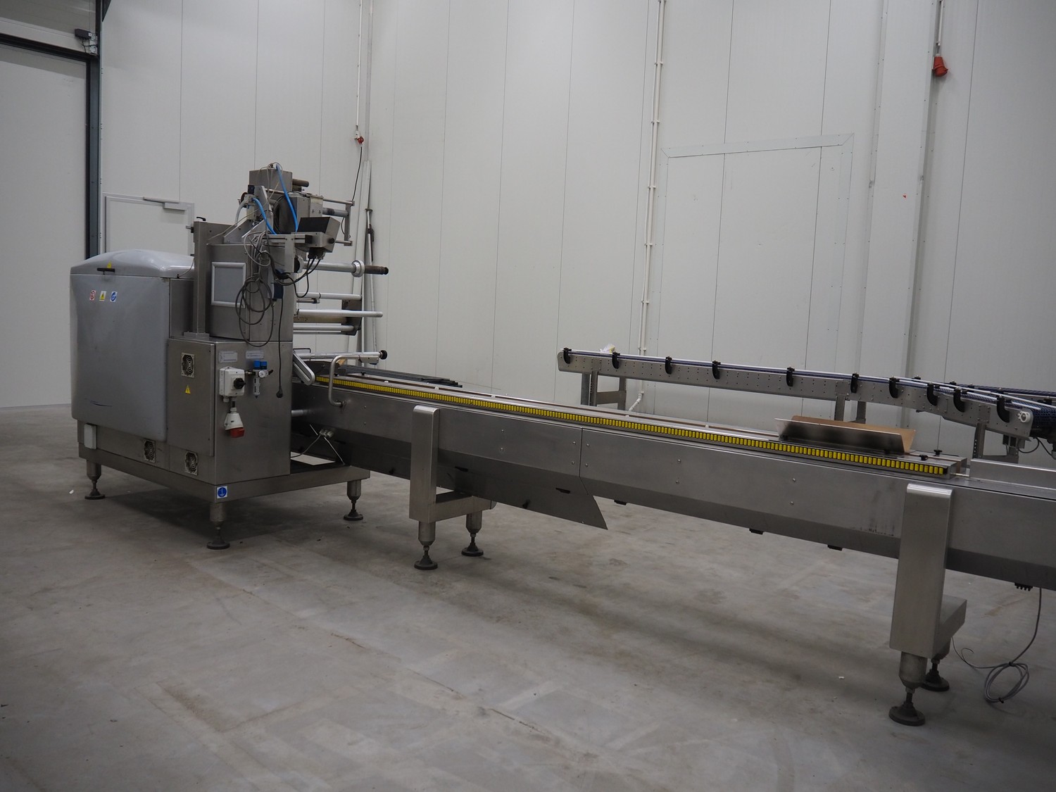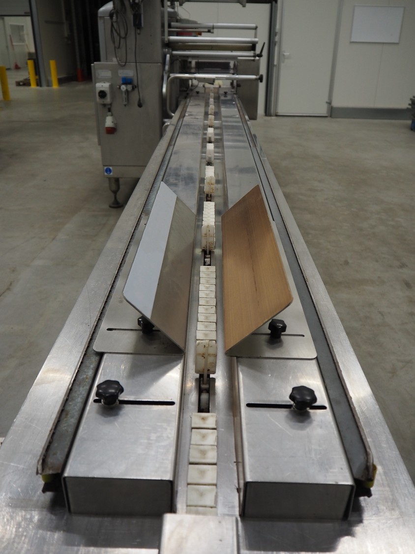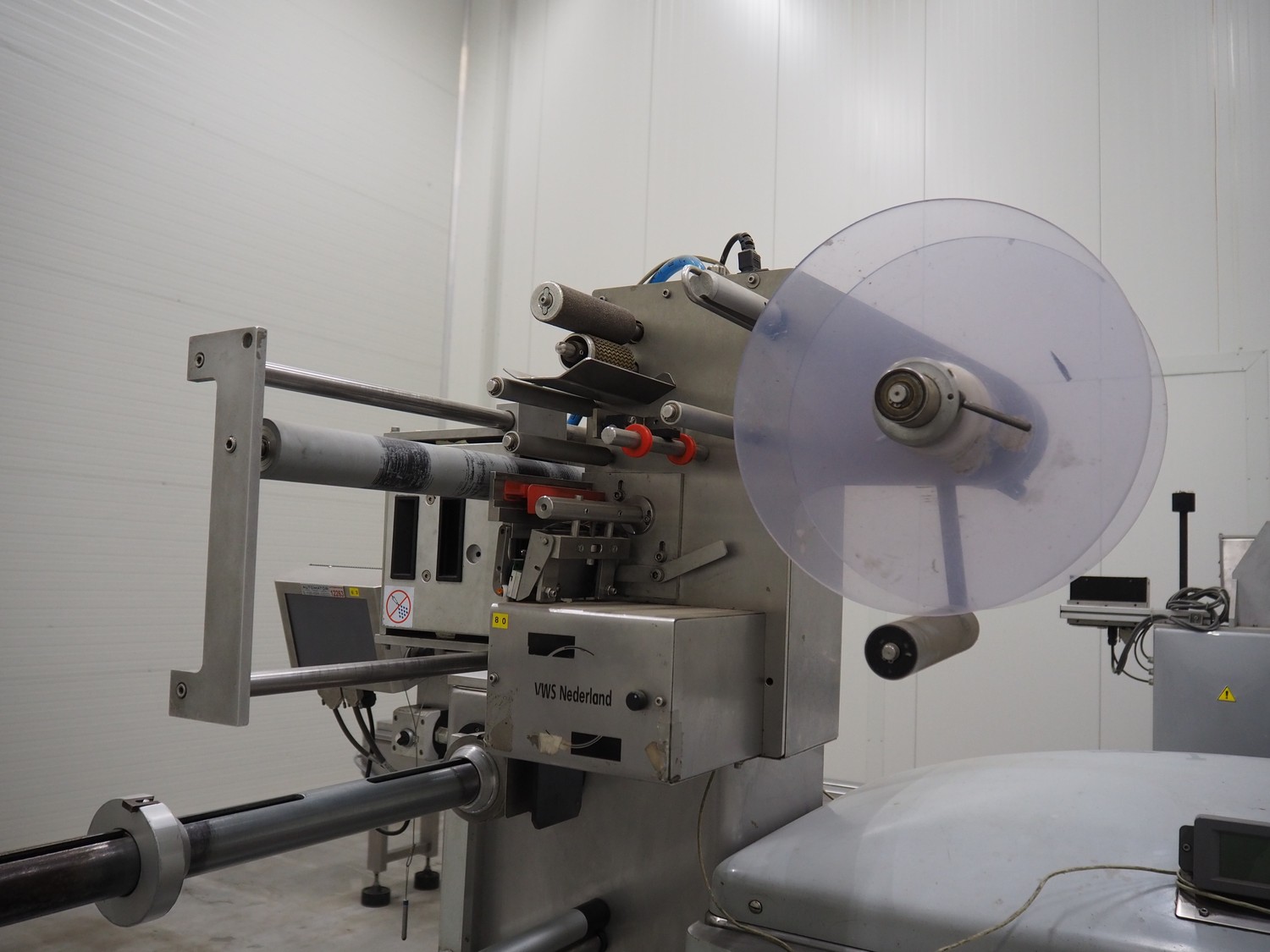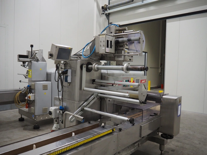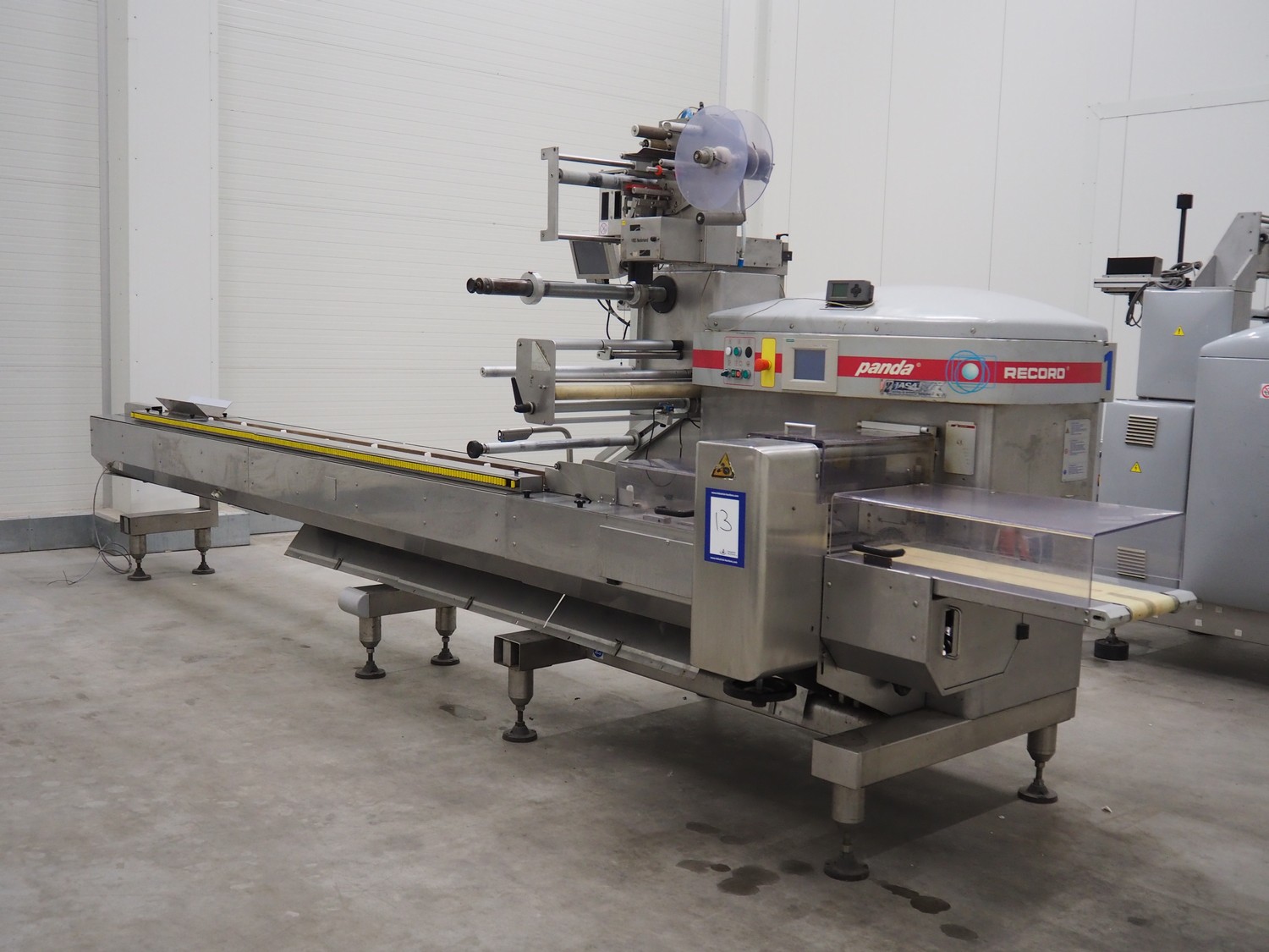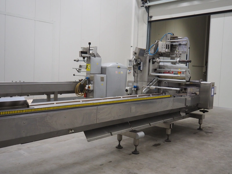 Record flowpacker with VWS Nederland B.V. labelling unit, type: PANDA.MD SP., serial number: 15-06-301, year of construction: 2007, weight: 1050 kg, distance between dividers: 410 mm, seal width: 350 mm, plastic belt, belt width: 210 mm, total dimensions: 6300 mm x 1500 mm x 2250 mm.