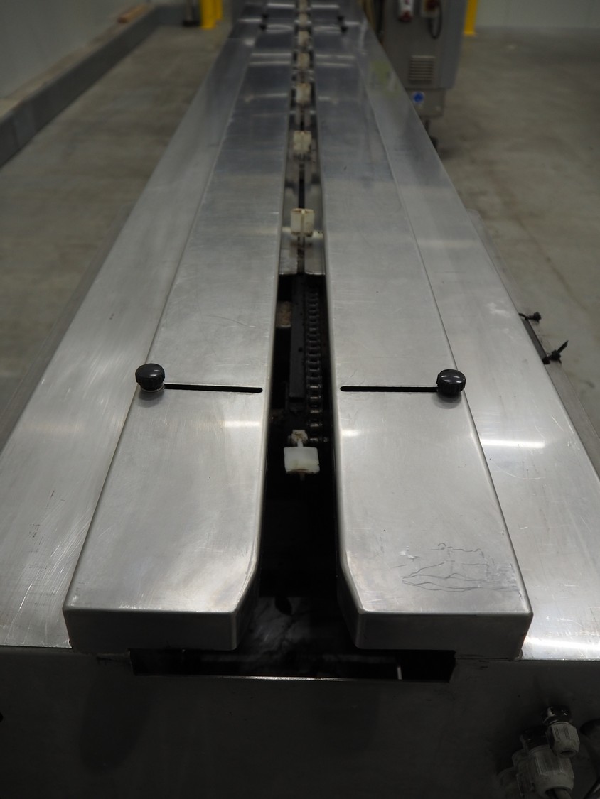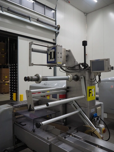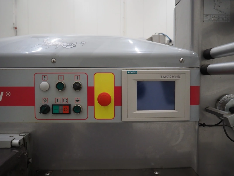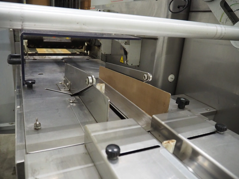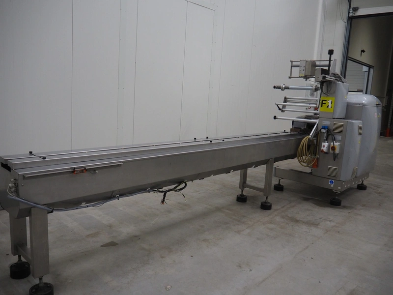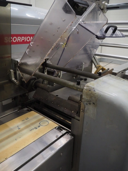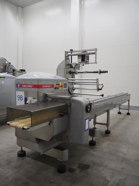 Record flowpacker, type: SCORPION E S., serial number: 09-06-612, year of construction: 2007, weight: 950 kg, 5 kW, distance between dividers: 300 mm, seal width: 350 mm, plastic belt, belt width: 210 mm, total dimensions: 6300 mm x 1500 mm x 2250 mm.
