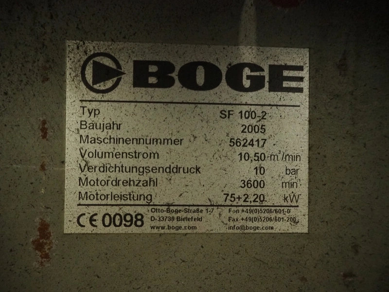 Boge air compressor, type: SF 100-2, machine number: 562417, year of construction: 2005, volume: 10.5 m³ per hour, dimensions: 2250 mm x 1250 mm x 1450 mm.