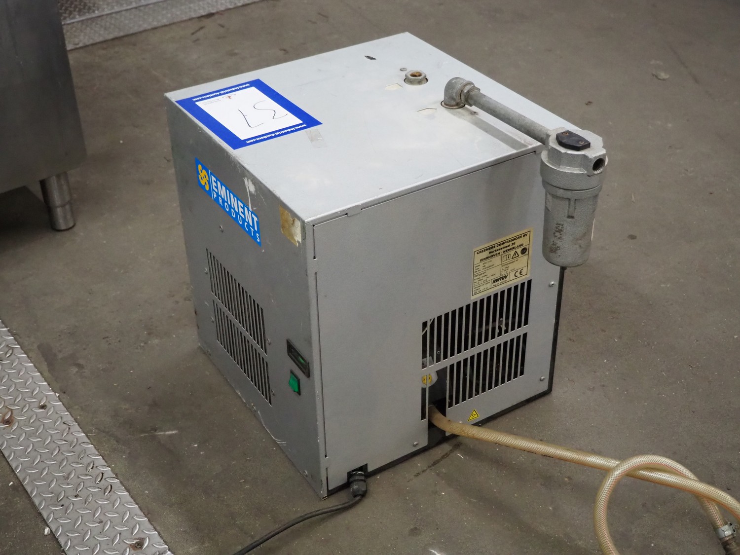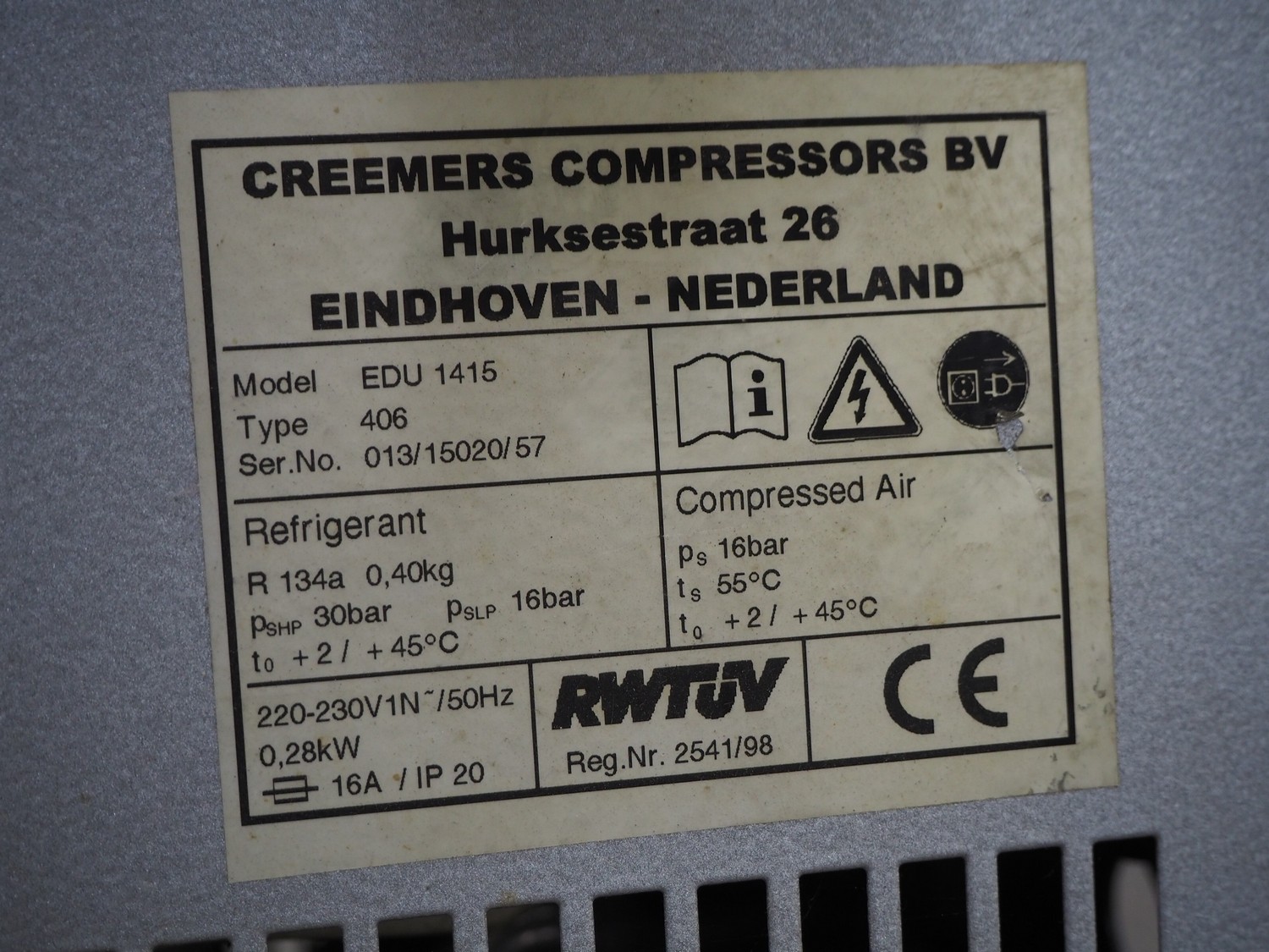 Creemers Compressors BV air compressor with air dryer, model: EDU 1415, type: 406, serial number: 013/15020/57, refrigerant: R134a, 220-230 V, 1 Ph, 50 Hz, 0.28 kW, dimensions: 580 mm x 450 mm x 550 mm.