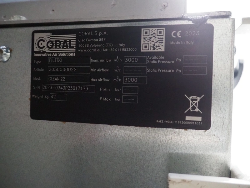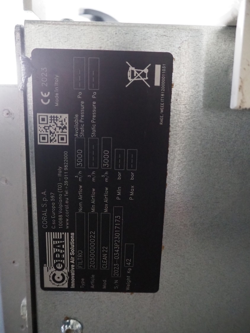 Coral S.p.A. filter, type: FILTRO, model: CLEAN 22, serial number: 2023-0343P23017173, year of construction: 2023, weight: 42 kg, dimensions: 1550 mm x 700 mm x 850 mm.