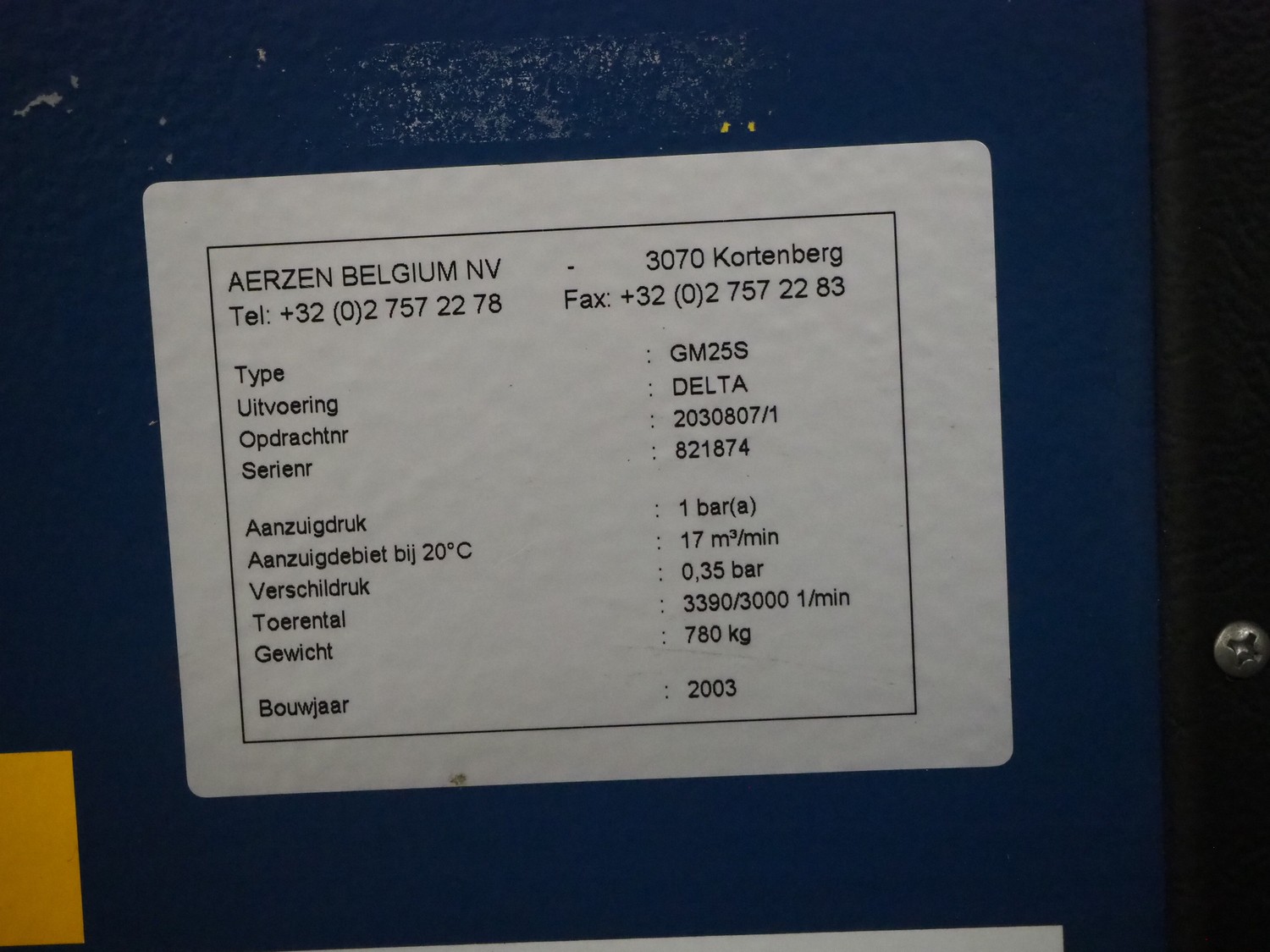 Aerzen blower, type: GM25S, serial number: 821874, year of construction: 2003, weight: 780 kg, dimensions: 1550 mm x 1300 mm x 1600 mm.