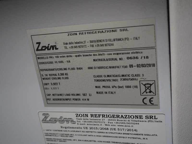 Zoin Refrigerazione Srl mobile refrigerated showcase, model: HILL 100, serial number: 0636/18, year of construction: 2018, 230 V, 50 Hz, refrigerant: R404/0.300 kg, dimensions: 1070 mm x 800 mm x 1300 mm.