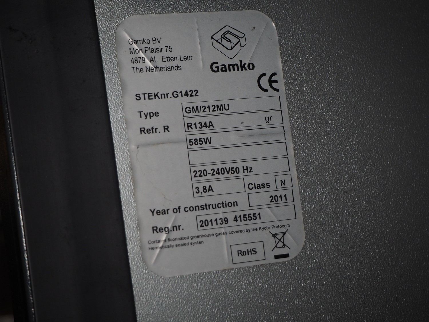 Gamko refrigerated cabinet, type: GM/212MU, year of construction: 2011, 220-240 V, 50 Hz, 3.8 A, refrigerant: R134A, dimensions: 1700 mm x 580 mm x 860 mm.