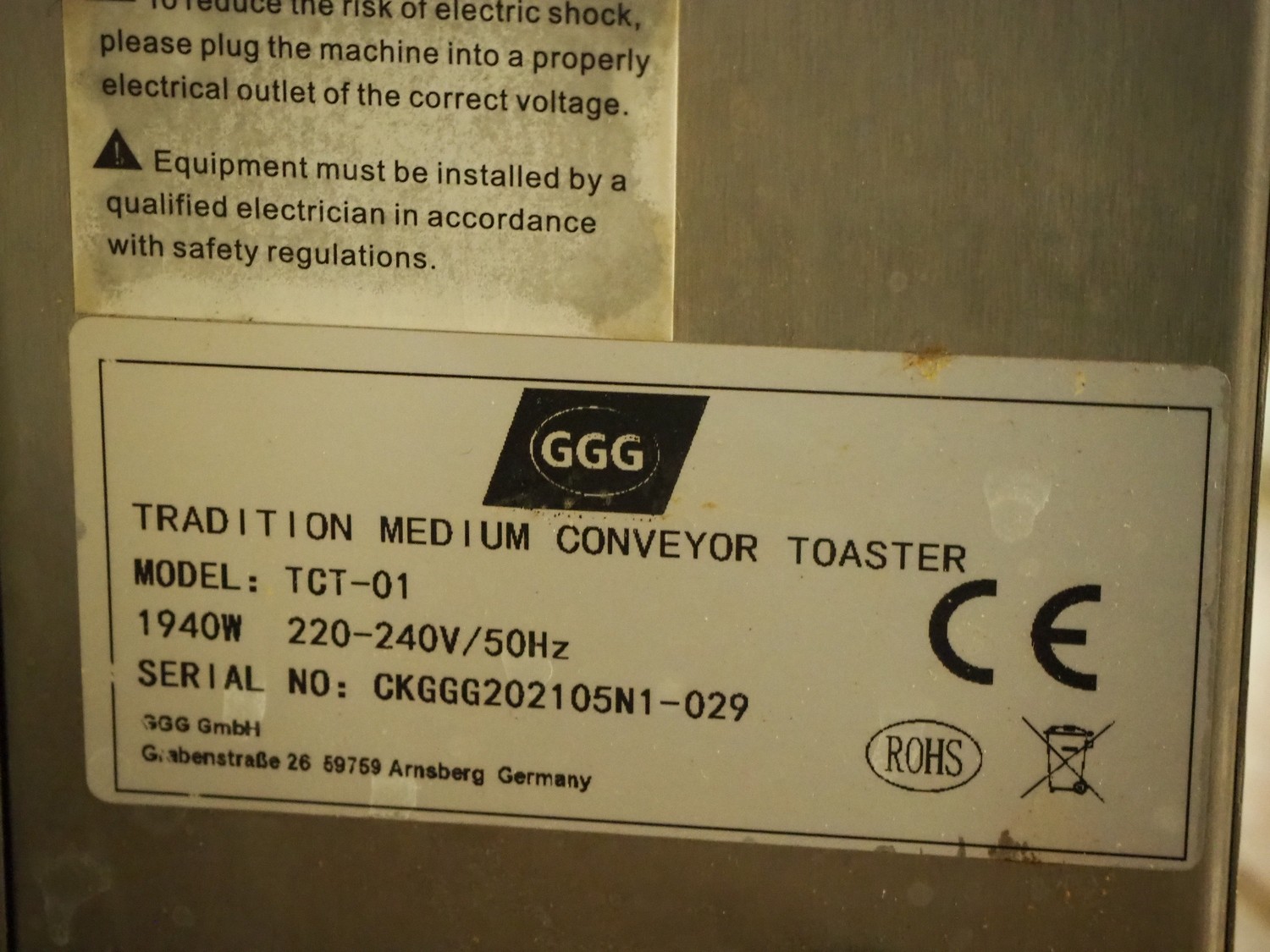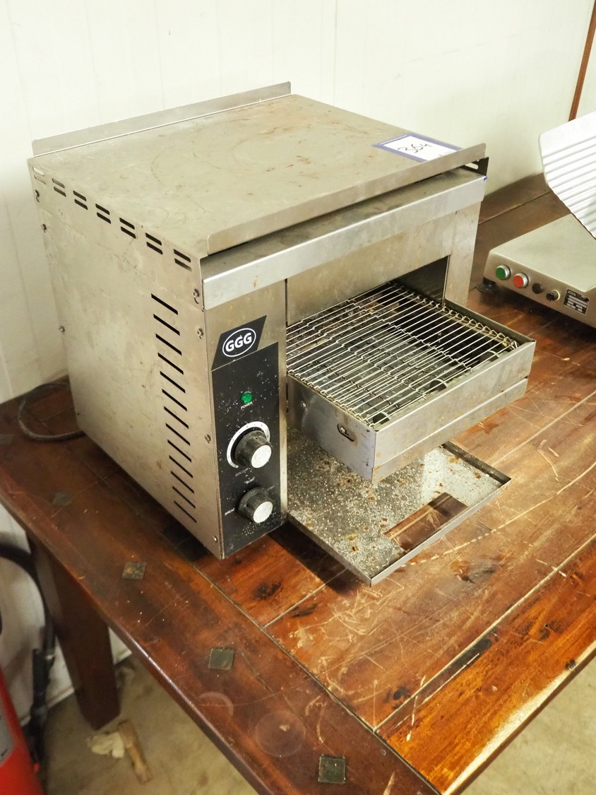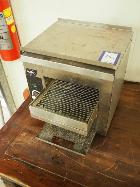 GGG conveyor toaster, model: TCT-01, serial number: CKGGG202105N1-029, 220-240 V, 50 Hz, 1940 W, s/s mesh belt, belt width: 250 mm, total dimensions: 520 mm x 440 mm x 420 mm.