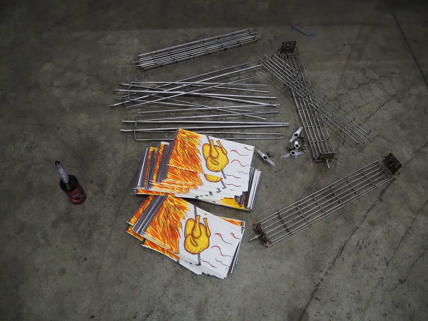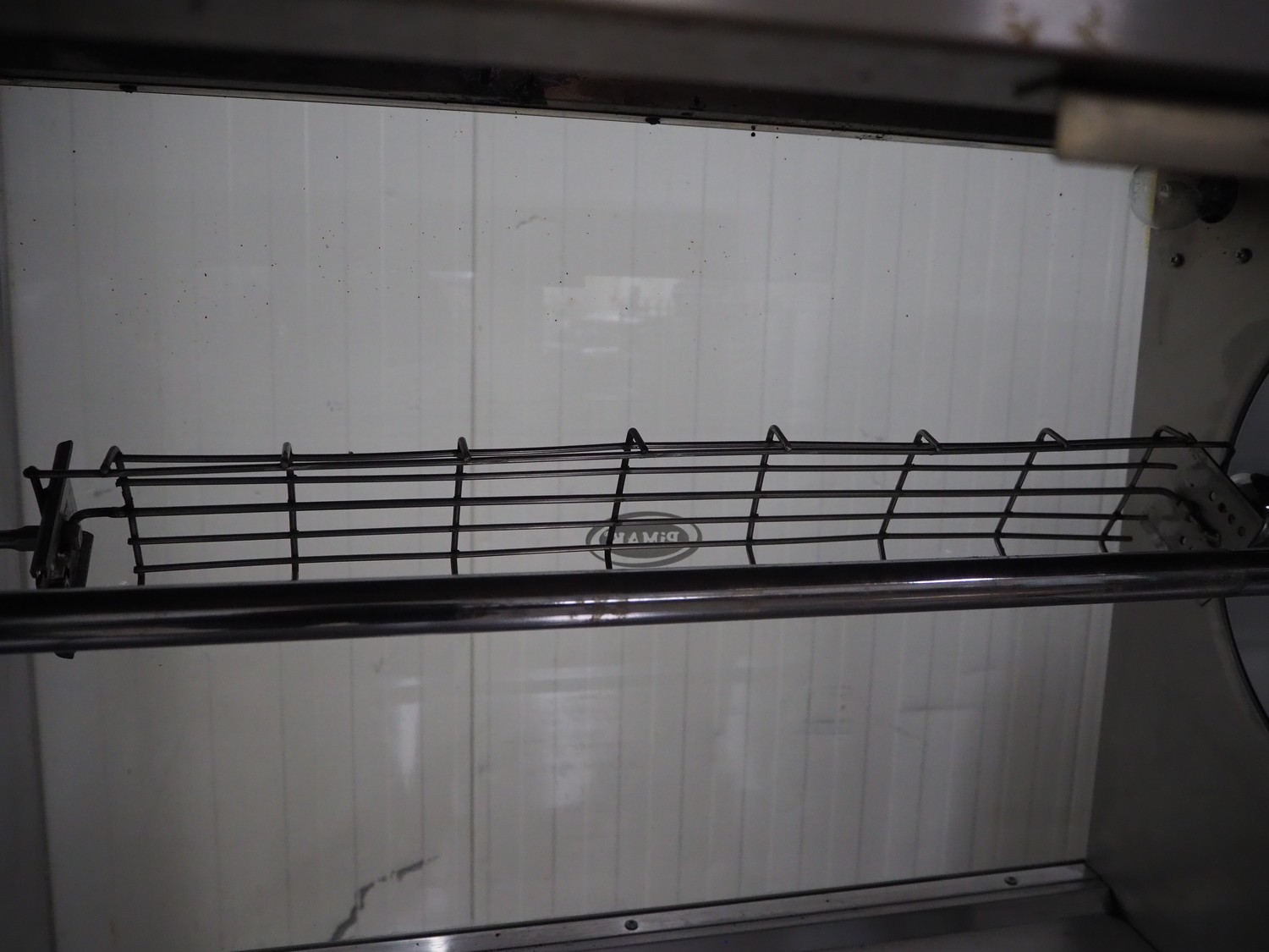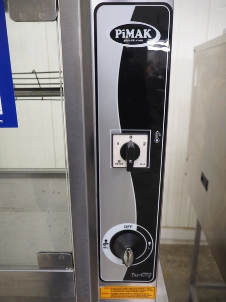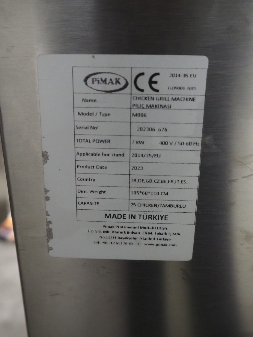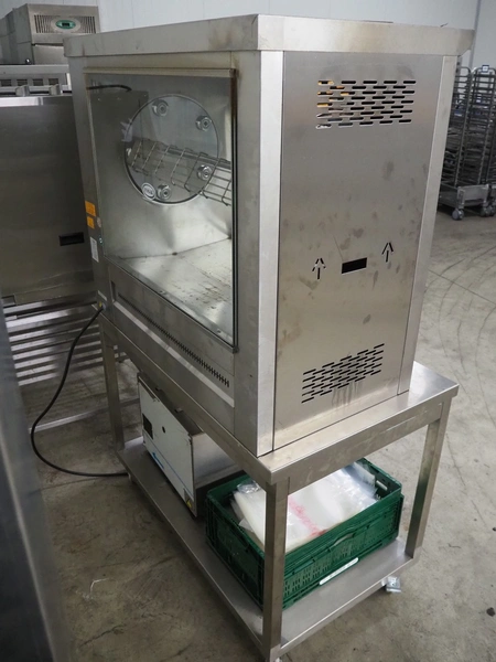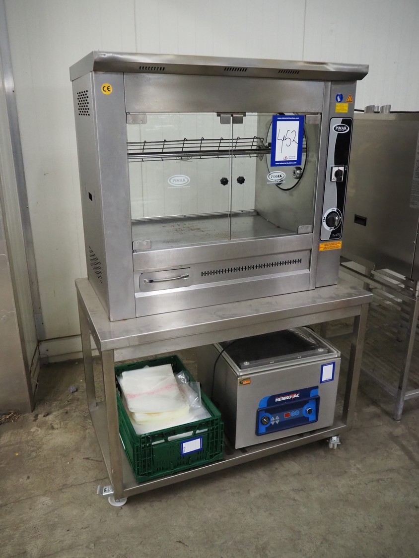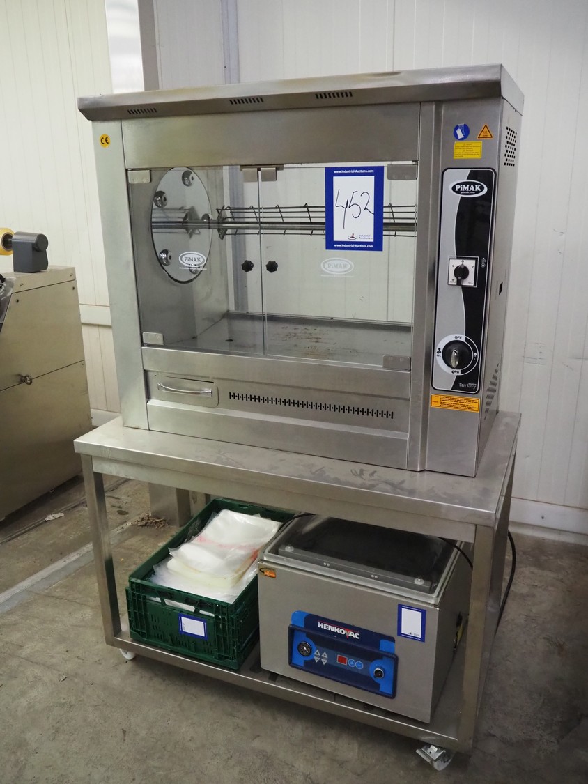 Pimak chicken grill on mobile table, model: M006, year of construction: 2023, 400 V, 50/60 Hz, 7 kW, dimensions table: 1200 mm x 700 mm x 850 mm, dimensions grill: 1070 mm x 610 mm x 940 mm. Vacuum machine and crate not included.