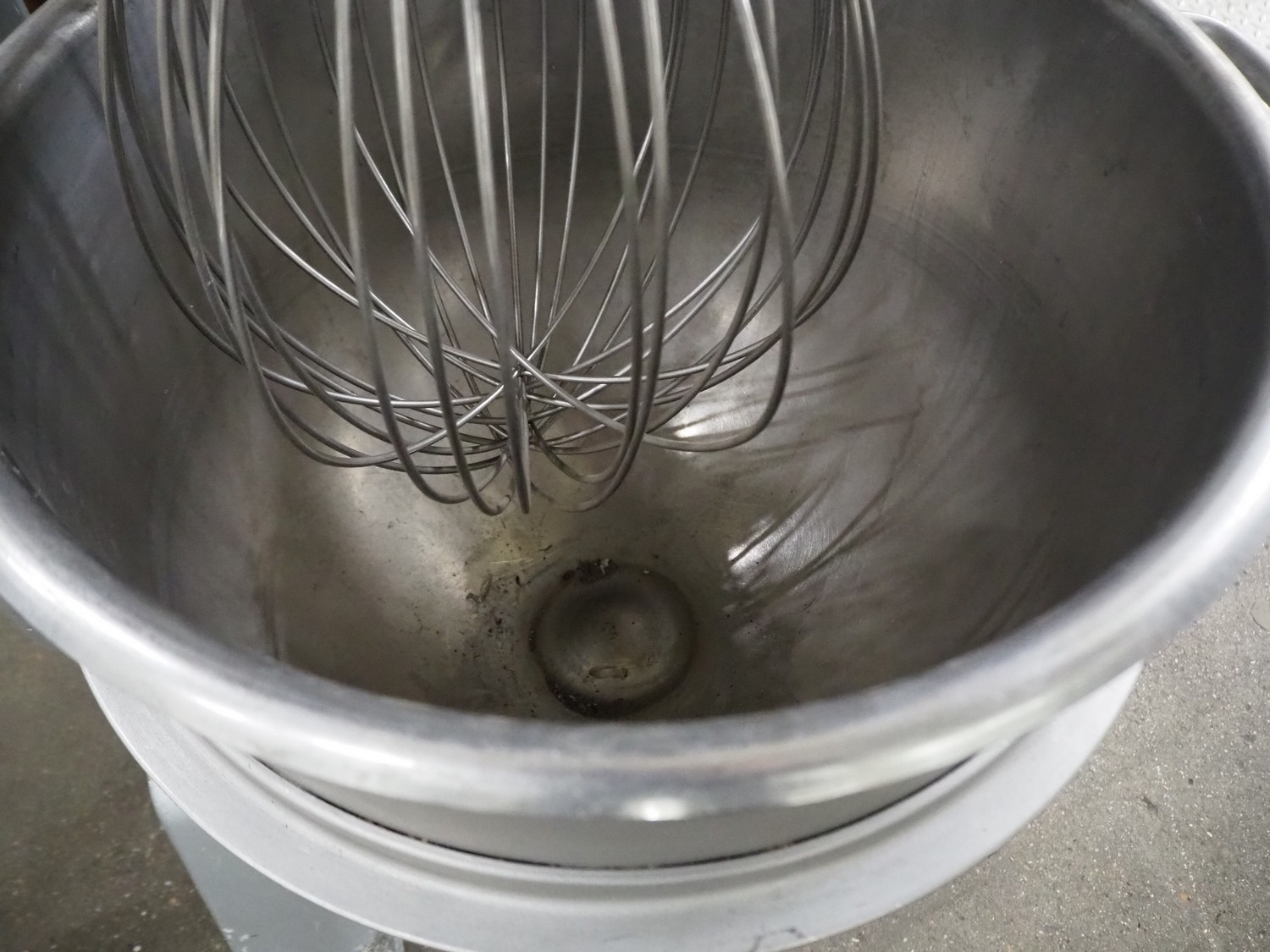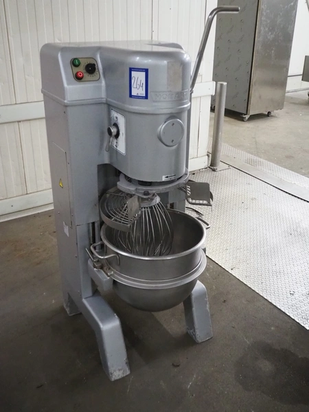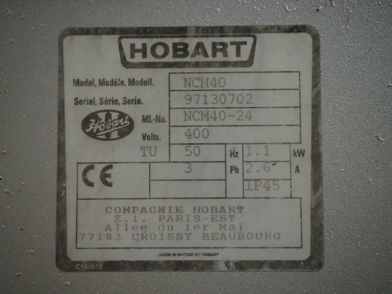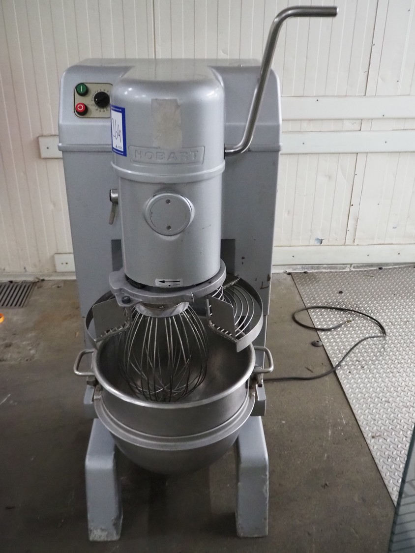 Hobart mixer, model: NCM40, serial number: 97130702, 400 V, 3 Ph, 50 Hz, 2.6 A, 1.1 kW, volume: 40 liter, total dimensions: 700 mm x 560 mm x 1460 mm. Including whisk and mixing arm.